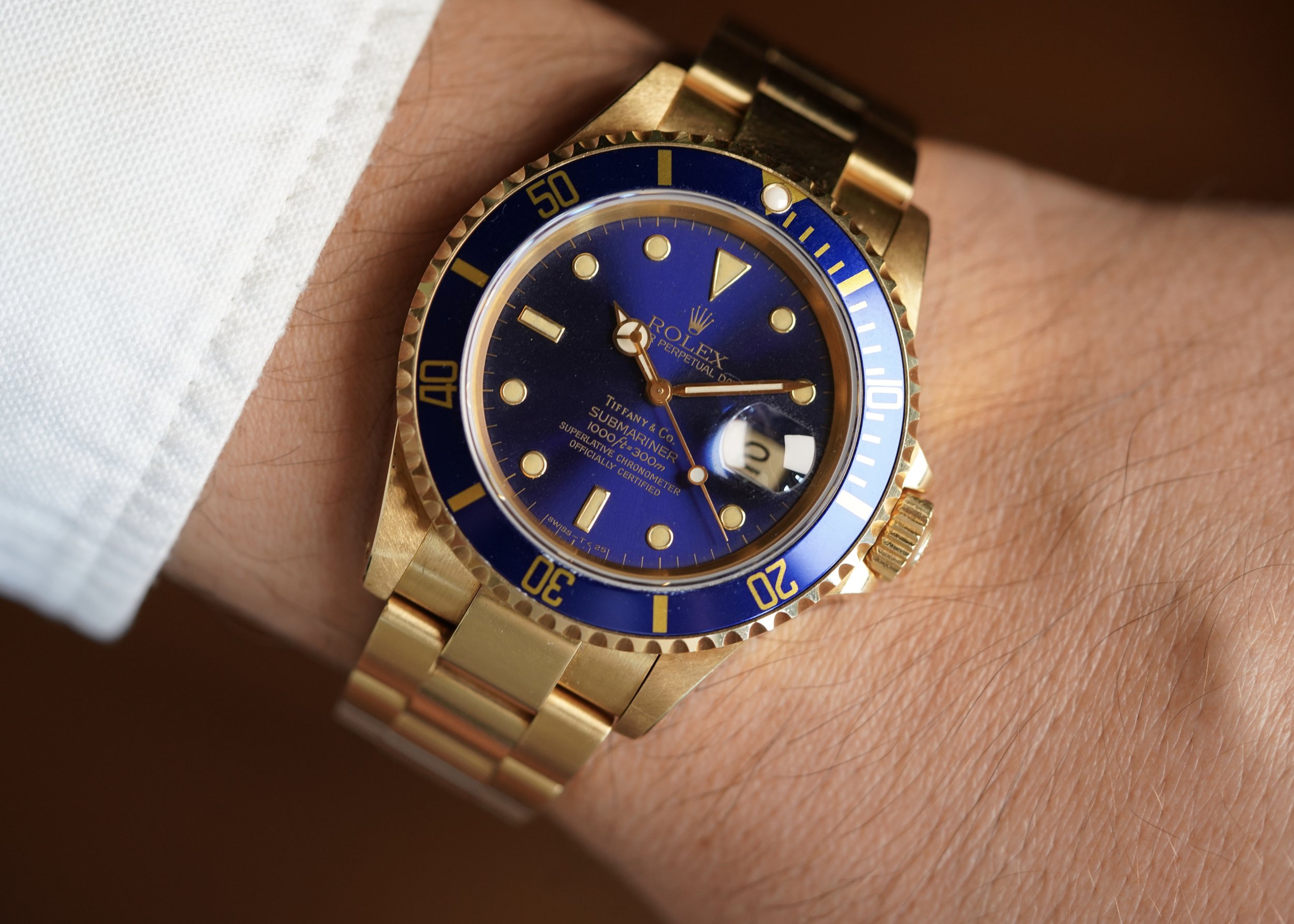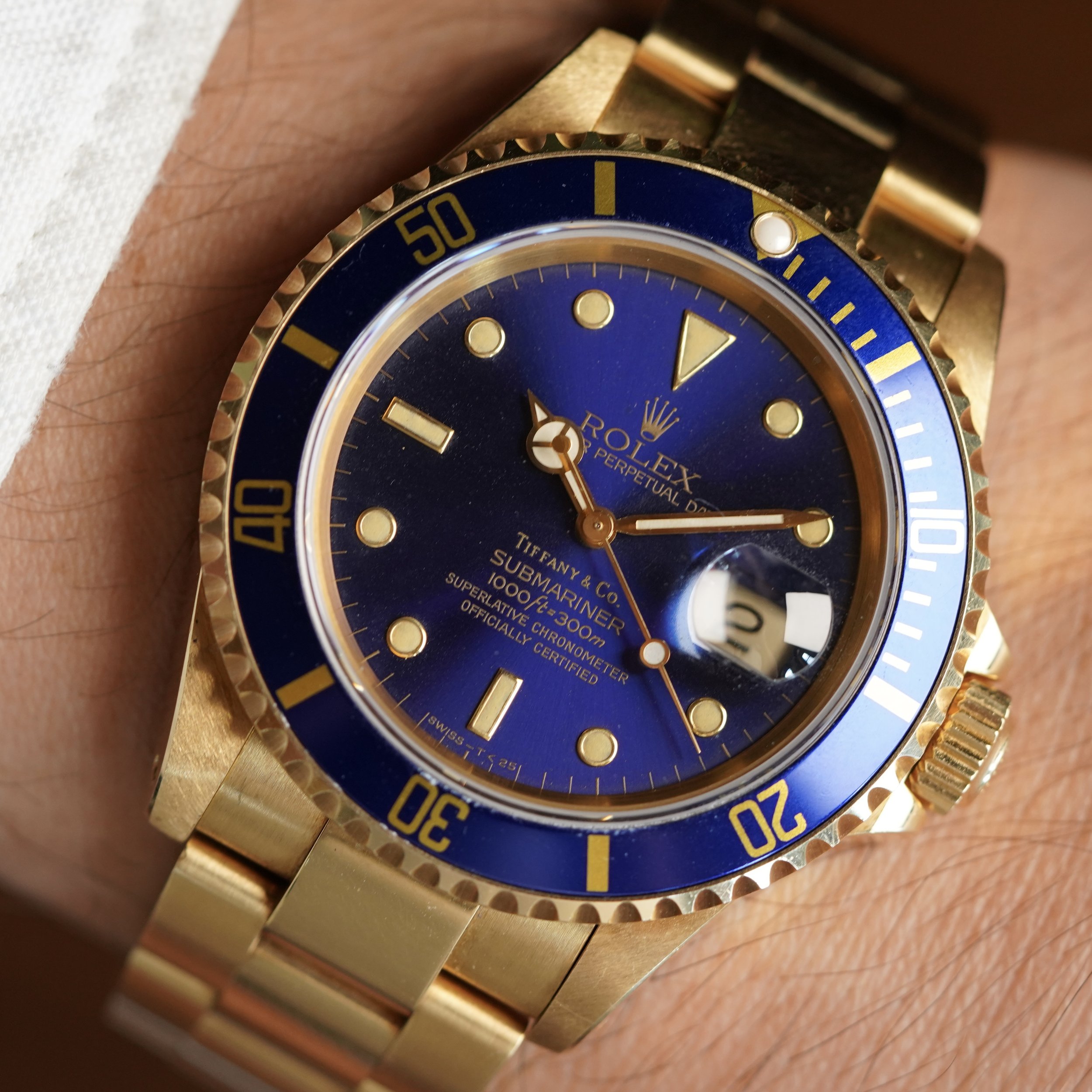 Rolex Tiffany & Co. Submariner Reference 16618 in 18K Gold w/ Blue/Purple Dial Unpolished