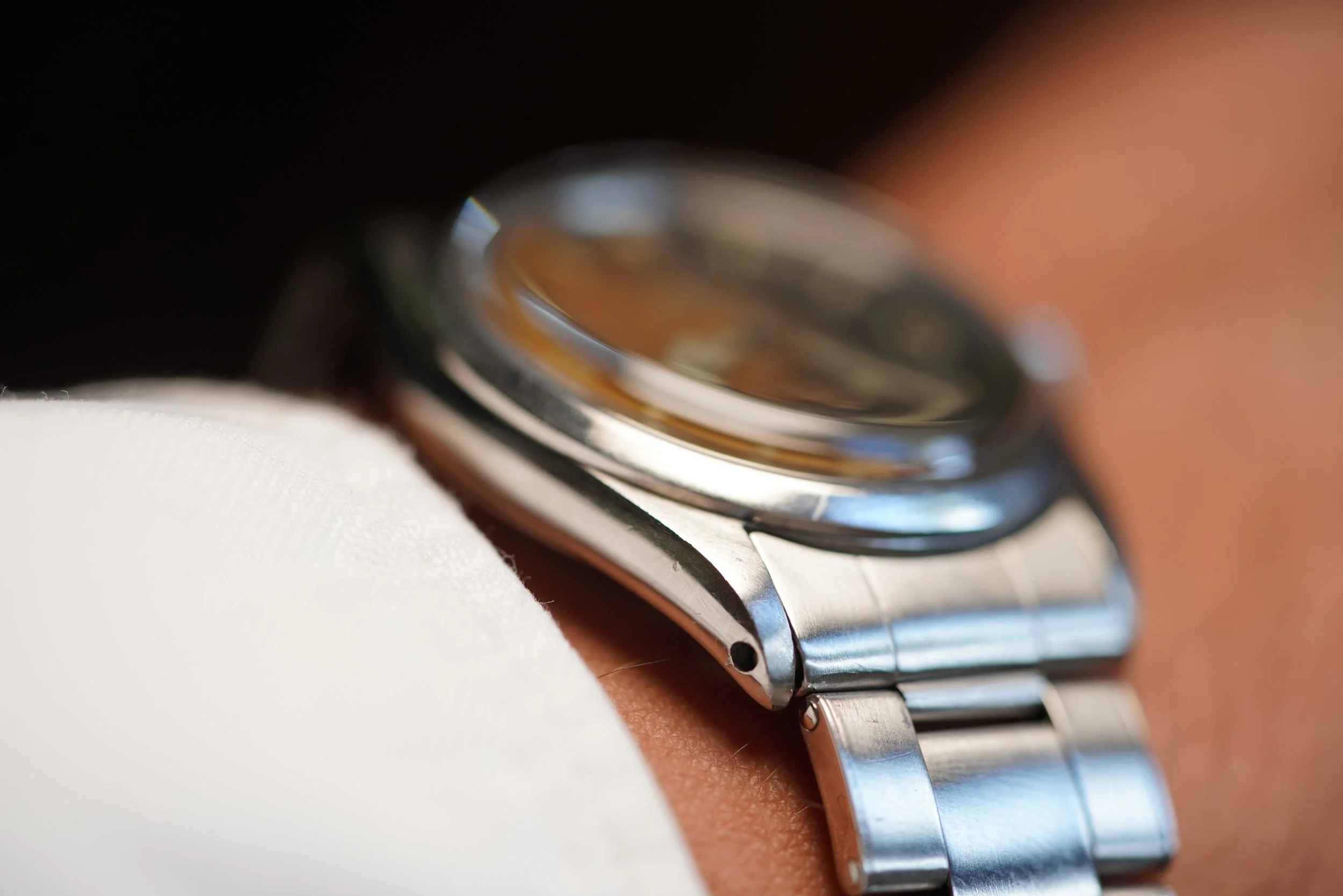 Introduced in 1960 an icon was born in the Rolex Explorer reference 1016. It was produced until circa 1989. This example is one of those special Explorer 1016s, as it features an awesome tropical dial. It features a 1.50M serial dating it to circa 1966 making it a late gilt dial. The case is lightly polished but strong. It measures 36mm in diameter (43mm lug-to-lug). It is paired on a 7206 Rivet bracelet by Rolex with correct 58 end links dating to 1965.