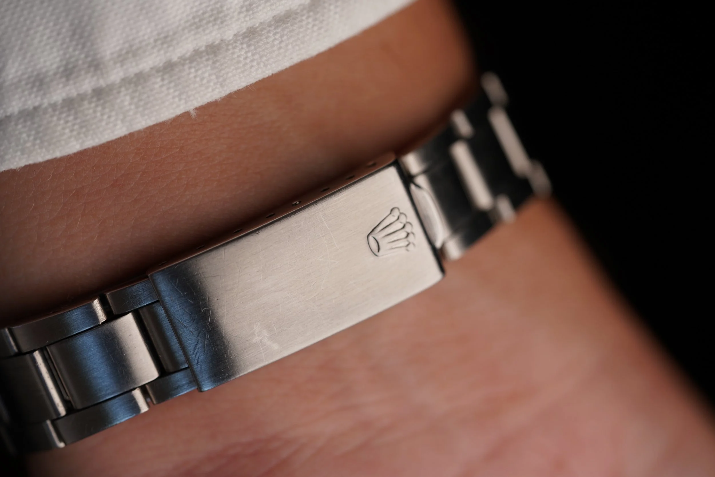 It features the correct Mark II screw-down pushers. It is paired on a folded Oyster bracelet dating to 1971. The case appears to be unpolished. It features what appears to be the original acrylic bezel, which is in great condition.