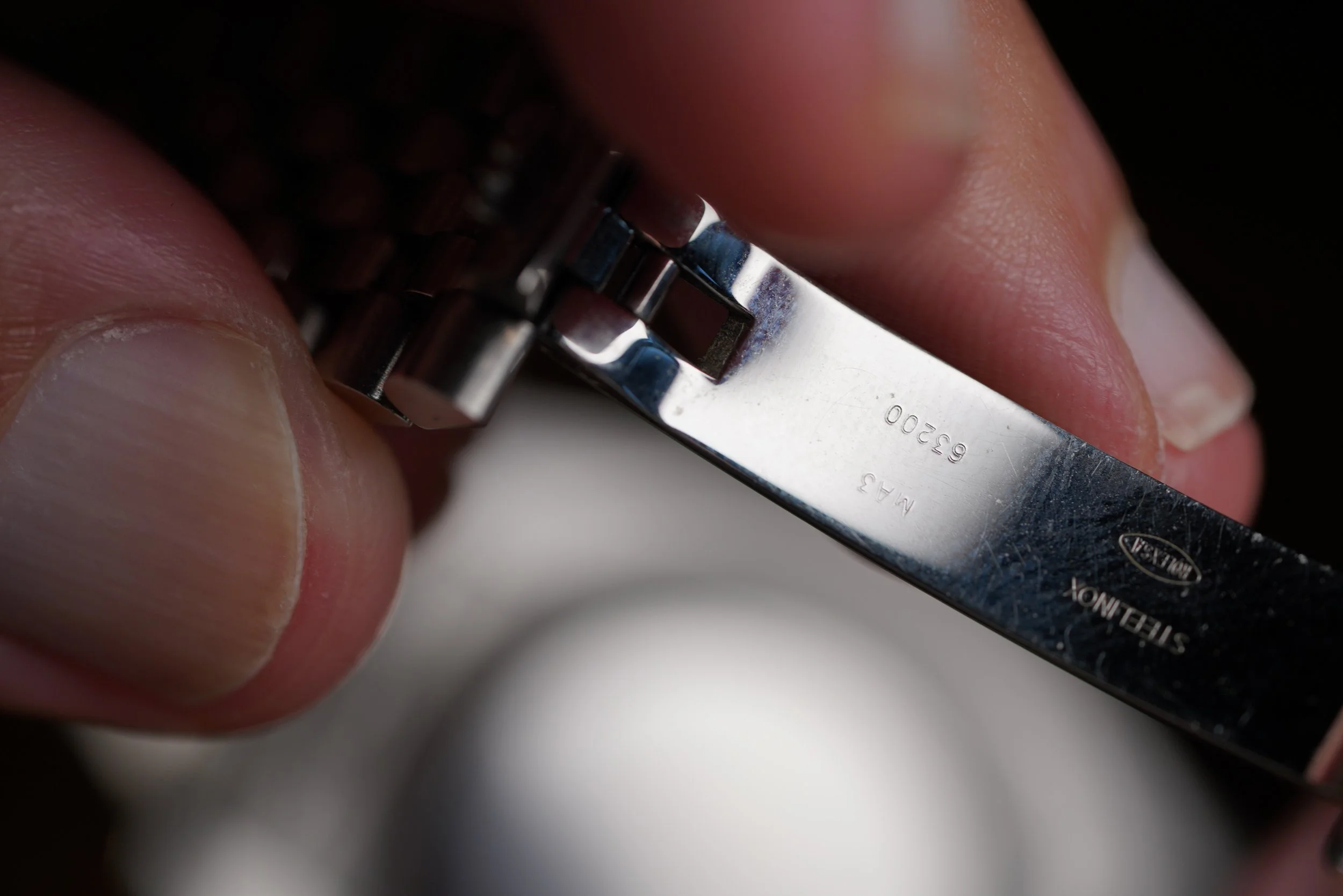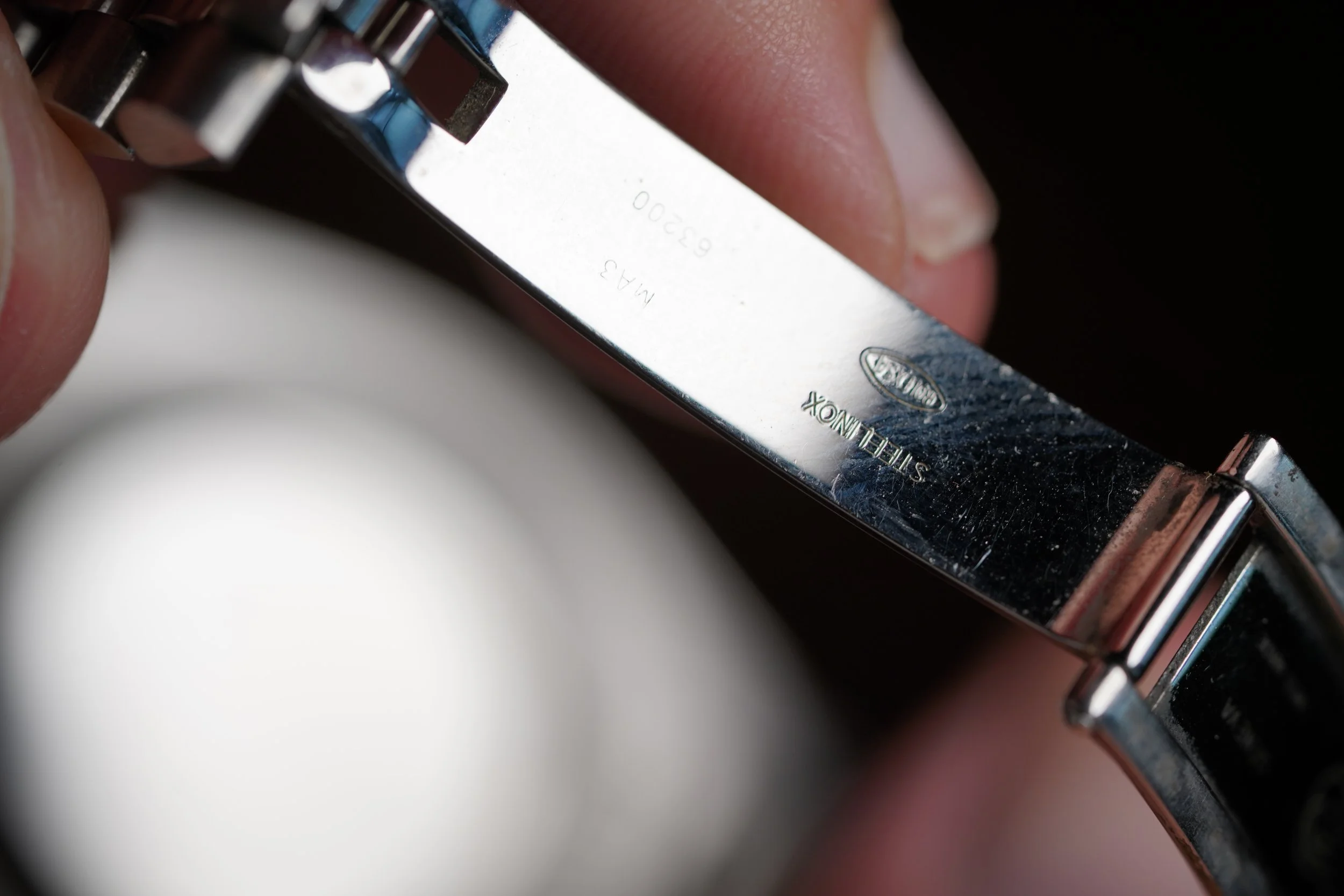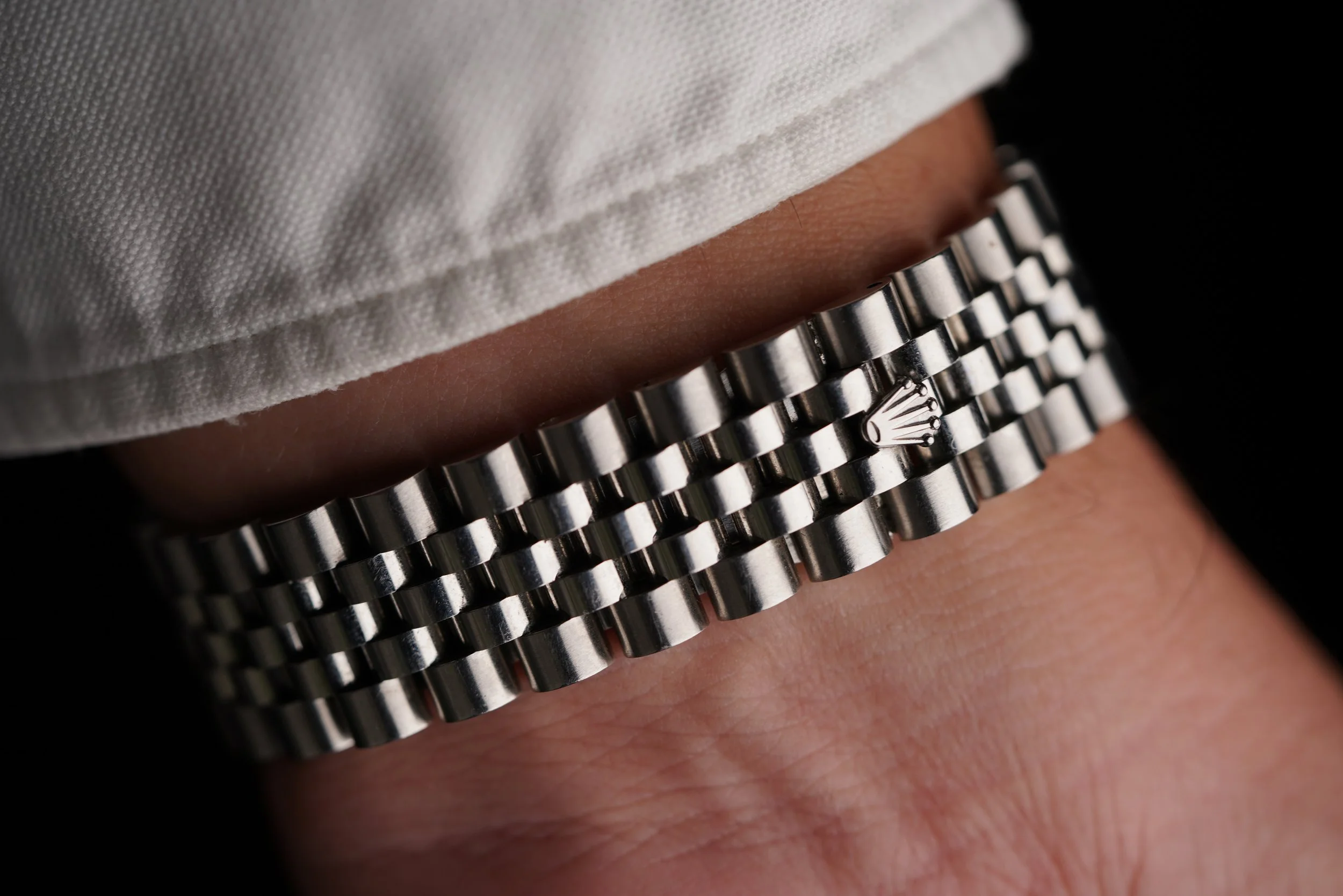 This Rolex Turn-O-Graph reference 116264 is a practical and very beautiful watch. This example features a blue dial, red seconds hand, and red date wheel. The bezel is an unusual fluted bezel presumably made of white gold with 10-minute demarcations. The watch dates to circa 2005-2006 and was sent to Venezuela. The case and bezel have been lightly polished in the past. It is on the original “Super-Jubilee” bracelet with hidden clasp.