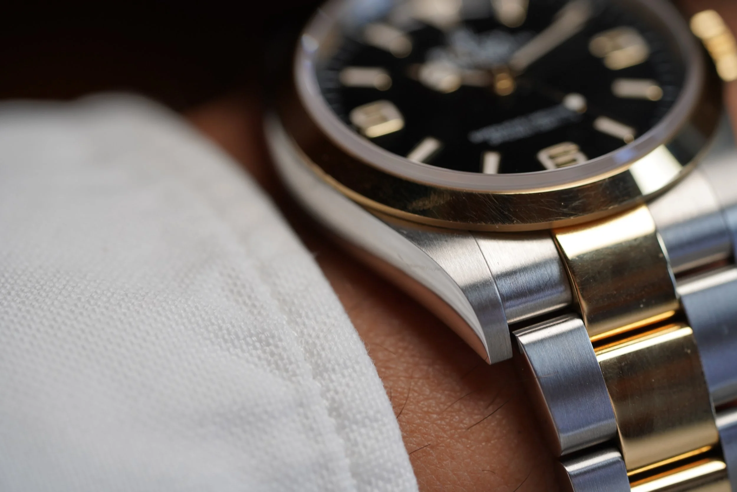 The two-tone Rolex Explorer reference 124273 is a fantastic modern sports watch. The case is 36mm in diameter (43mm lug-to-lug). This particular example is unpolished. The watch comes from the original owner.