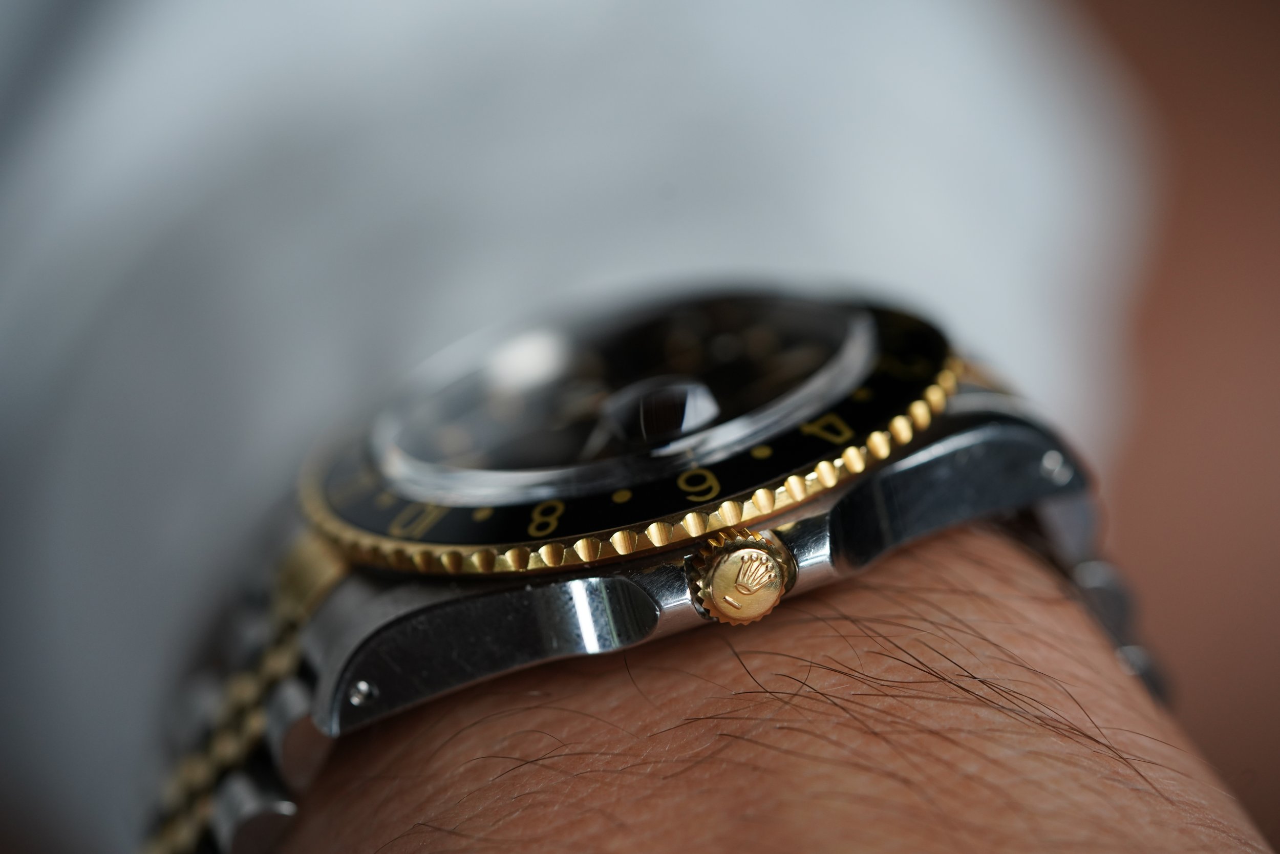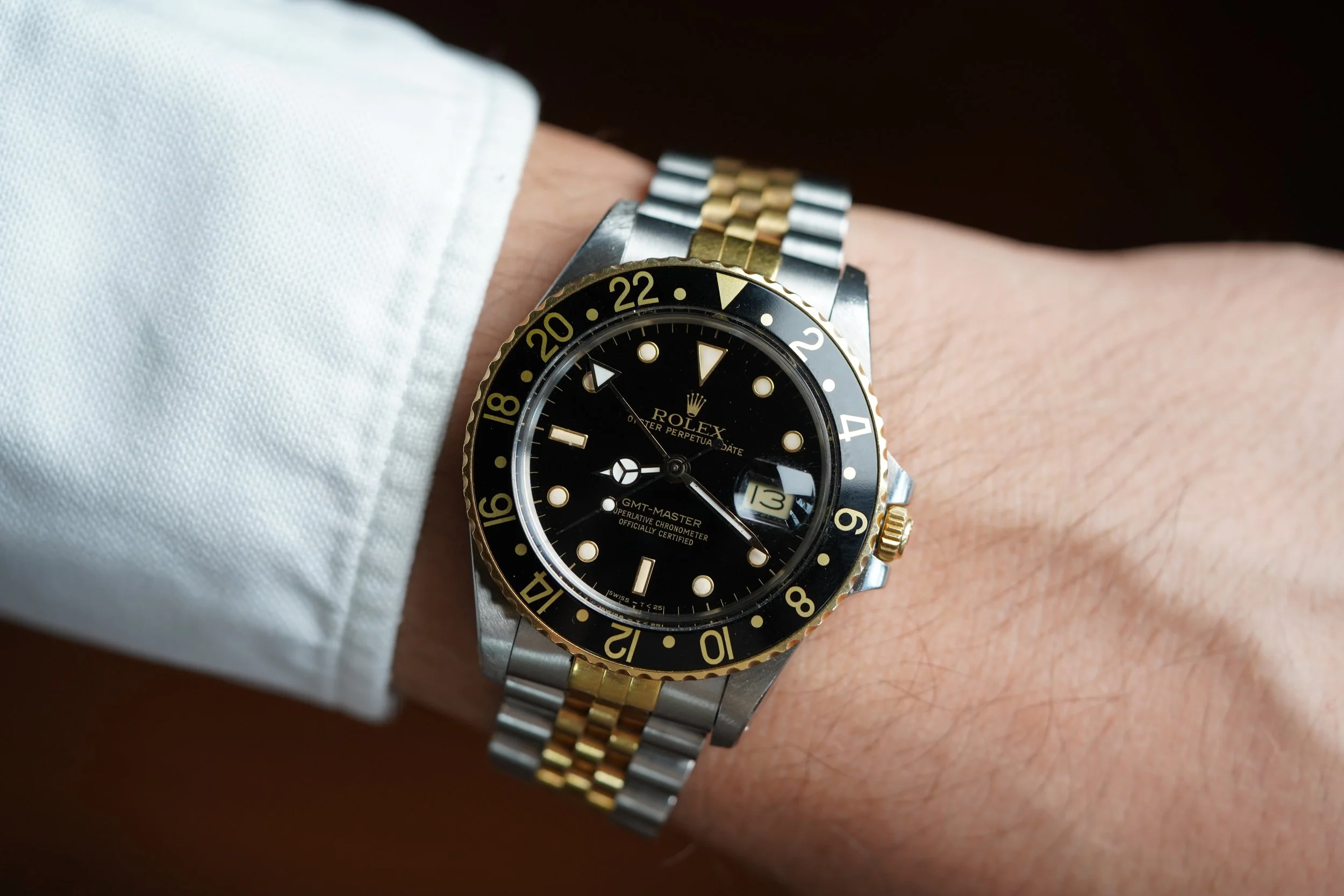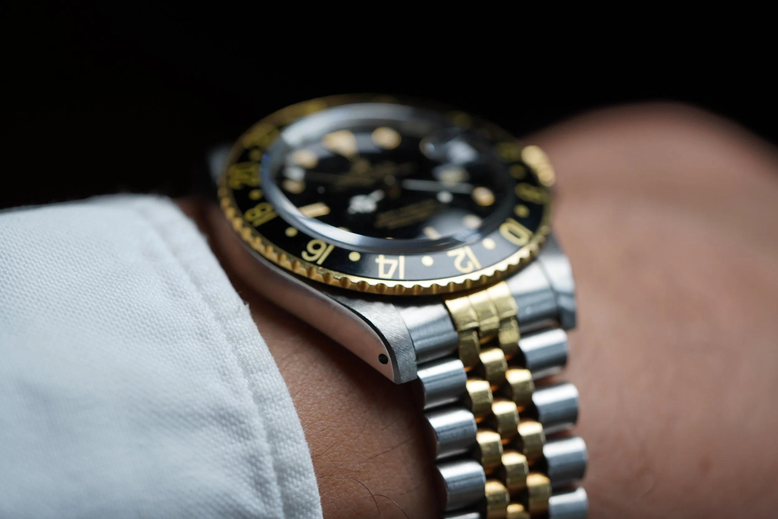 This Rolex two-tone GMT-Master reference 16753 is a great watch. It dates to circa 1988 with a R67 serial. The case has been polished in the past. It is paired on an Jubilee Rolex bracelet, which is very firm with K11 date code dating to 1986.
