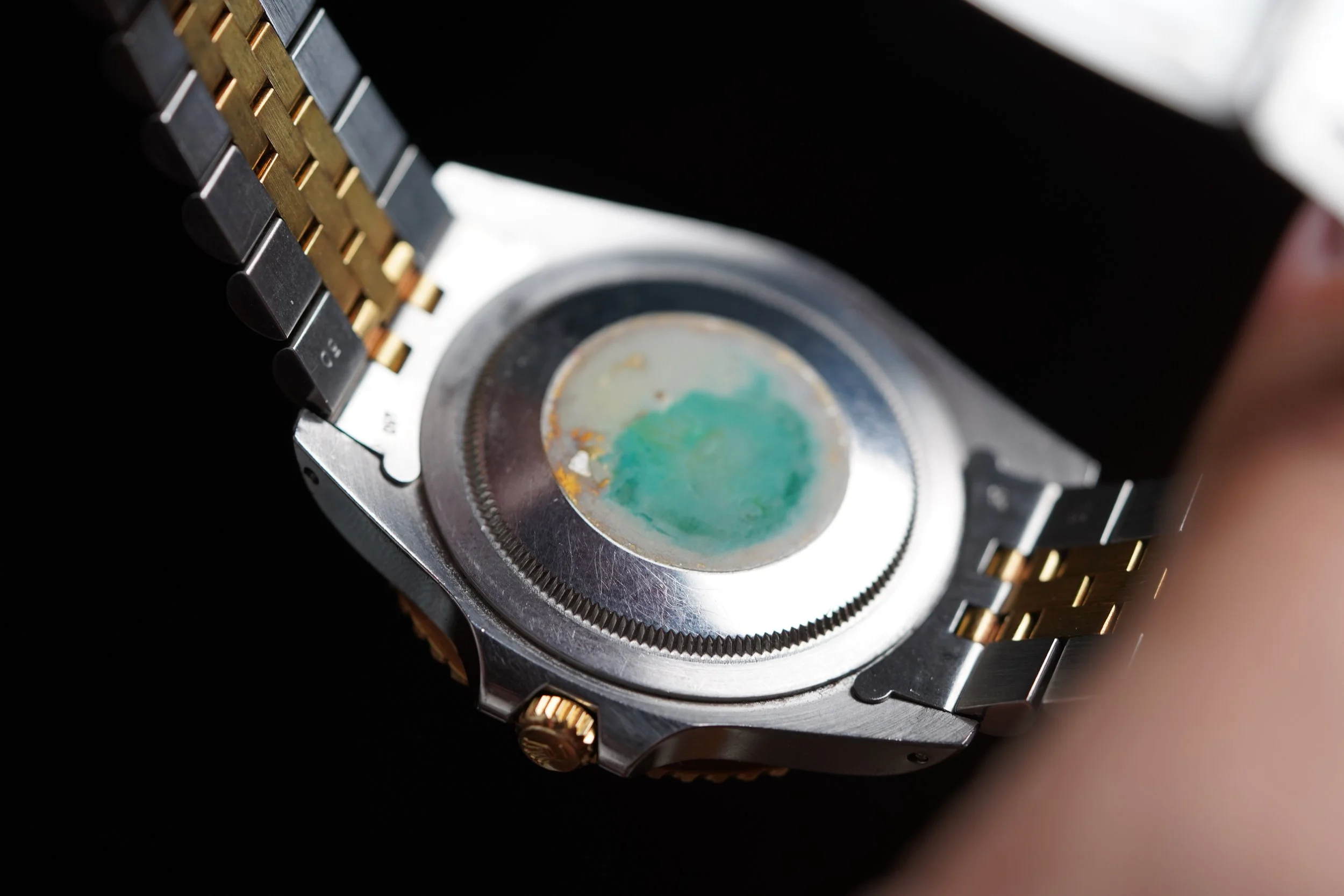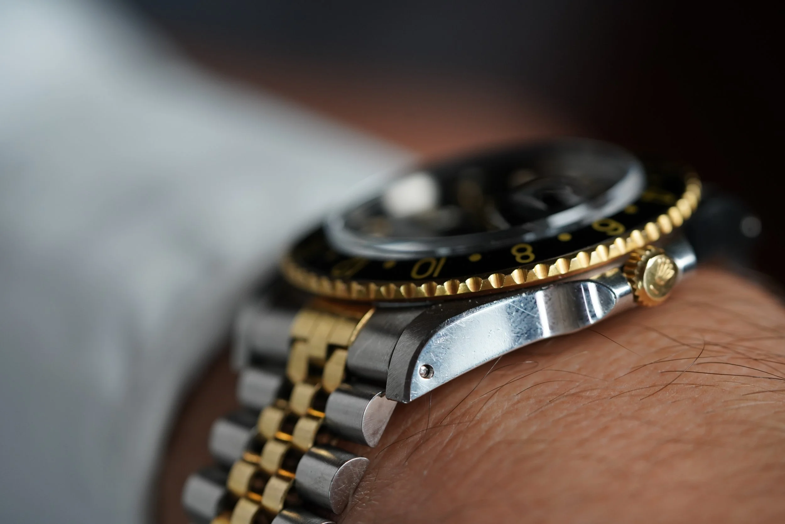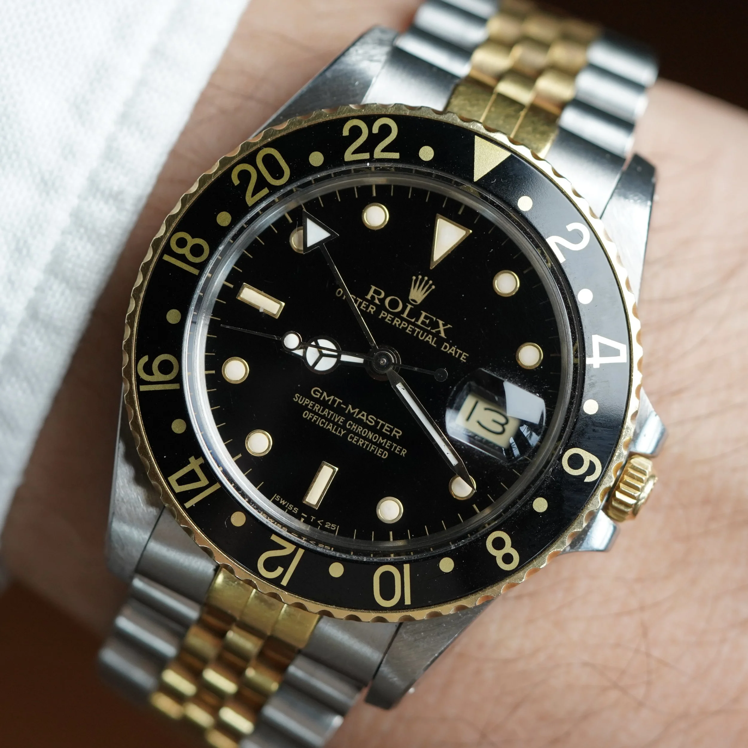 This Rolex two-tone GMT-Master reference 16753 is a great watch. It dates to circa 1988 with a R67 serial. The case has been polished in the past. It is paired on an Jubilee Rolex bracelet, which is very firm with K11 date code dating to 1986.