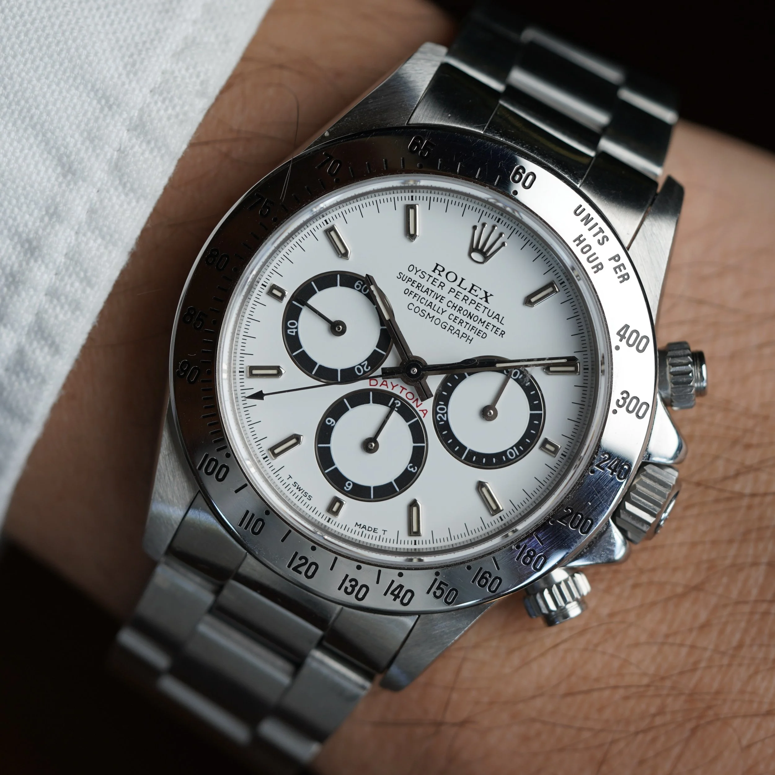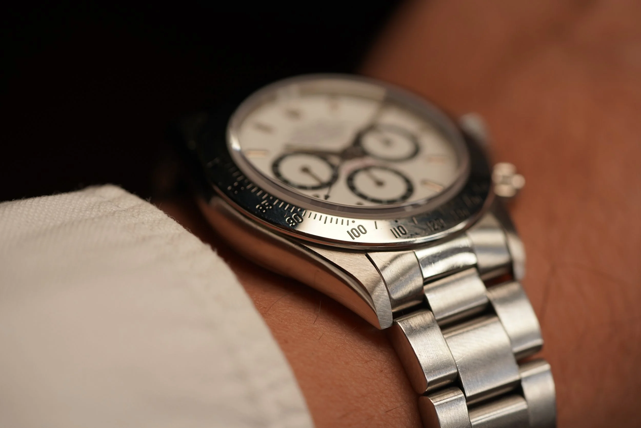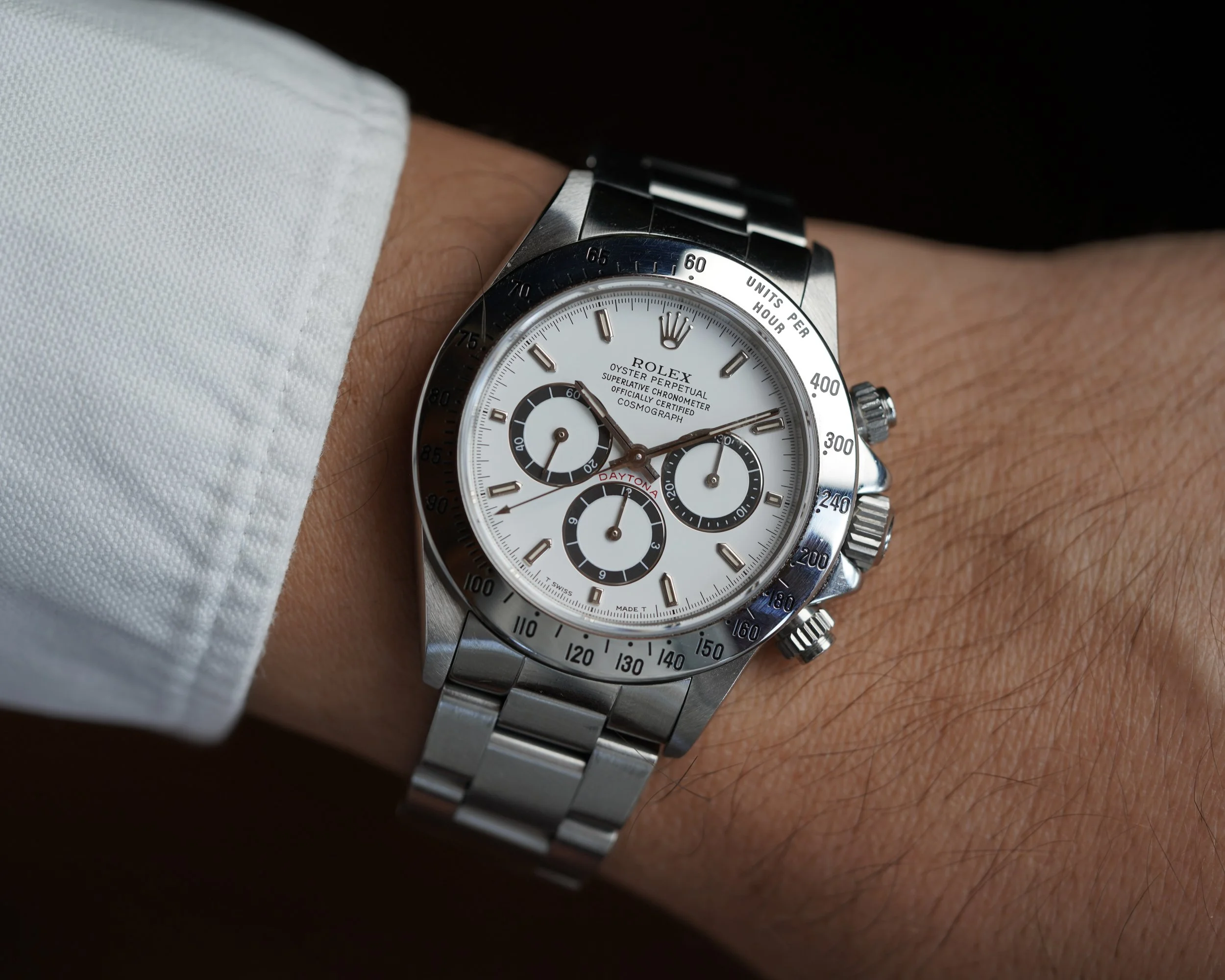 This Rolex Zenith Daytona Reference 16520 dates to circa 1991. It features an N serial number. It comes with a reference 78360 bracelet stainless steel Oyster bracelet with an M clasp coding dating to circa 1988. It features 503 B end links with polished center links (although it might have originally come with 503 end links without the polished center section). The watch was sold in 1993 according to the papers.It measures 40mm in diameter, and approximately 47mm lug-to-lug. This example features a white dial with black sub-registers. The watch is in phenomenal shape. The case appears to be unpolished. It features the inverted 6 dial.