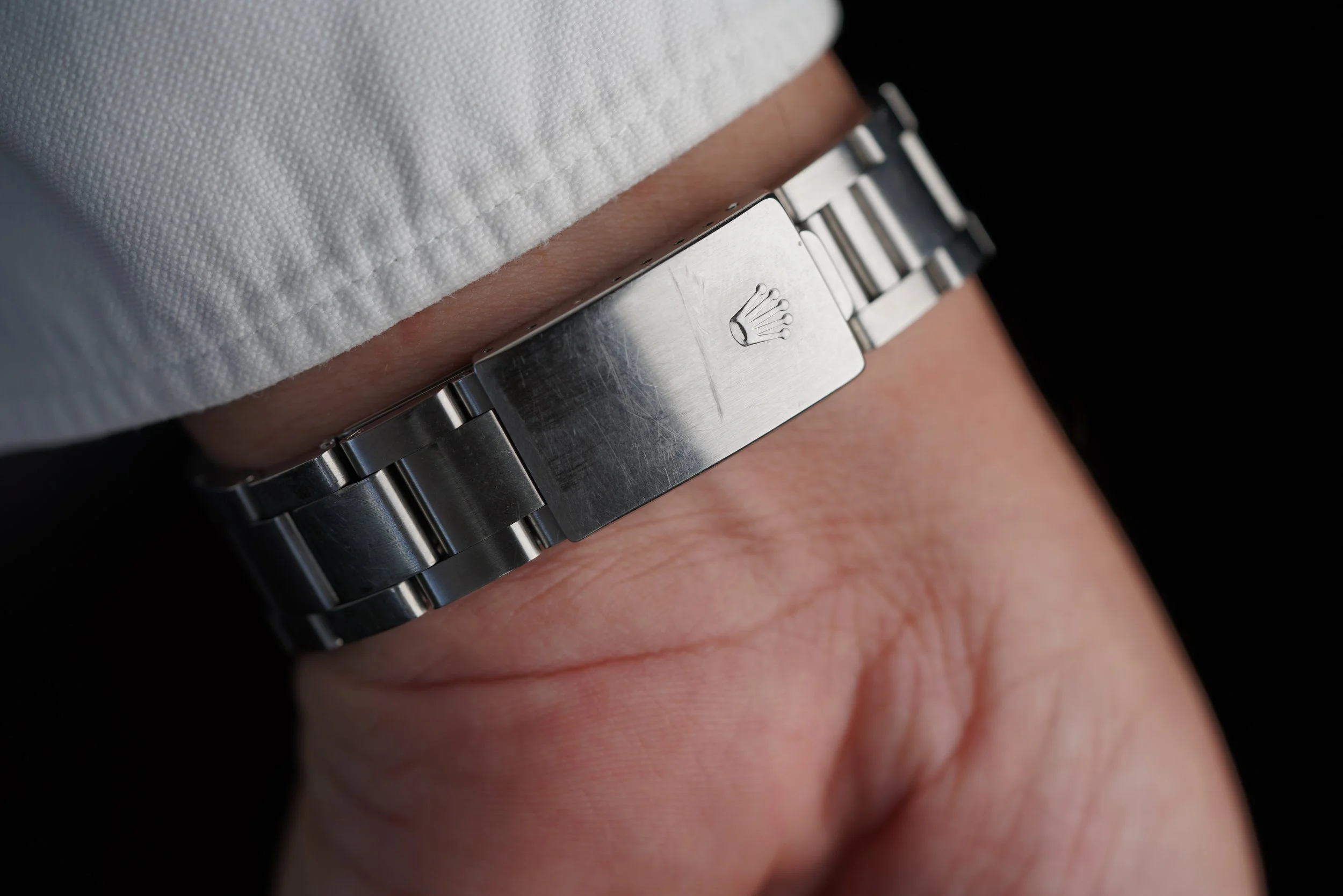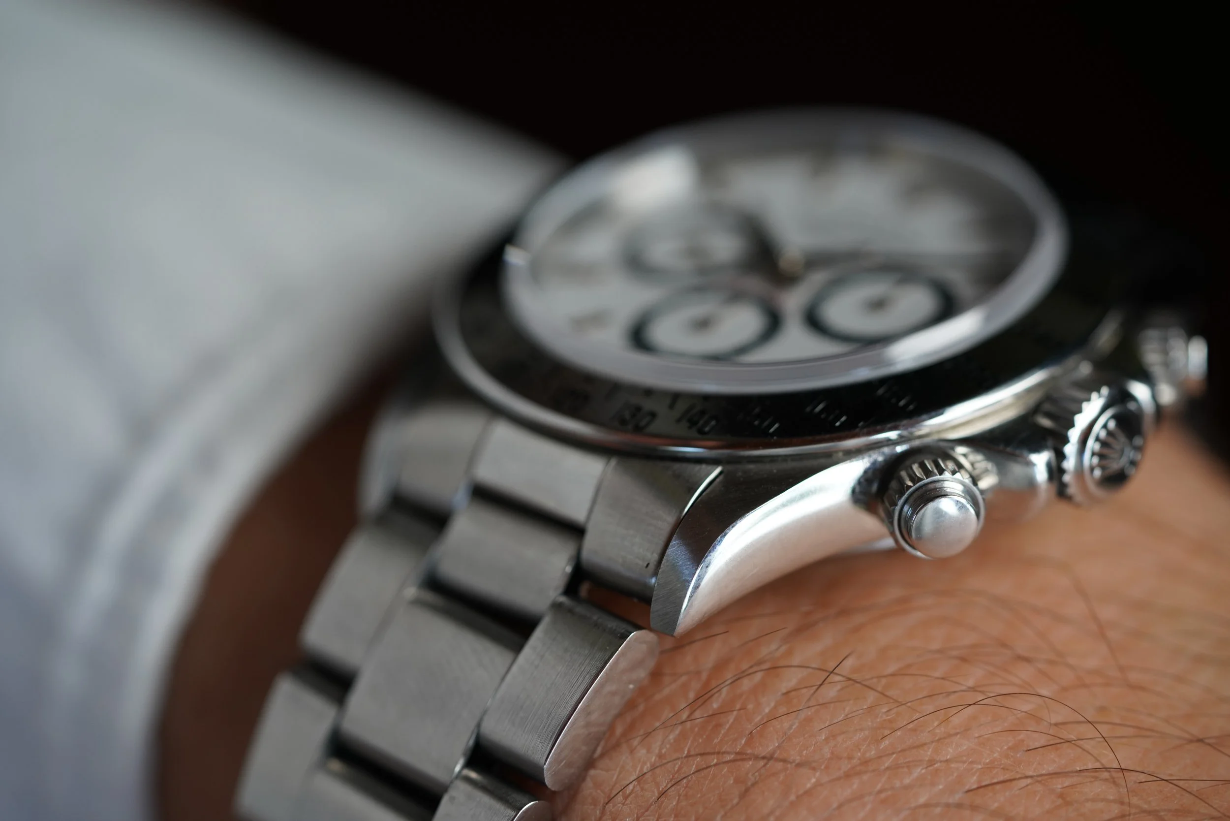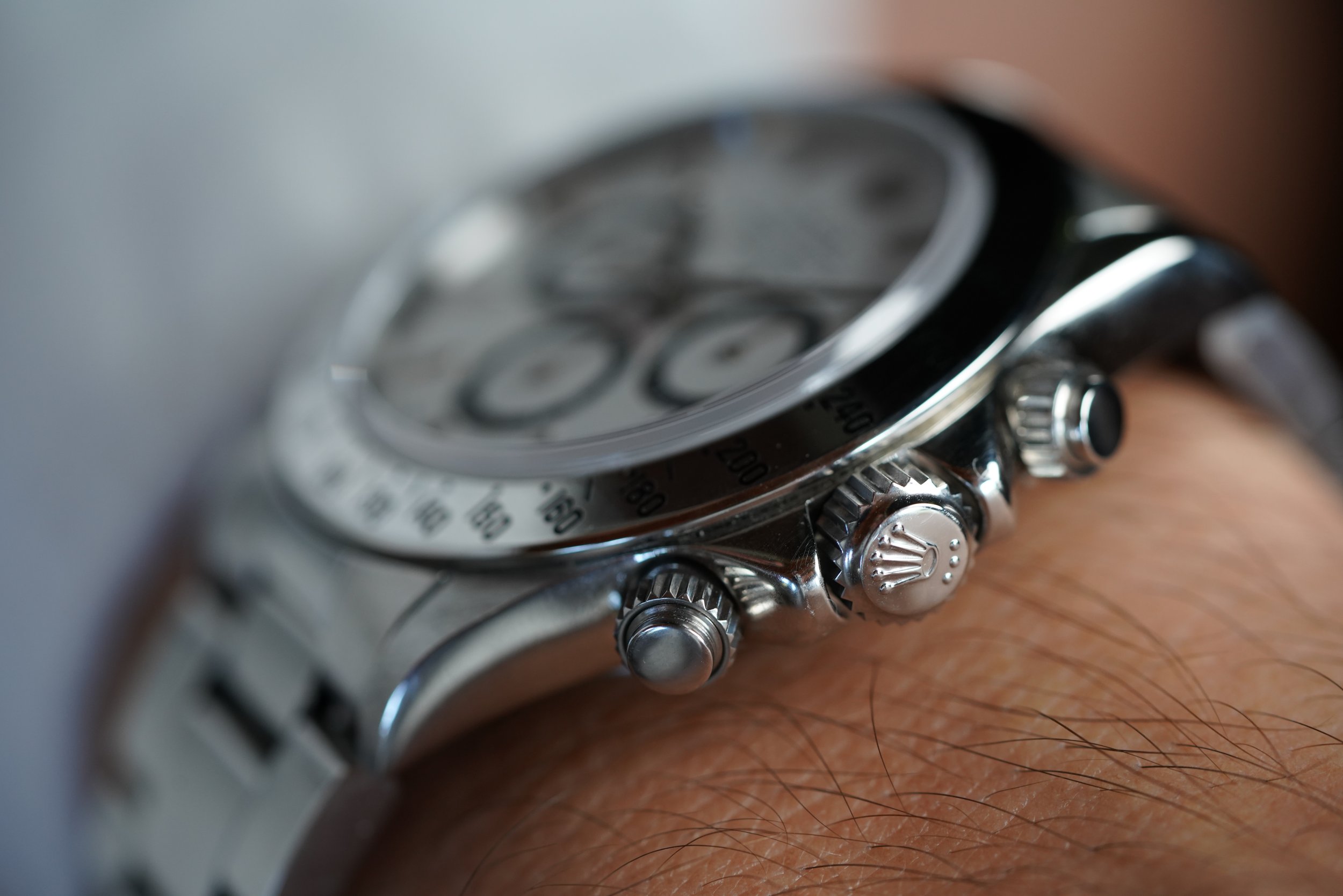 This Rolex Zenith Daytona Reference 16520 dates to circa 1991. It features an N serial number. It comes with a reference 78360 bracelet stainless steel Oyster bracelet with an M clasp coding dating to circa 1988. It features 503 B end links with polished center links (although it might have originally come with 503 end links without the polished center section). The watch was sold in 1993 according to the papers.It measures 40mm in diameter, and approximately 47mm lug-to-lug. This example features a white dial with black sub-registers. The watch is in phenomenal shape. The case appears to be unpolished. It features the inverted 6 dial.