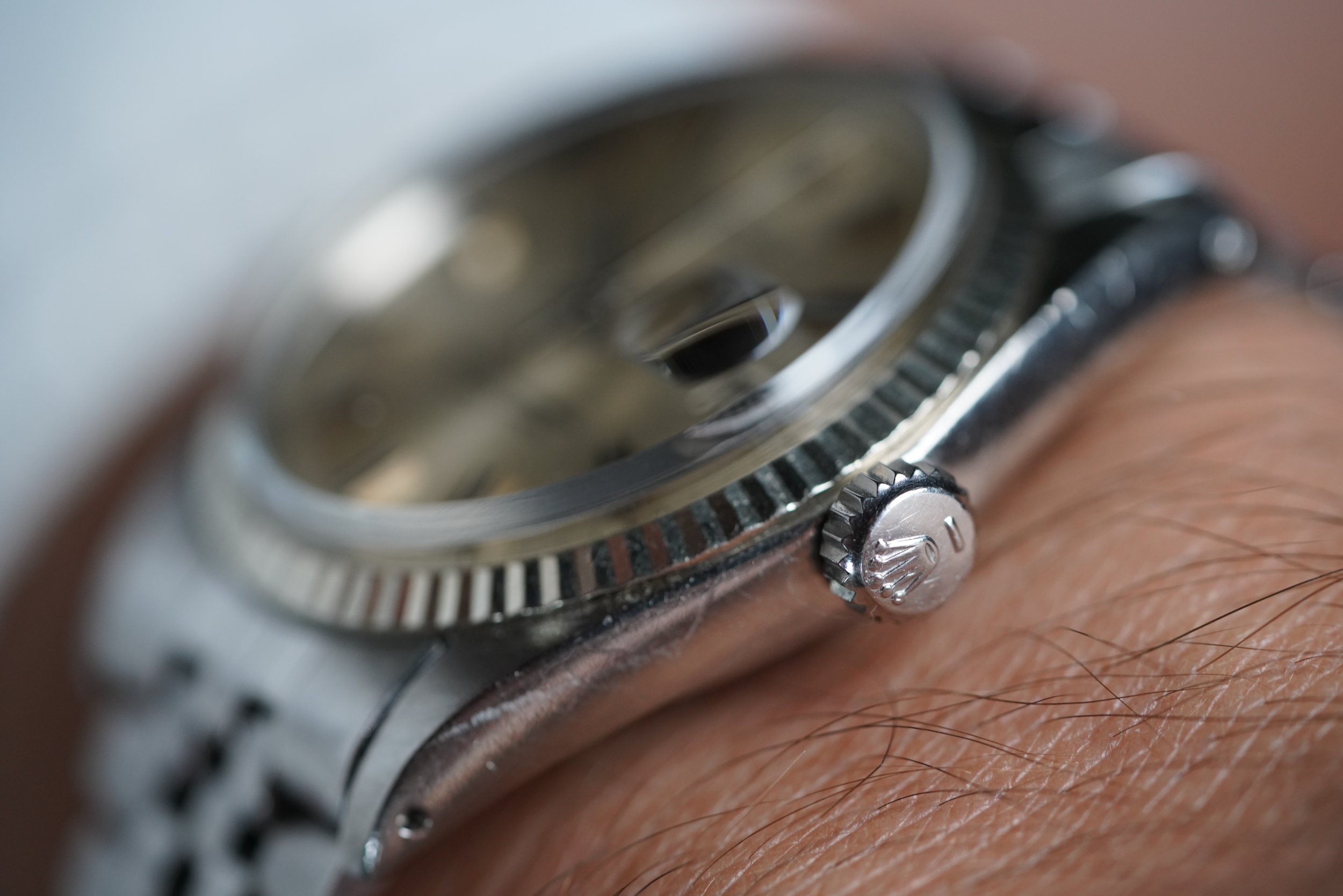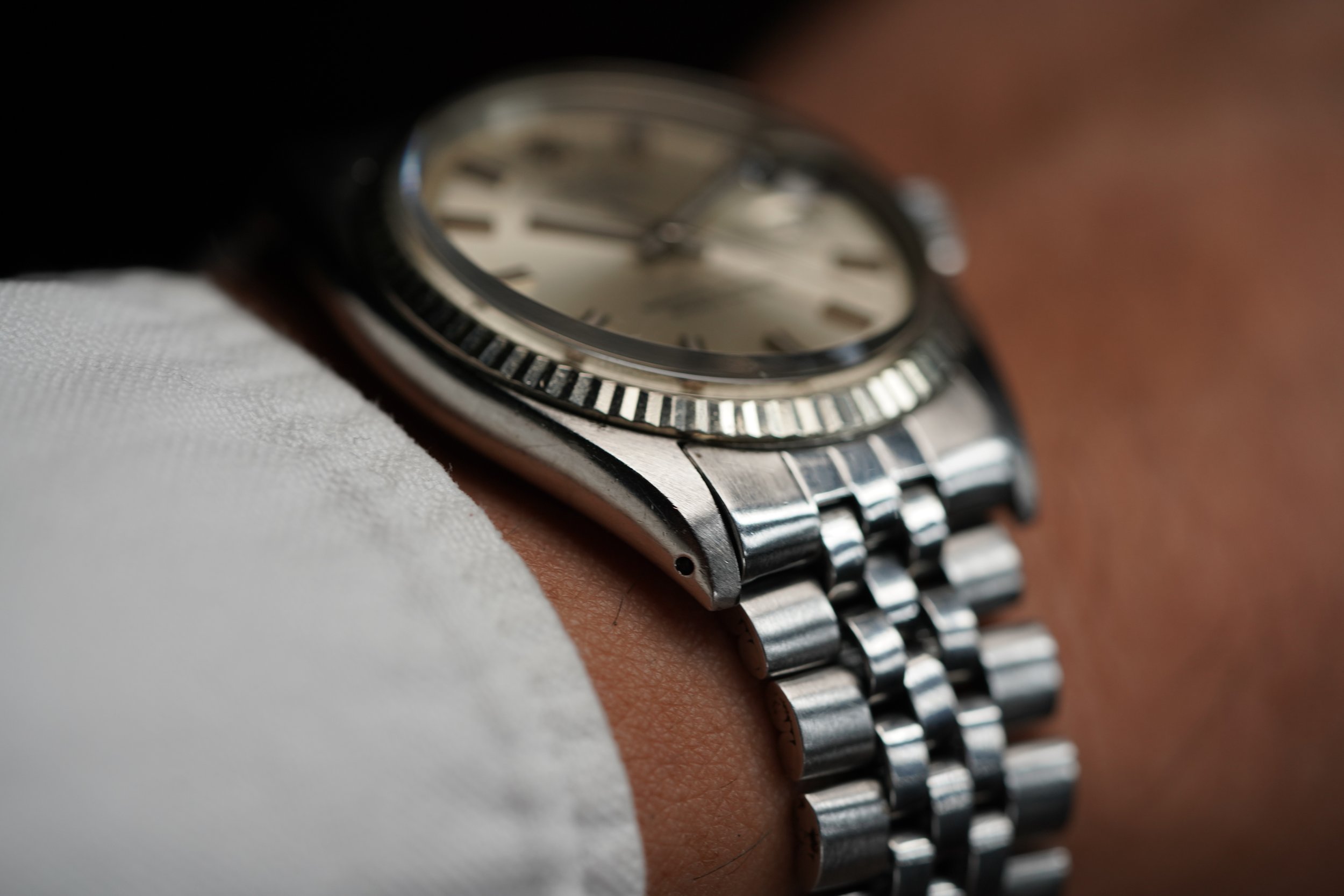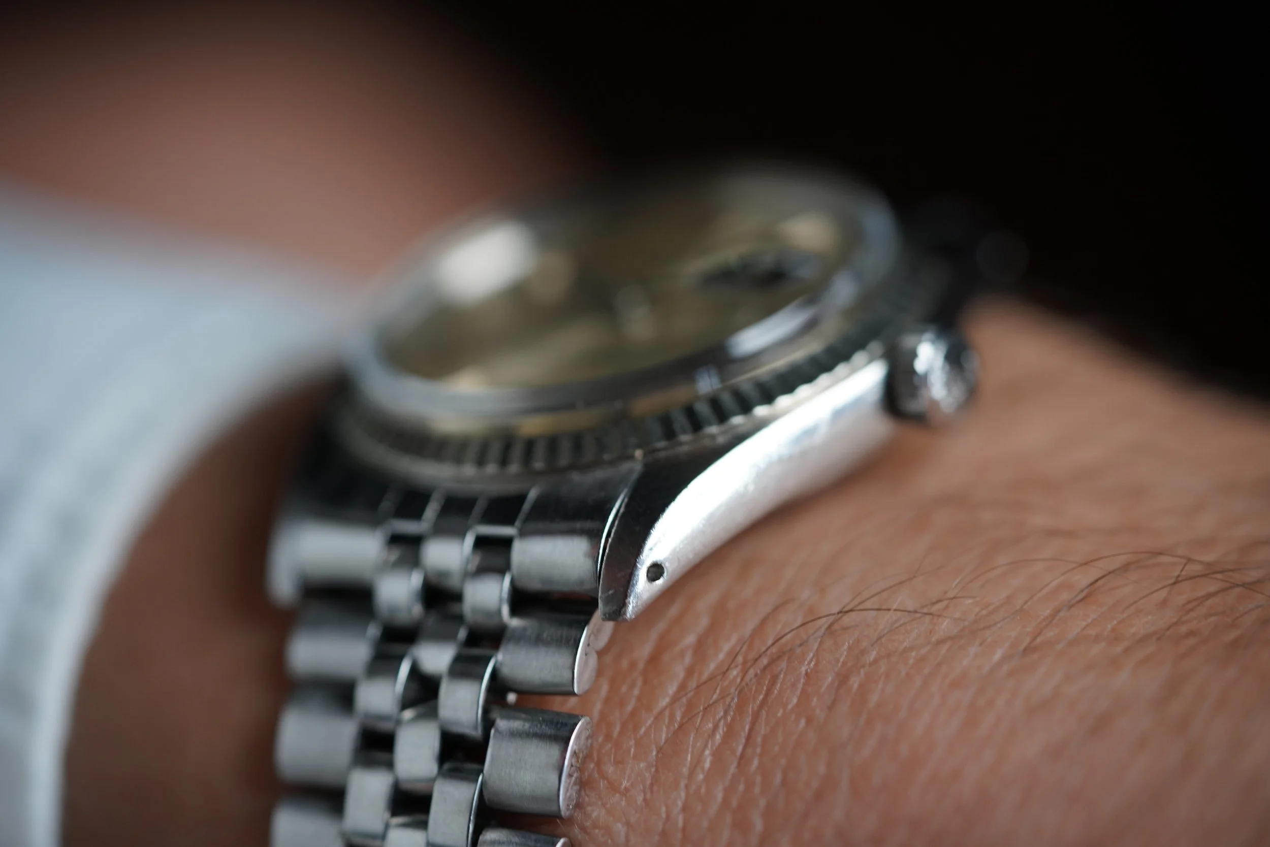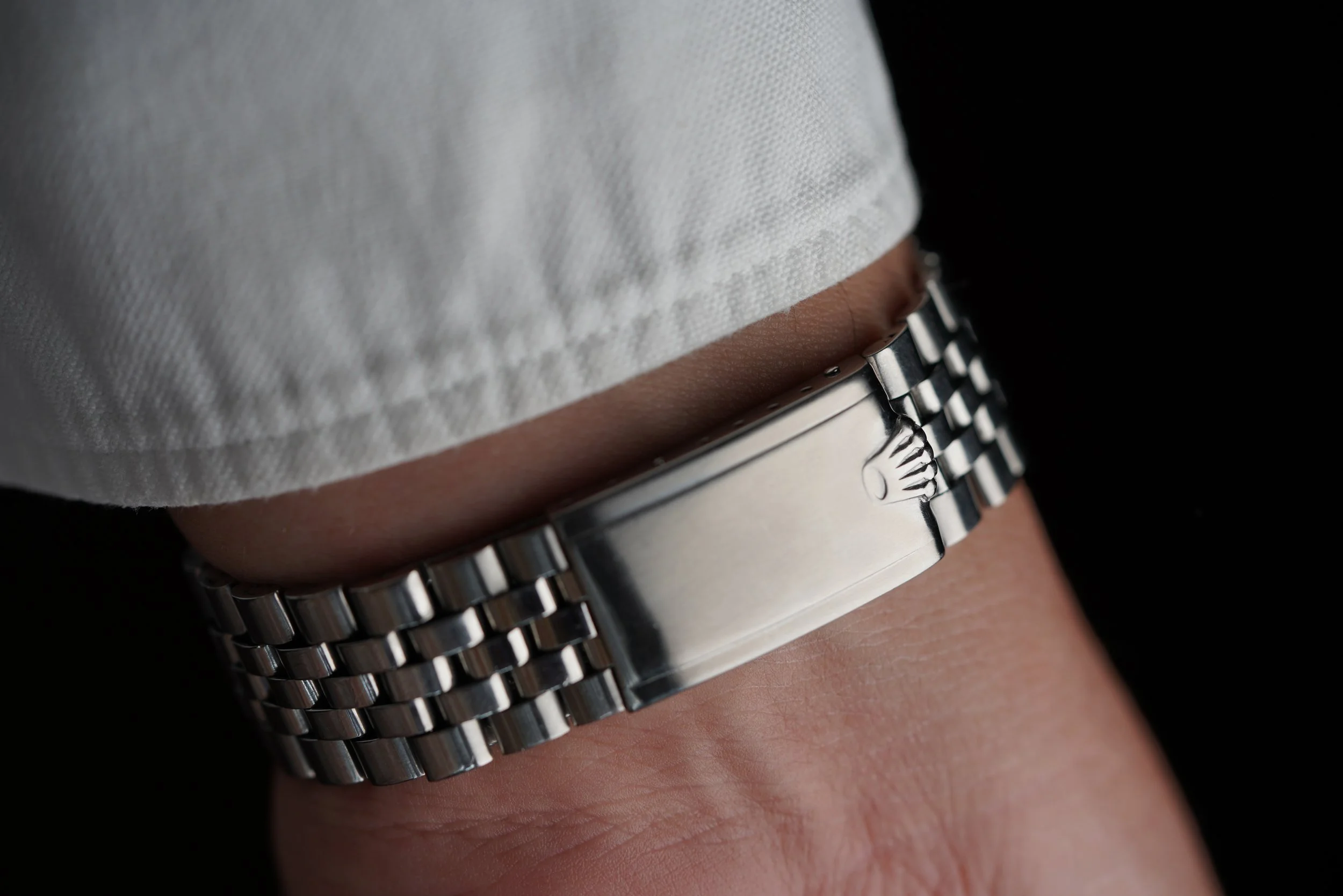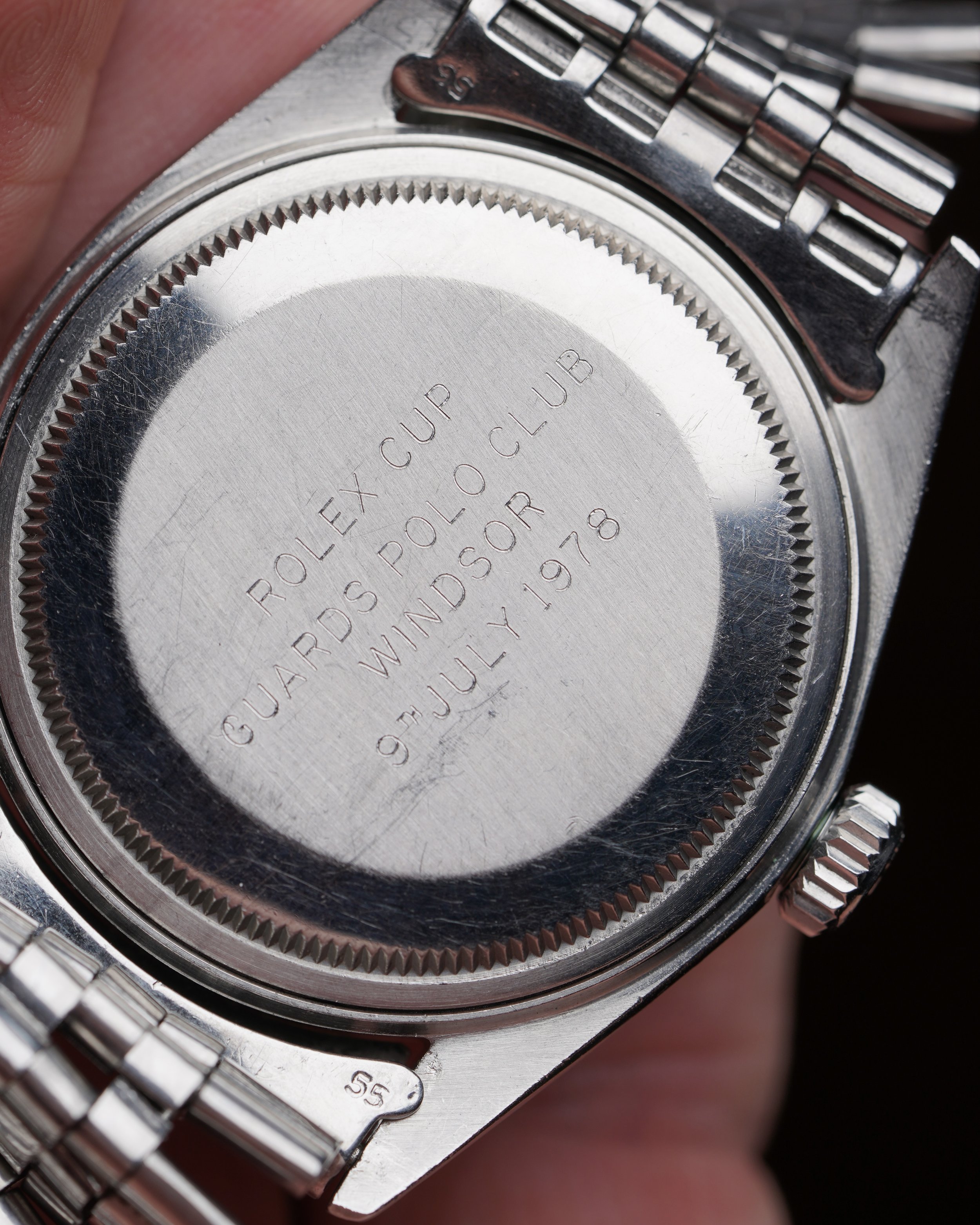 This is a special Rolex “Wide Boy” Datejust reference 1601 that was likely presented by the then Prince of Wales and now King Charles to the winner at the 1978 Guards Polo Club. It features an attractive and uncommon non-luminous dial which was probably chosen due to the rough nature of the sport. The case has been lightly polished but is attractive. It measures 36mm in diameter (43mm lug-to-lug). The watch has a 3.3M serial number dating the watch to circa 1973. It is paired on a Rolex Jubilee bracelet with 55 end links dating to 1970.
