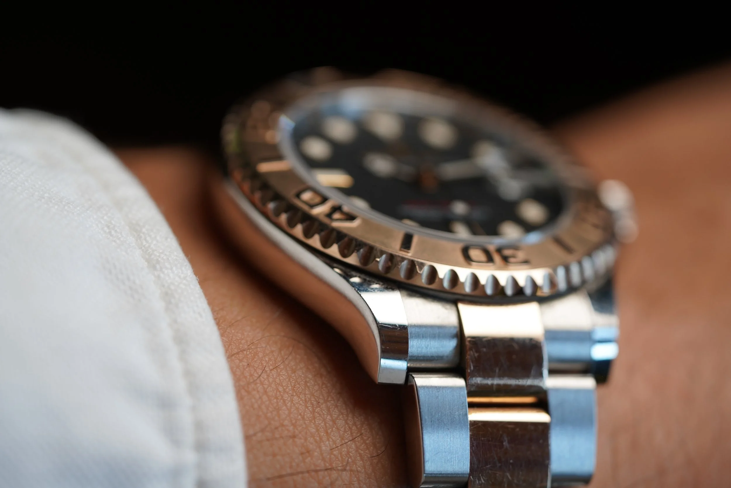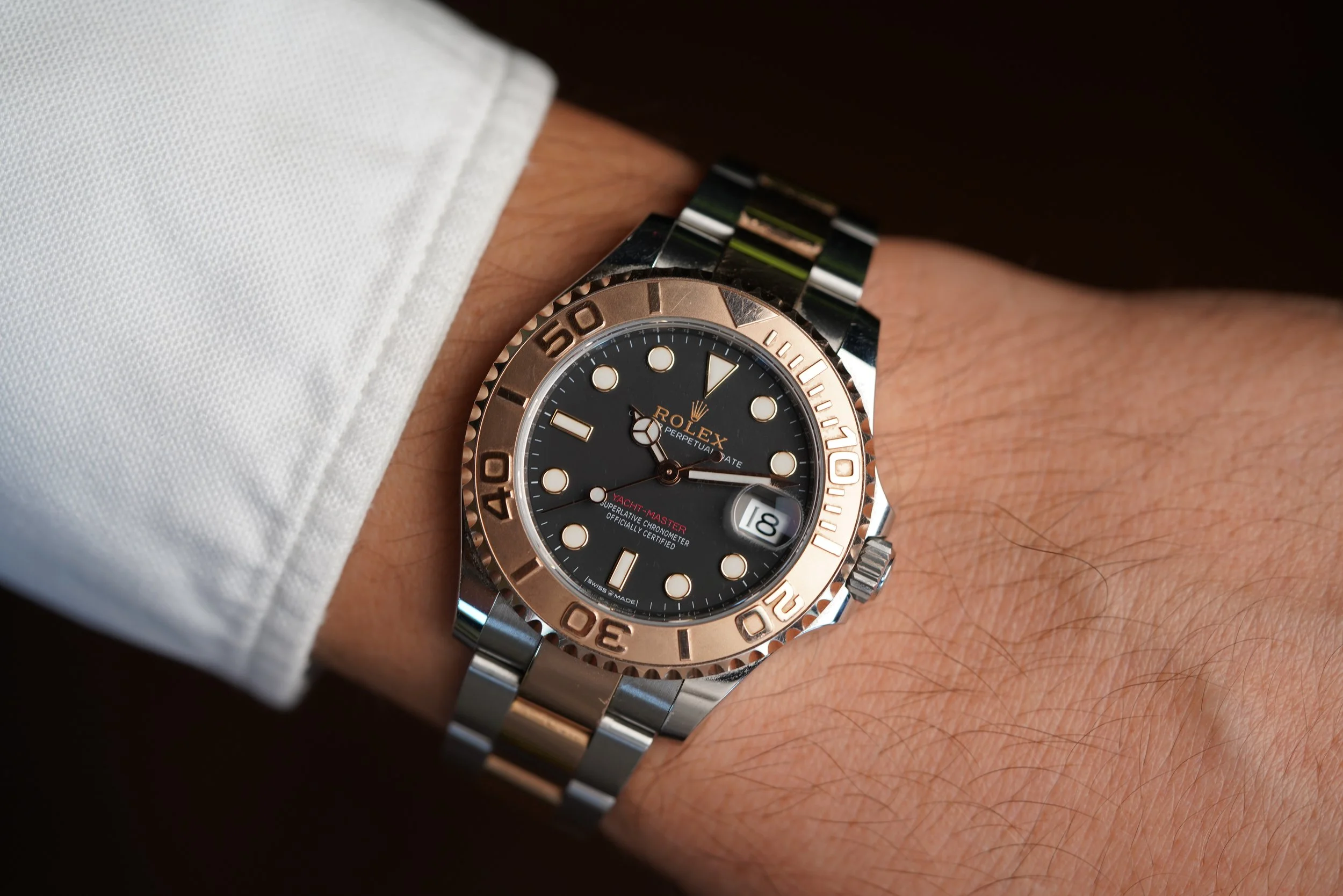 This Rolex Yachtmaster is a great 37mm two-tone watch out of the current Rolex line-up. It measures 37mm in diameter, 43.5mm lug-to-lug. The watch is stainless steel and “Everose” 18k pink gold. This example features a black dial. The case and bracelet appear to be unpolished.
