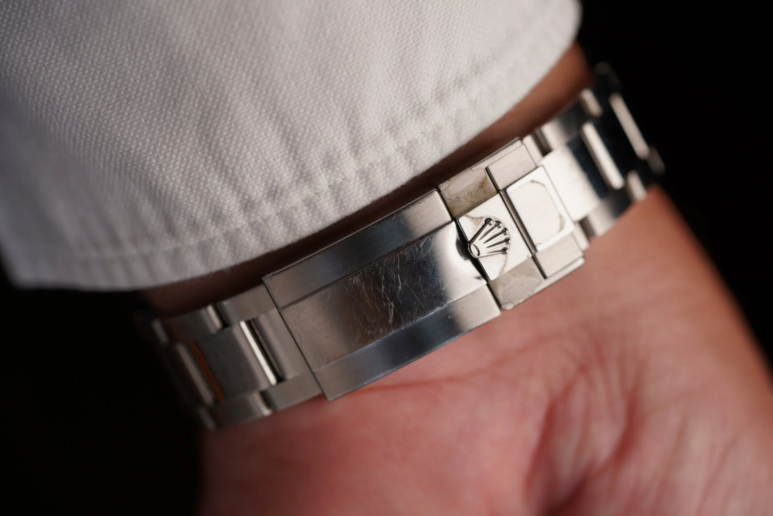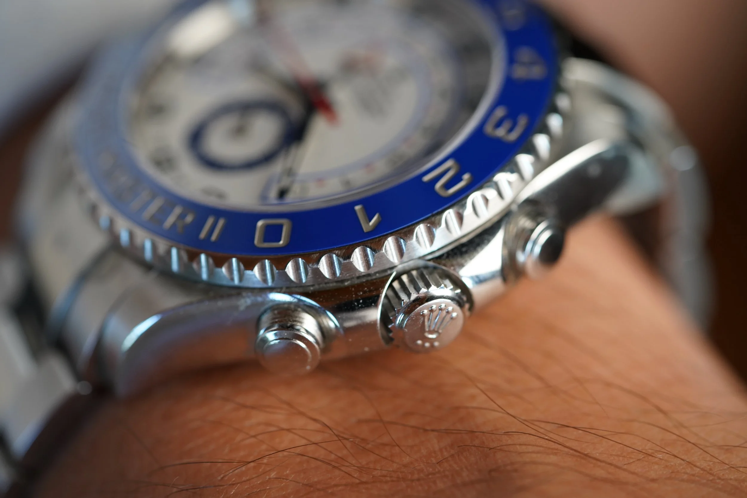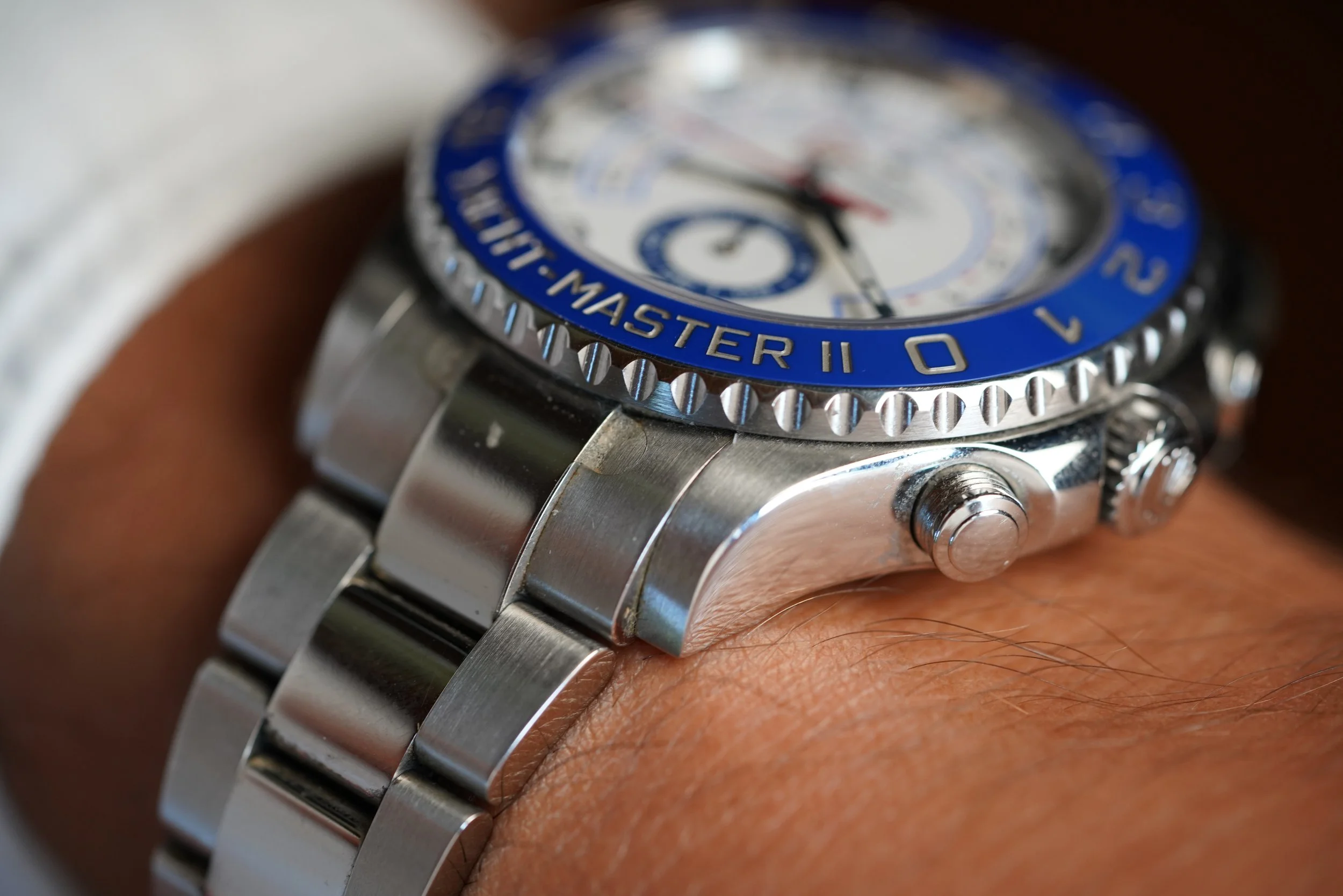 The Rolex Yacht Master II white dial with blue ceracrome bezel boasts Rolex’s ring comand system with an on the fly reprogramable countdown timer. The 44 mm oystersteel case and bracelet are attractive. The case appears to be unpolished. This timepiece offers a commanding presence on the wrist and looks equally cool with a suit and tie or a bathing suit and towel.