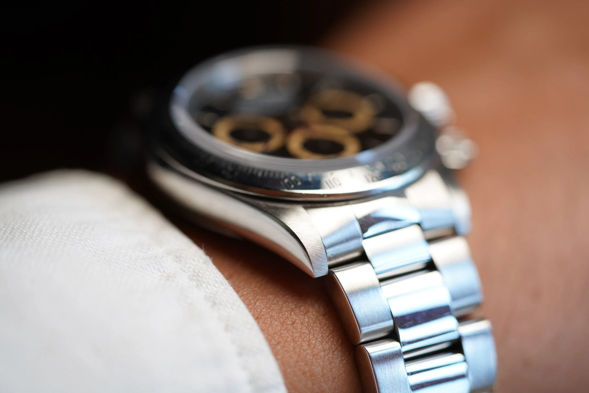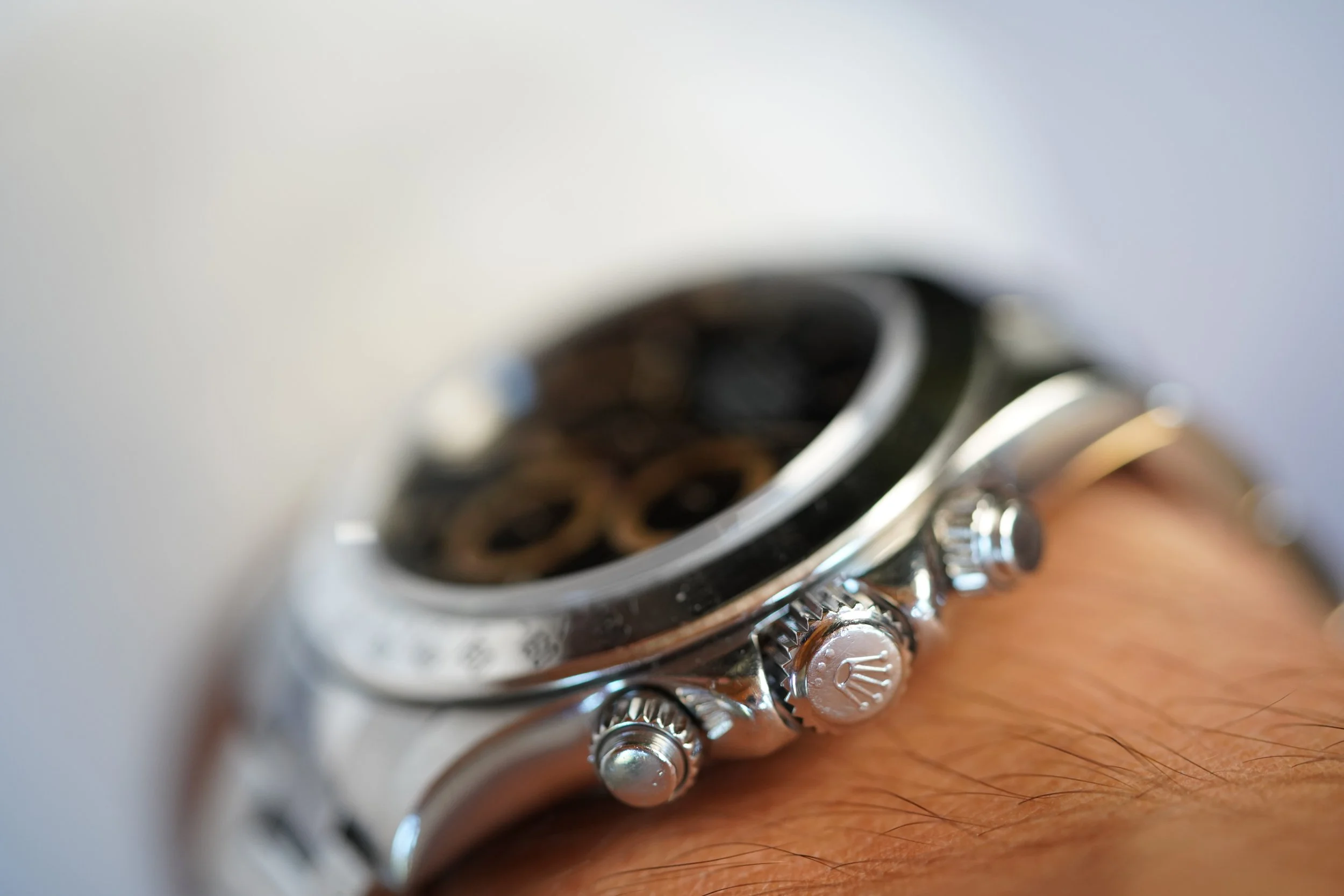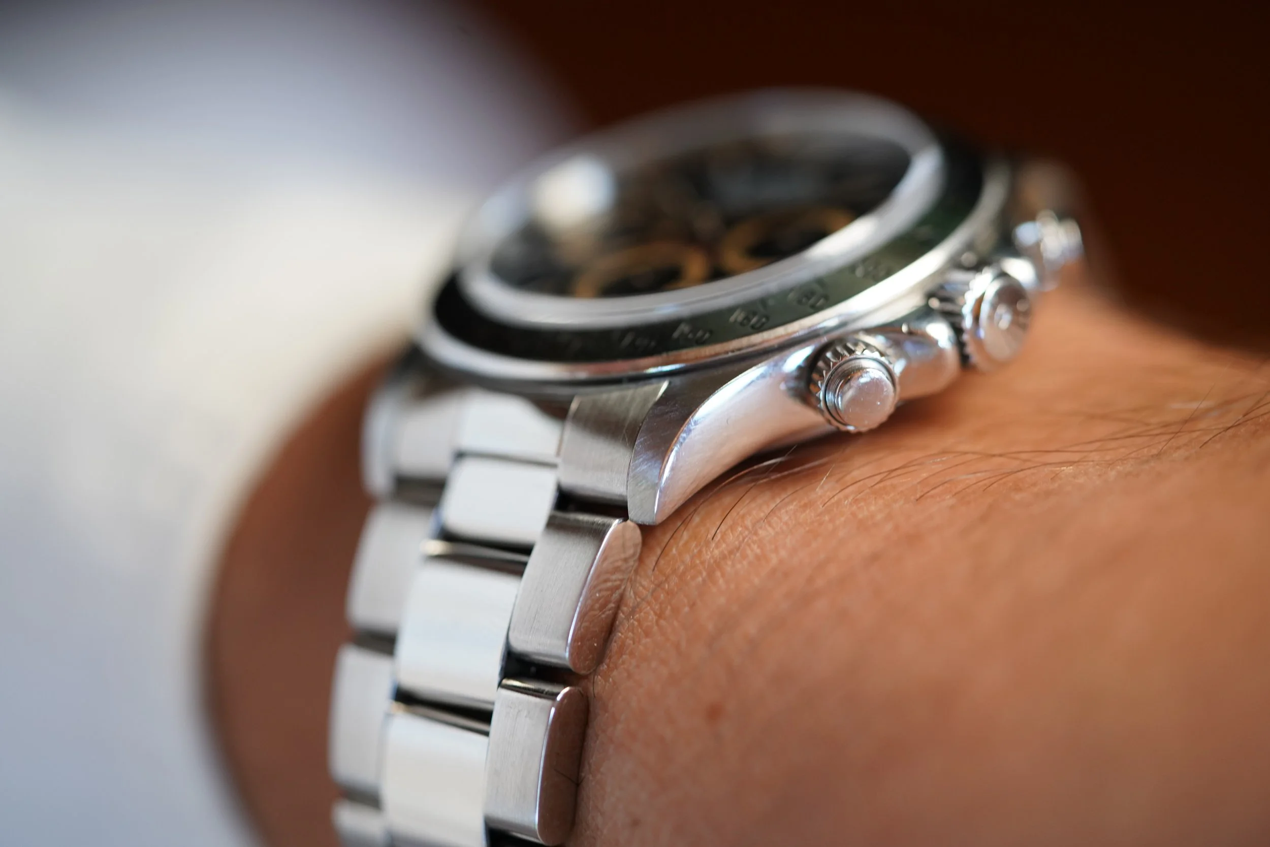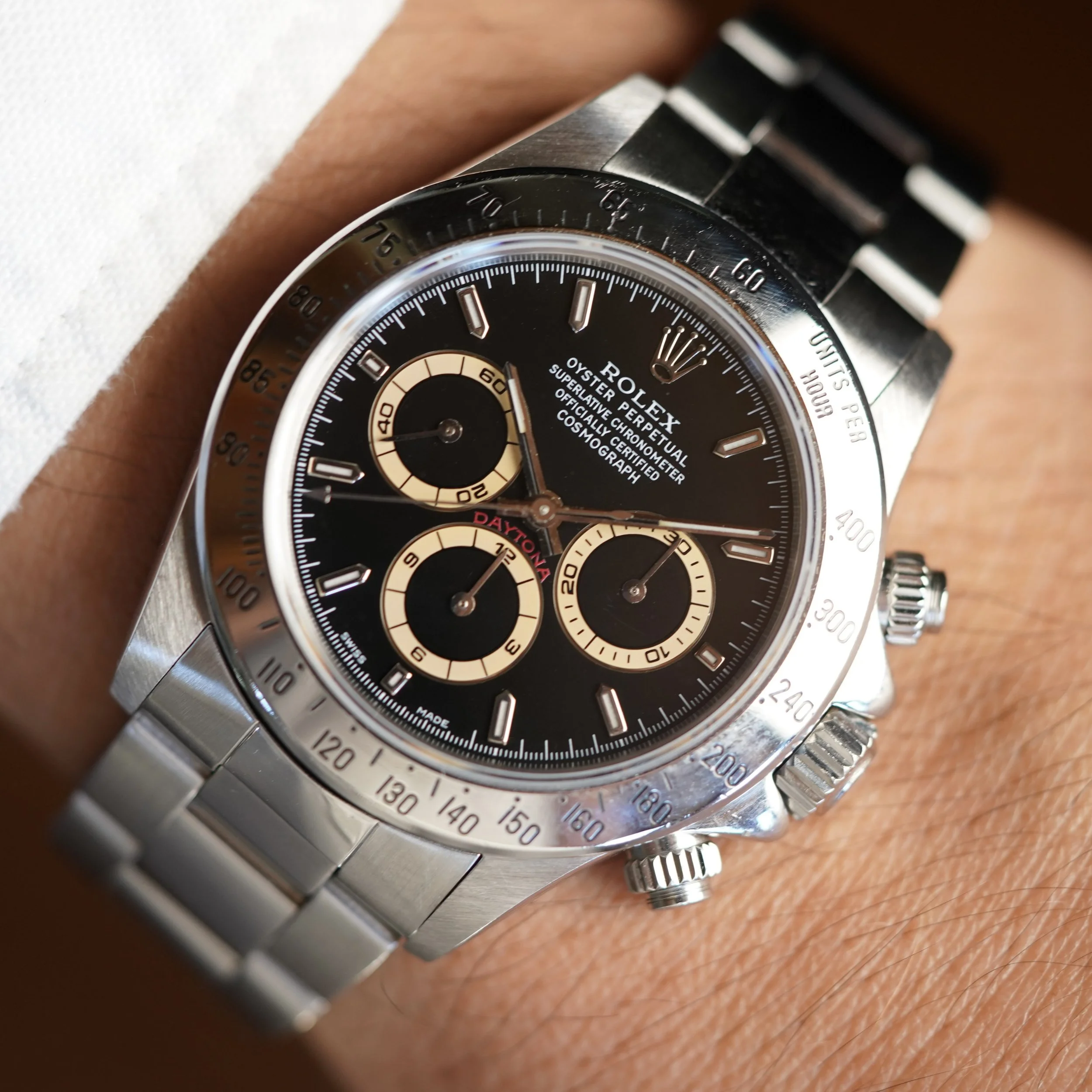 The adorned “Zenith Daytonas” are certainly among the highly desired neo-vintage Rolex models. Zenthi Daytonas were produced from circa 1988 until 2000. It is powered by an automatic Calibre 4030 made by Zenith. The case has been polished. It measures 40mm in diameter (42.5 including crown) and 47mm lug to lug. The outer ring of the registers have developed a very attractive tropical color similar to the “Patrizzi” dials but this is slightly later that these models. It features a U8 serial and dates to circa 1997-1009.