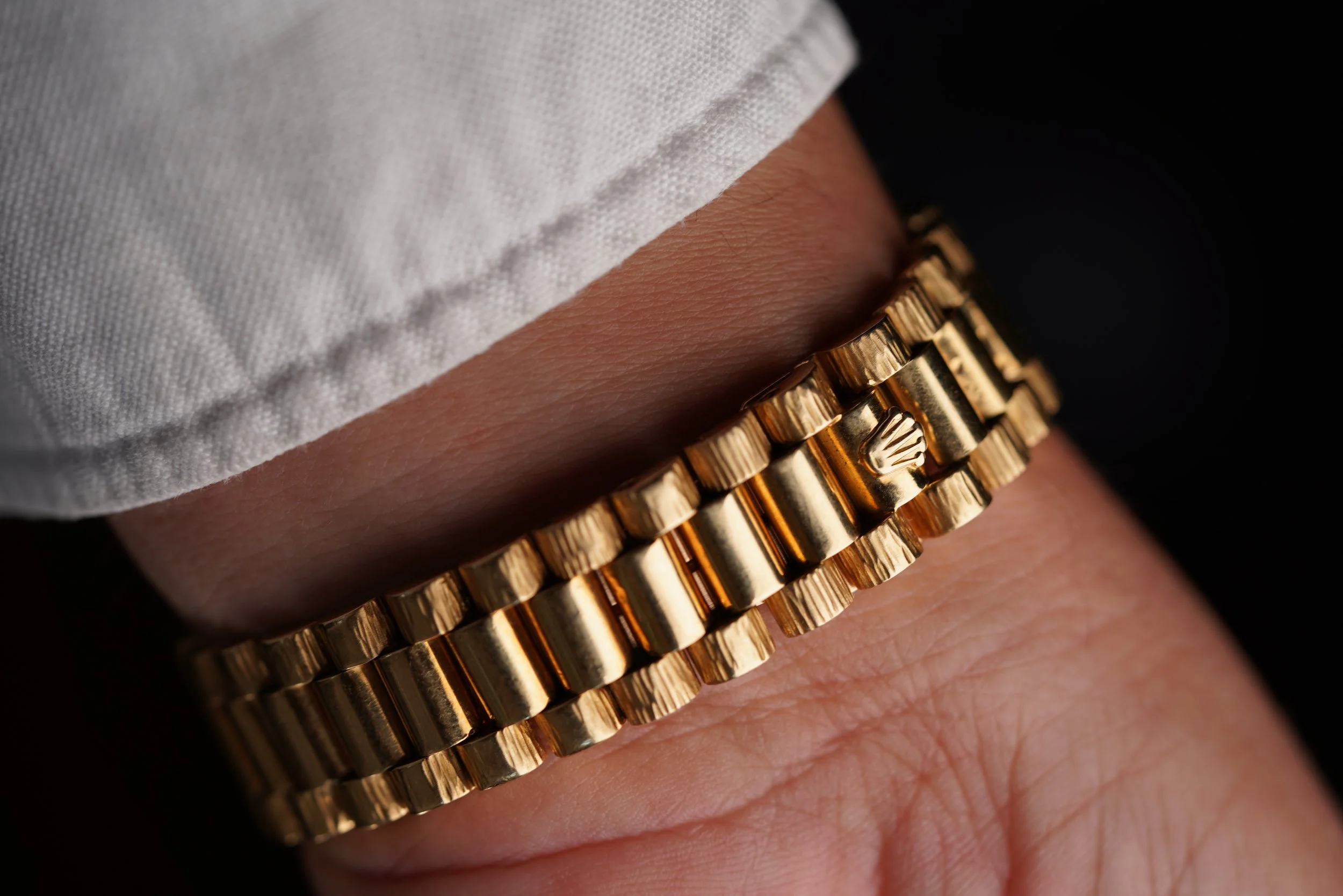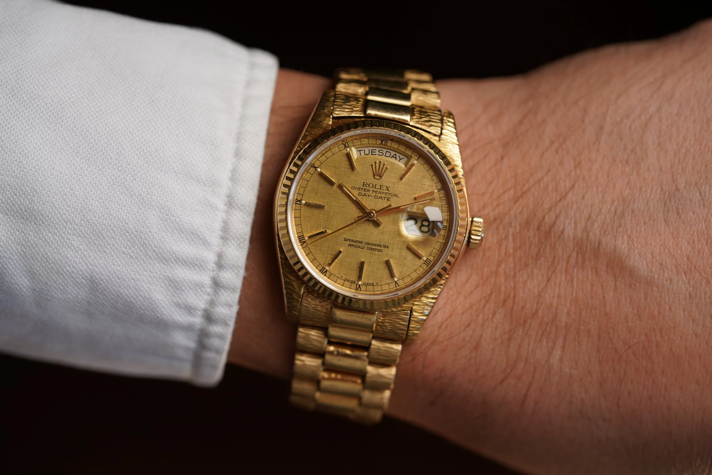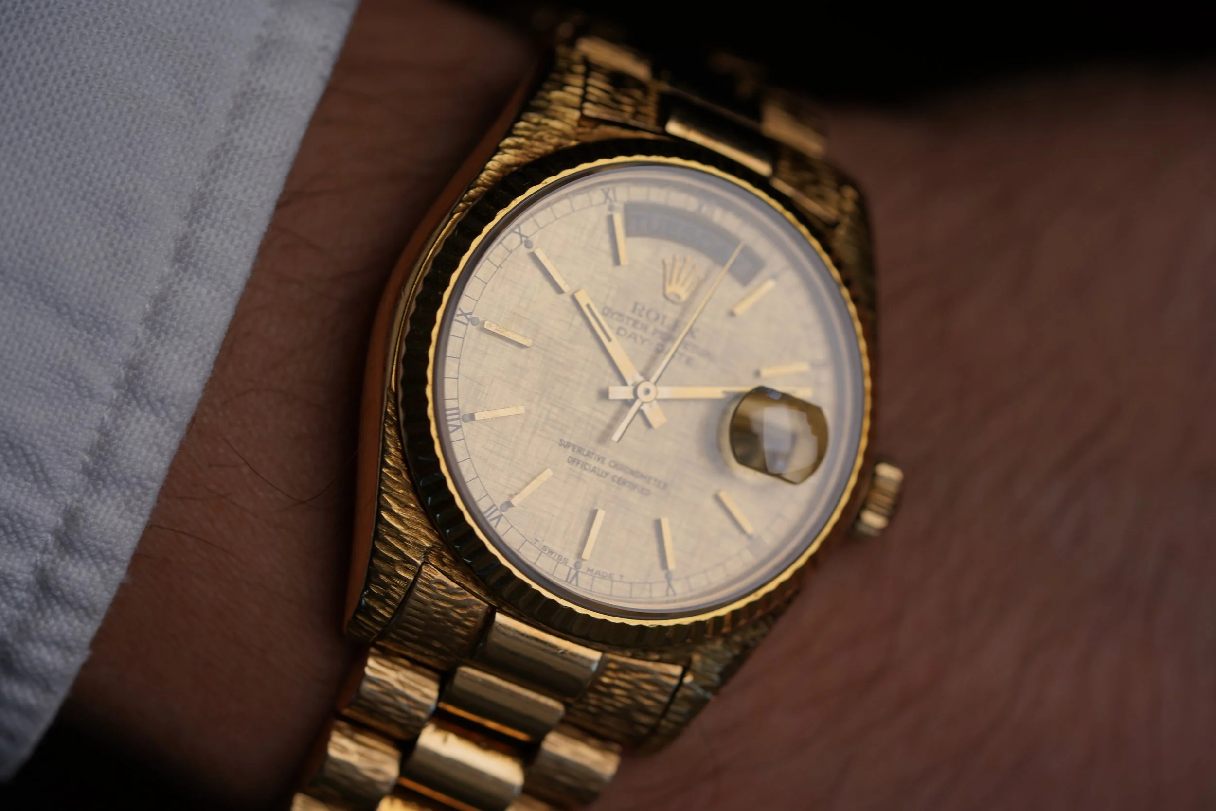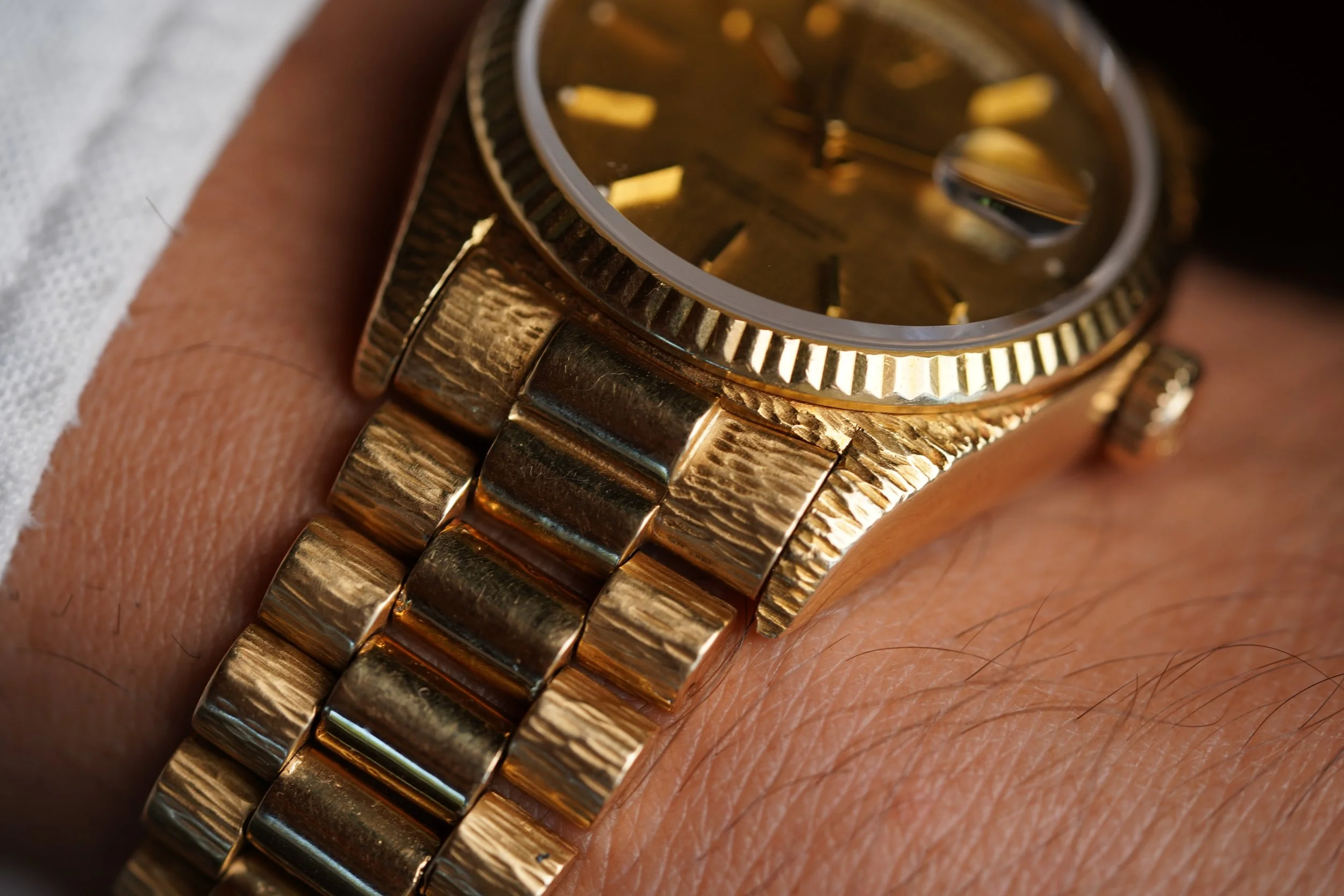 The Rolex Day-Date was introduced in 1956 and was the first watch to display the date, as well as the fully-spelled-out day of the week. This reference 18038 is made particularly special as the case was likely hand finished, or carved at time of purchase at the Bahamian official Rolex retailer John Bull by their master watchmaker Günter Miethe. This was a popular request by the Bahamian retailer throughout the 1980s and these watches are highly prized by collectors for their unique look and island vibes. Our understanding is that Rolex gave their blessing to their official retailer John Bull to customize these watches for the local Bahamian market at the time. Most of the John Bull watches with a bark carved finish were steel Submariners or less commonly steel GMT-Masters. This is the first ever Day-Date we have seen with this iconic John Bull finish.