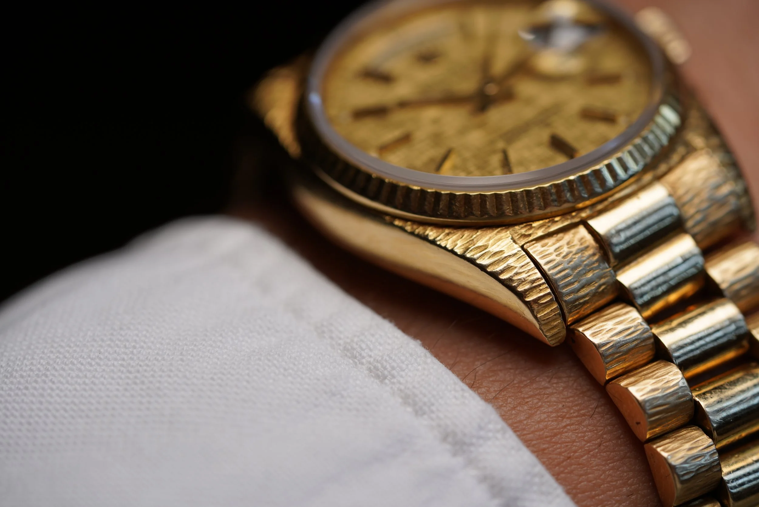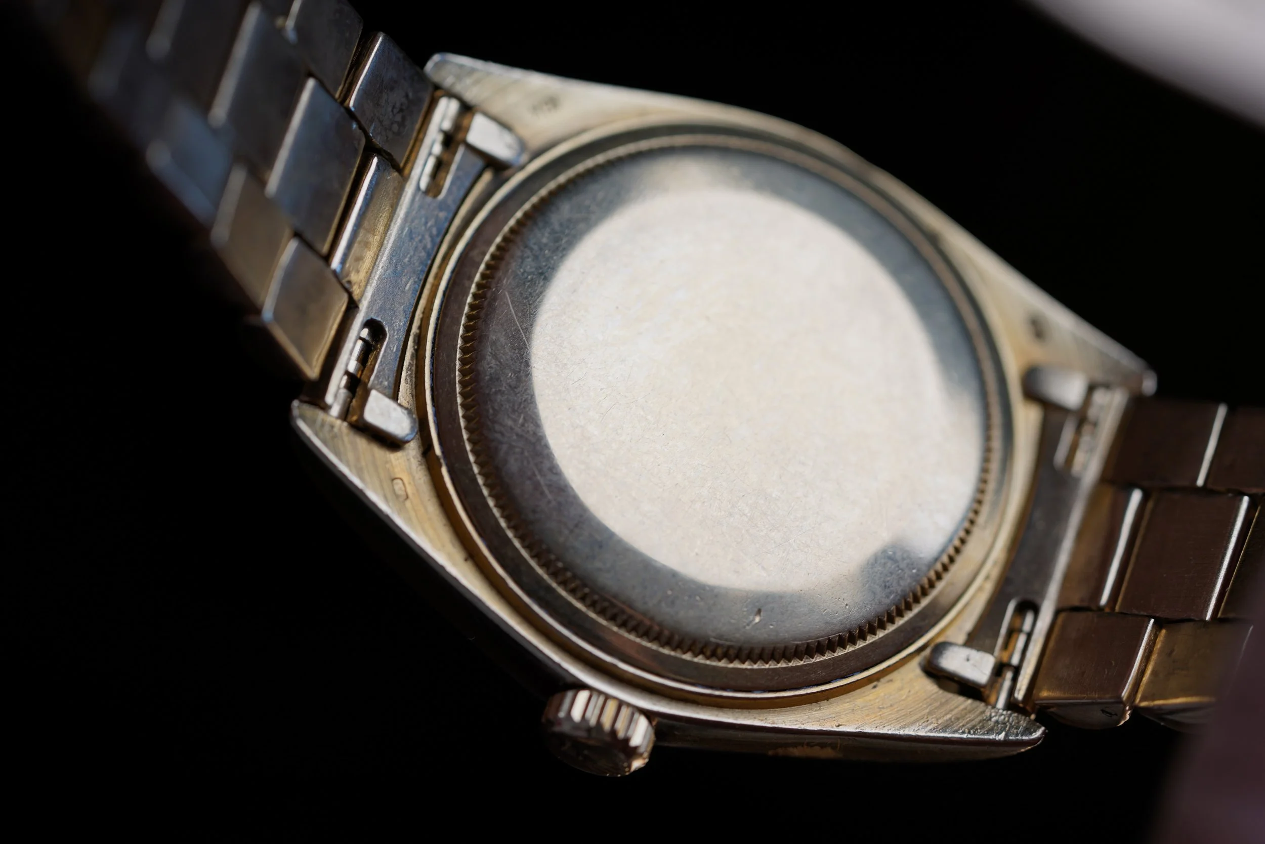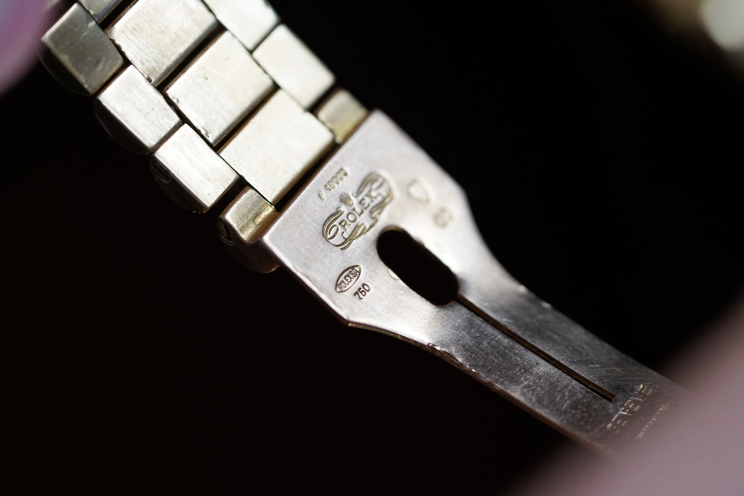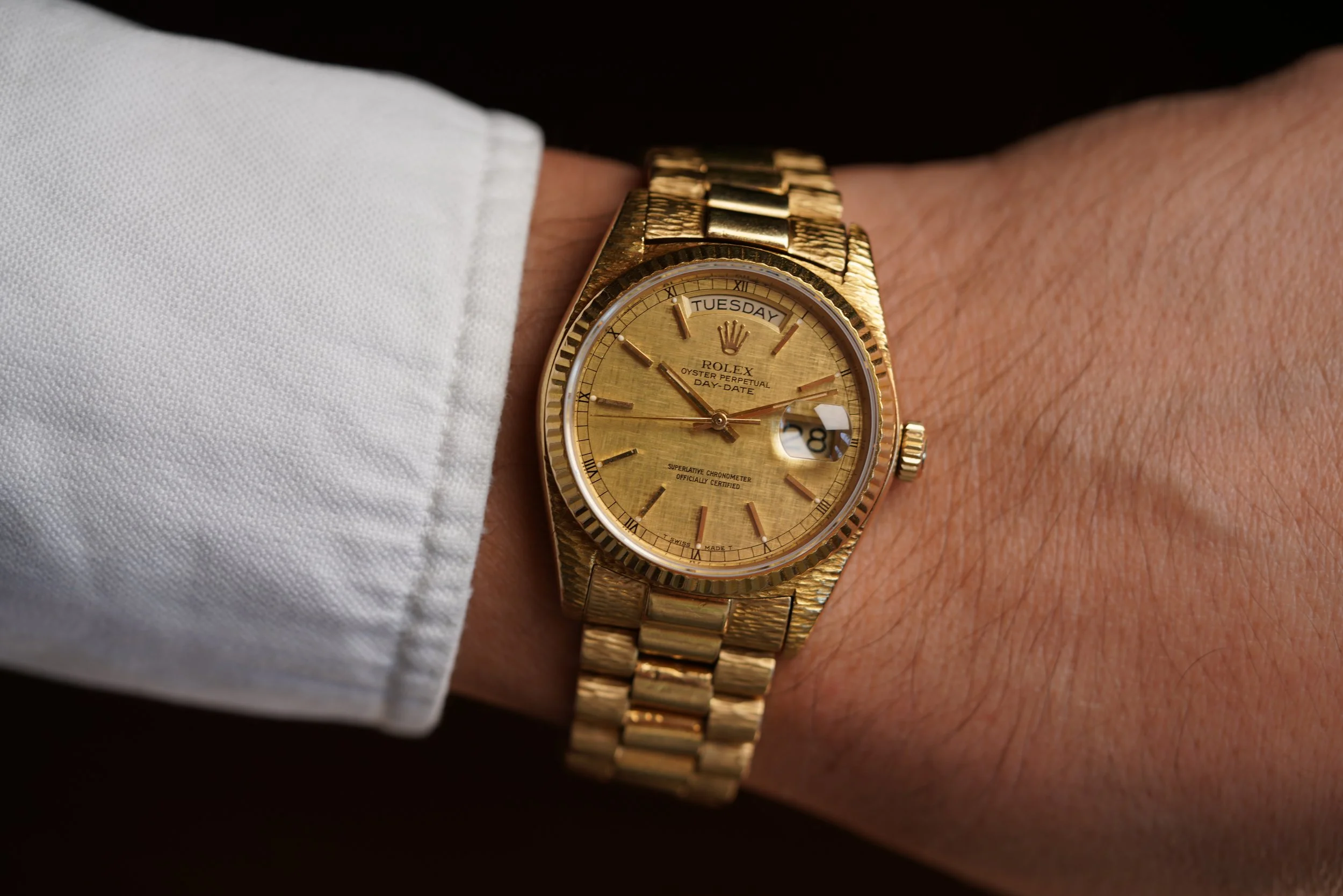The Rolex Day-Date was introduced in 1956 and was the first watch to display the date, as well as the fully-spelled-out day of the week. This reference 18038 is made particularly special as the case was likely hand finished, or carved at time of purchase at the Bahamian official Rolex retailer John Bull by their master watchmaker Günter Miethe. This was a popular request by the Bahamian retailer throughout the 1980s and these watches are highly prized by collectors for their unique look and island vibes. Our understanding is that Rolex gave their blessing to their official retailer John Bull to customize these watches for the local Bahamian market at the time. Most of the John Bull watches with a bark carved finish were steel Submariners or less commonly steel GMT-Masters. This is the first ever Day-Date we have seen with this iconic John Bull finish.
