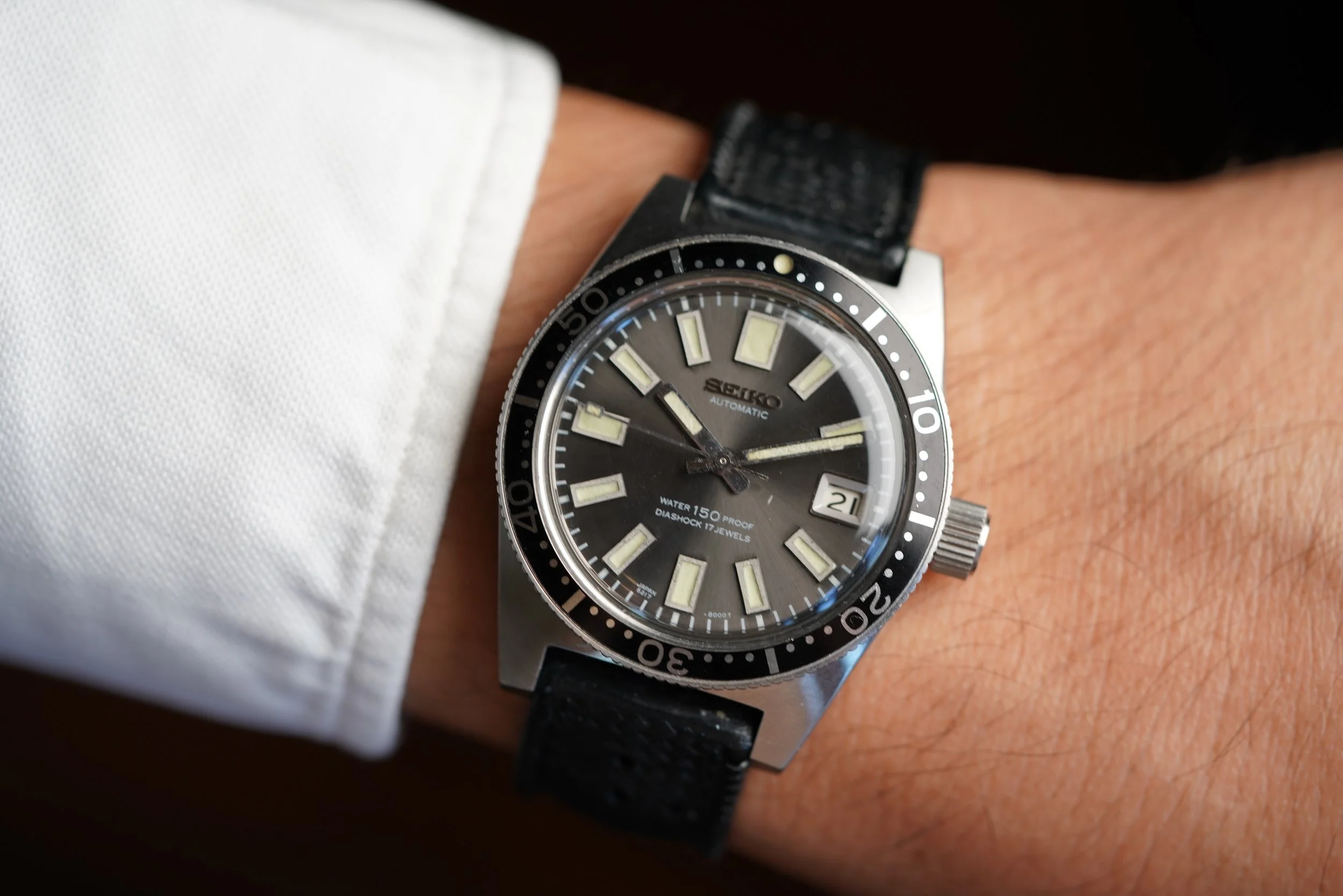 The Seiko 62MAS is one of the most collectible vintage Seiko models. This reference 6217-8001 is a very cool example with grey dial. The case measures 37mm in diameter. The case appears to be unpolished and in NOS condition. it comes with the original strap and buckle with caseback sticker.
