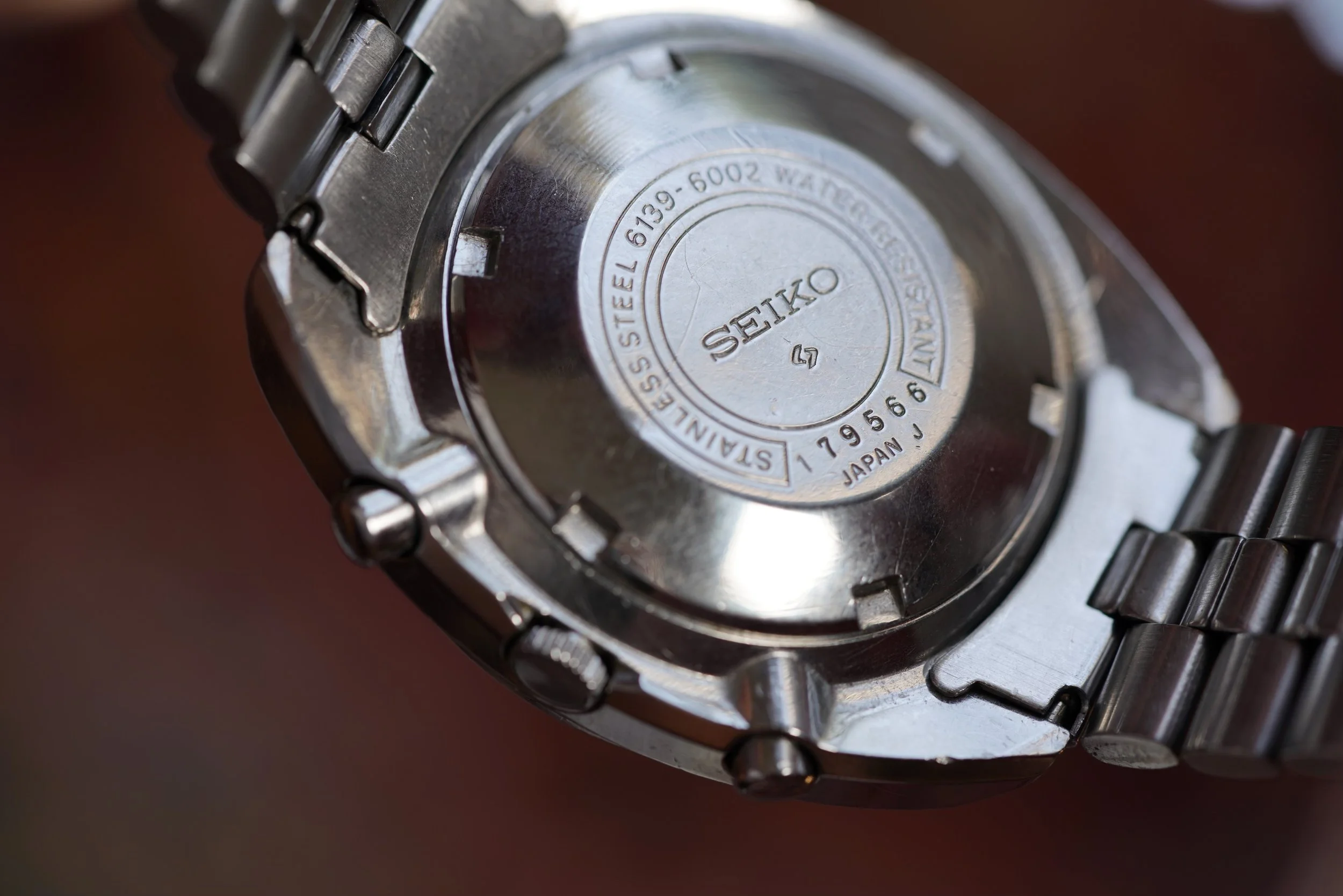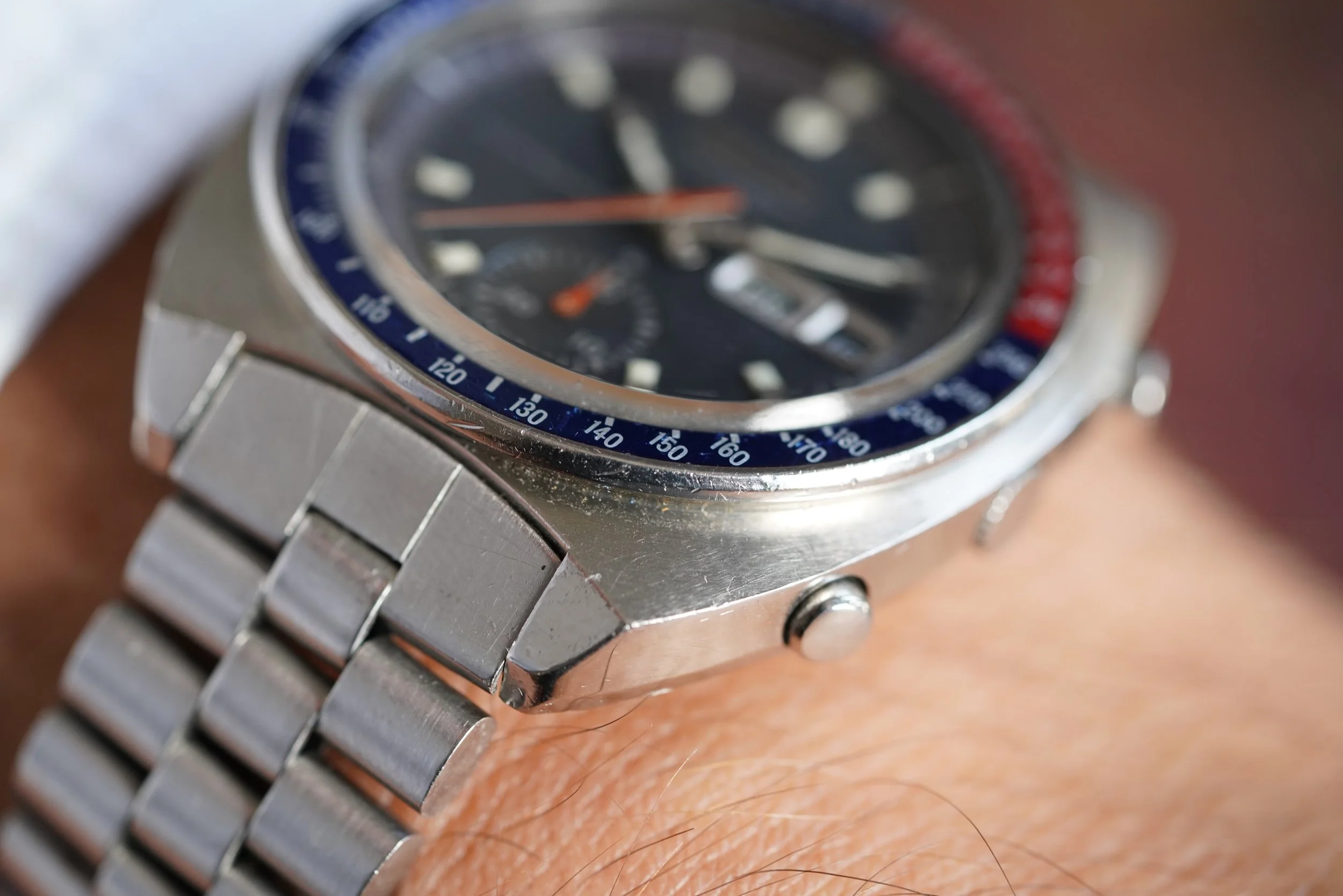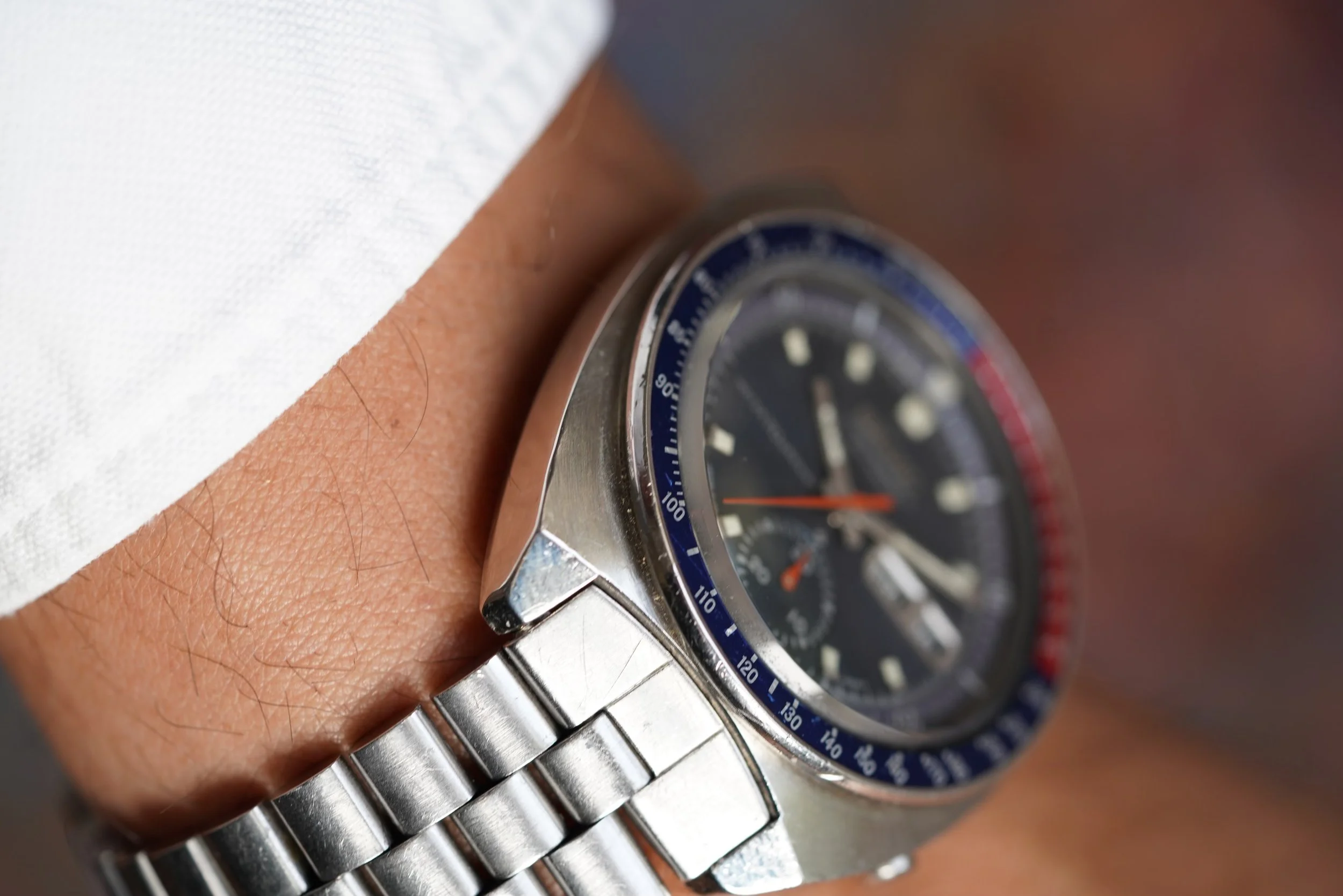 The Seiko “Pogue” chronograph is one of the most interesting and distinctive watches from the 1970s. They have earned the nickname the “Pogue” since Colonel William R. Pogue wore a similar watch during a NASA Skylab mission in 1973, making it the first automatic chronograph to be worn in space. These are wonderful watches on the wrist and very easy to wear. This is a rare “Resist” model, which is one of the earlier Pogues made and similar to the one that Colonel Pogue wore, although Colonel Pogue wore a 6139-6005 “Resist” model and this is a 6139-6030 “Resist” made for the international market. Later “Pogue” models did not have the “Resist” or earlier “Proof” text on the left side to indicate water resistance.