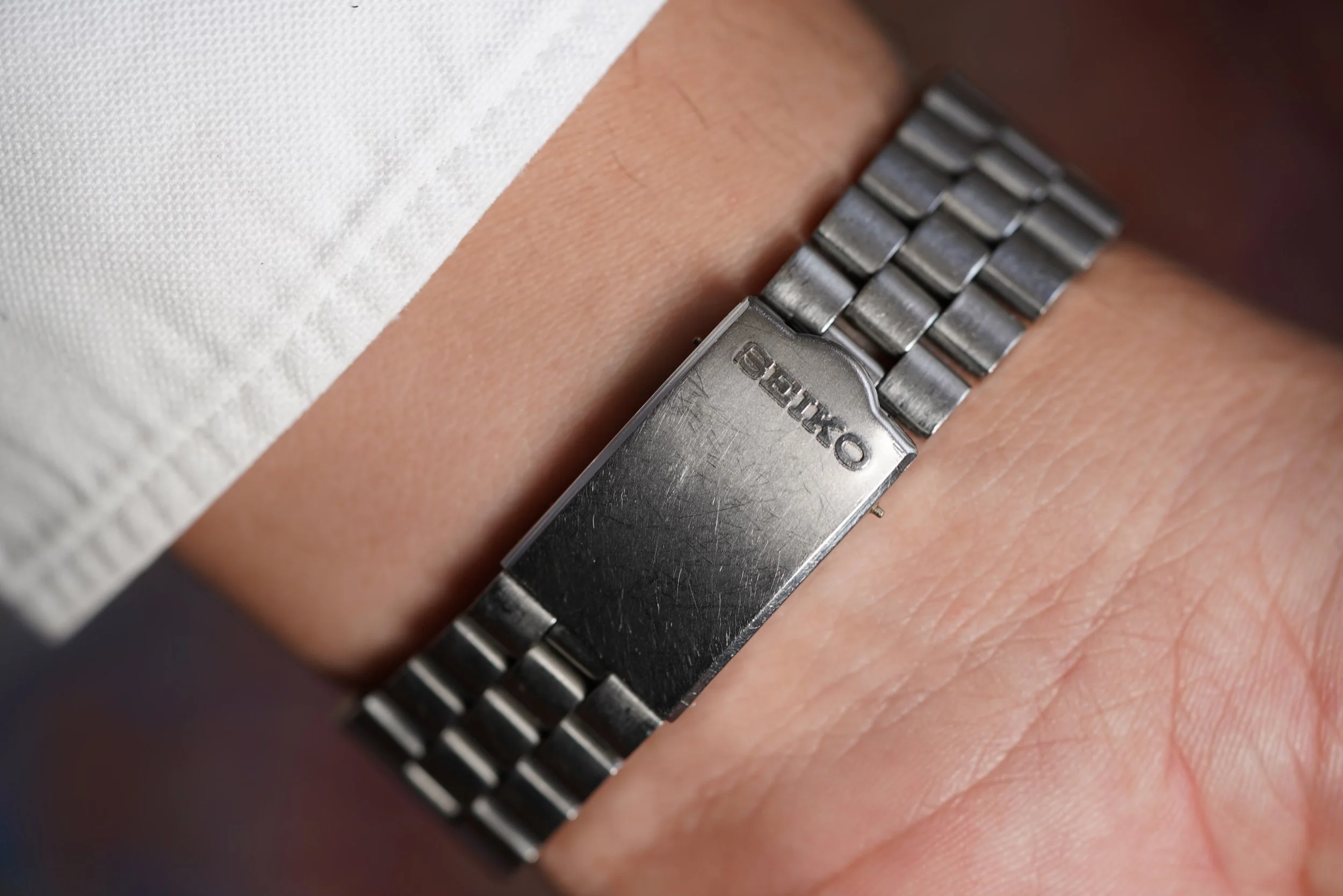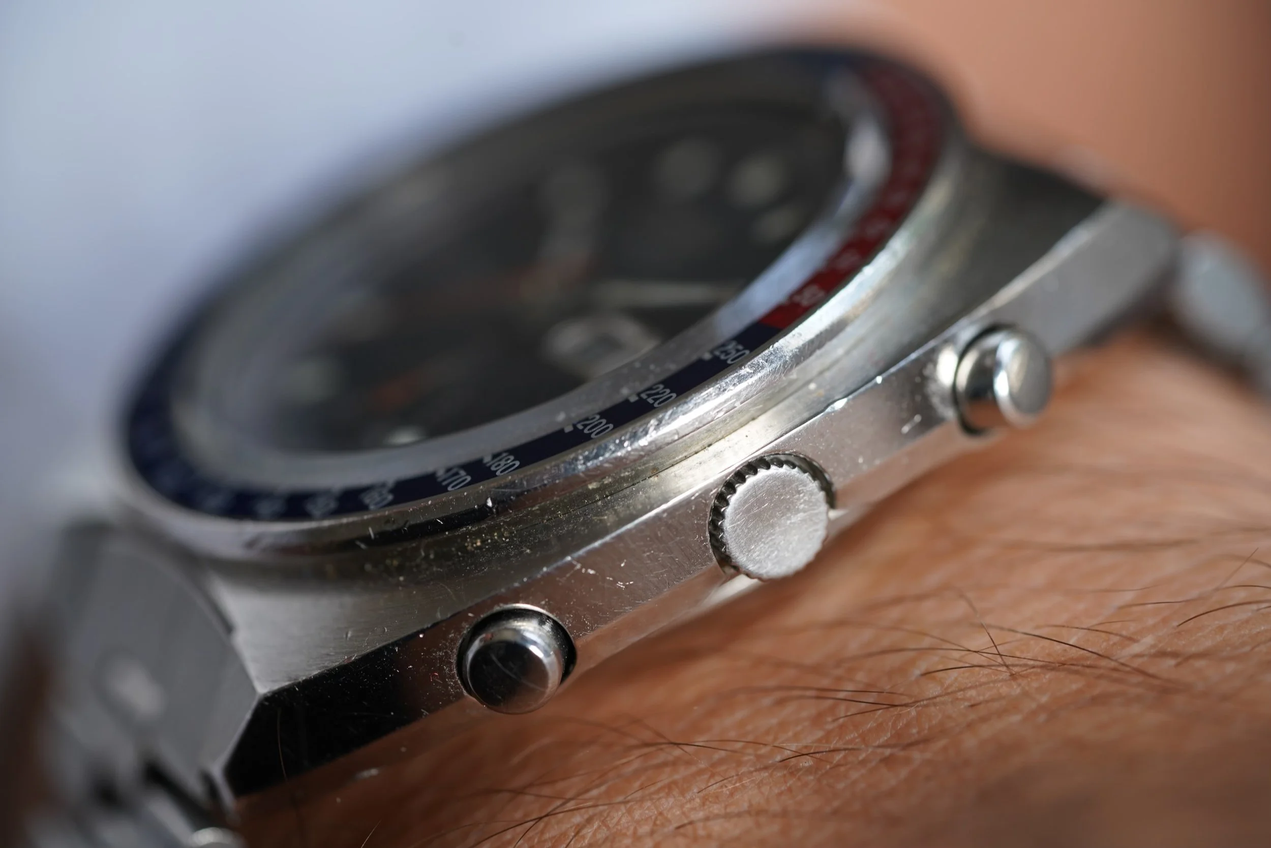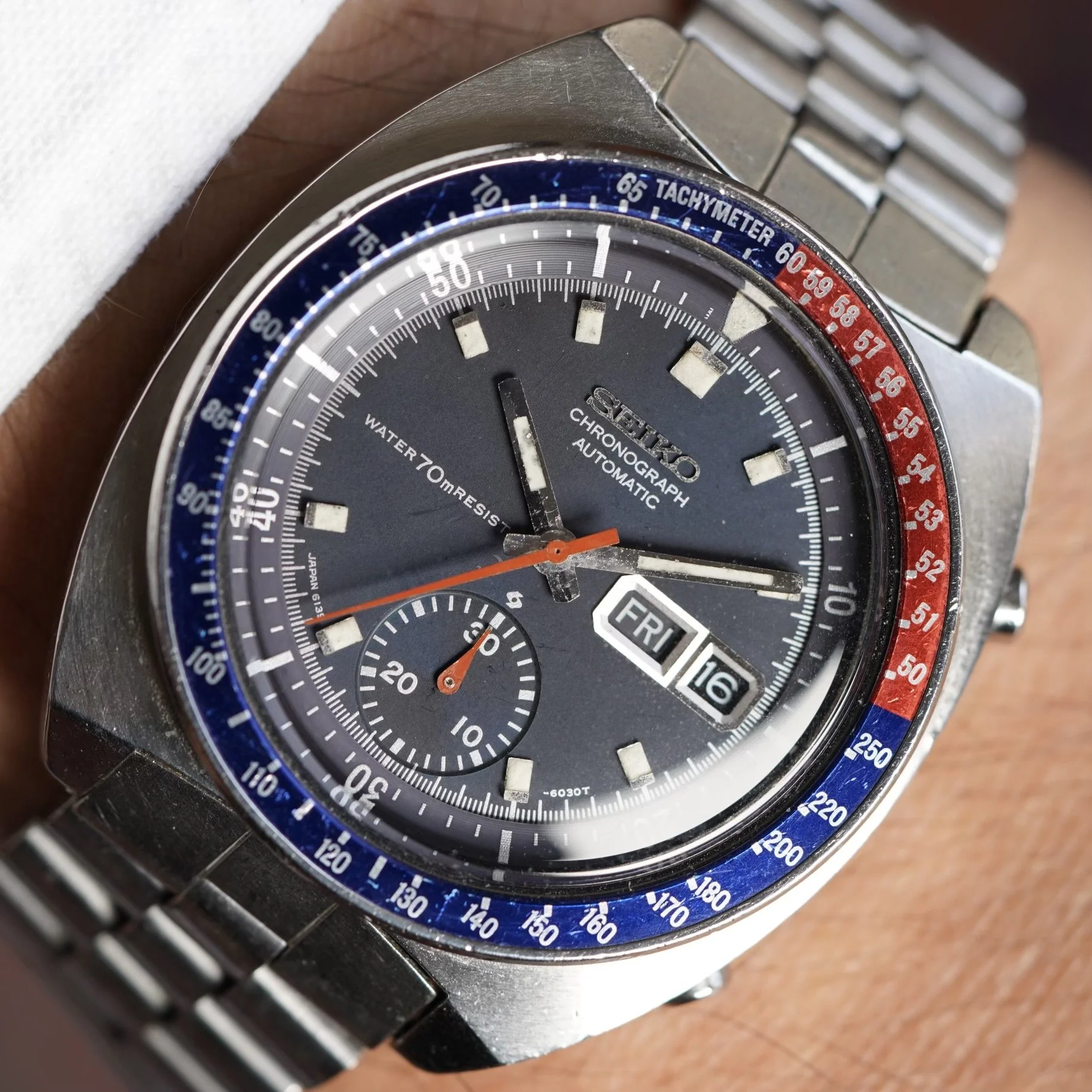 The Seiko “Pogue” chronograph is one of the most interesting and distinctive watches from the 1970s. They have earned the nickname the “Pogue” since Colonel William R. Pogue wore a similar watch during a NASA Skylab mission in 1973, making it the first automatic chronograph to be worn in space. These are wonderful watches on the wrist and very easy to wear. This is a rare “Resist” model, which is one of the earlier Pogues made and similar to the one that Colonel Pogue wore, although Colonel Pogue wore a 6139-6005 “Resist” model and this is a 6139-6030 “Resist” made for the international market. Later “Pogue” models did not have the “Resist” or earlier “Proof” text on the left side to indicate water resistance.