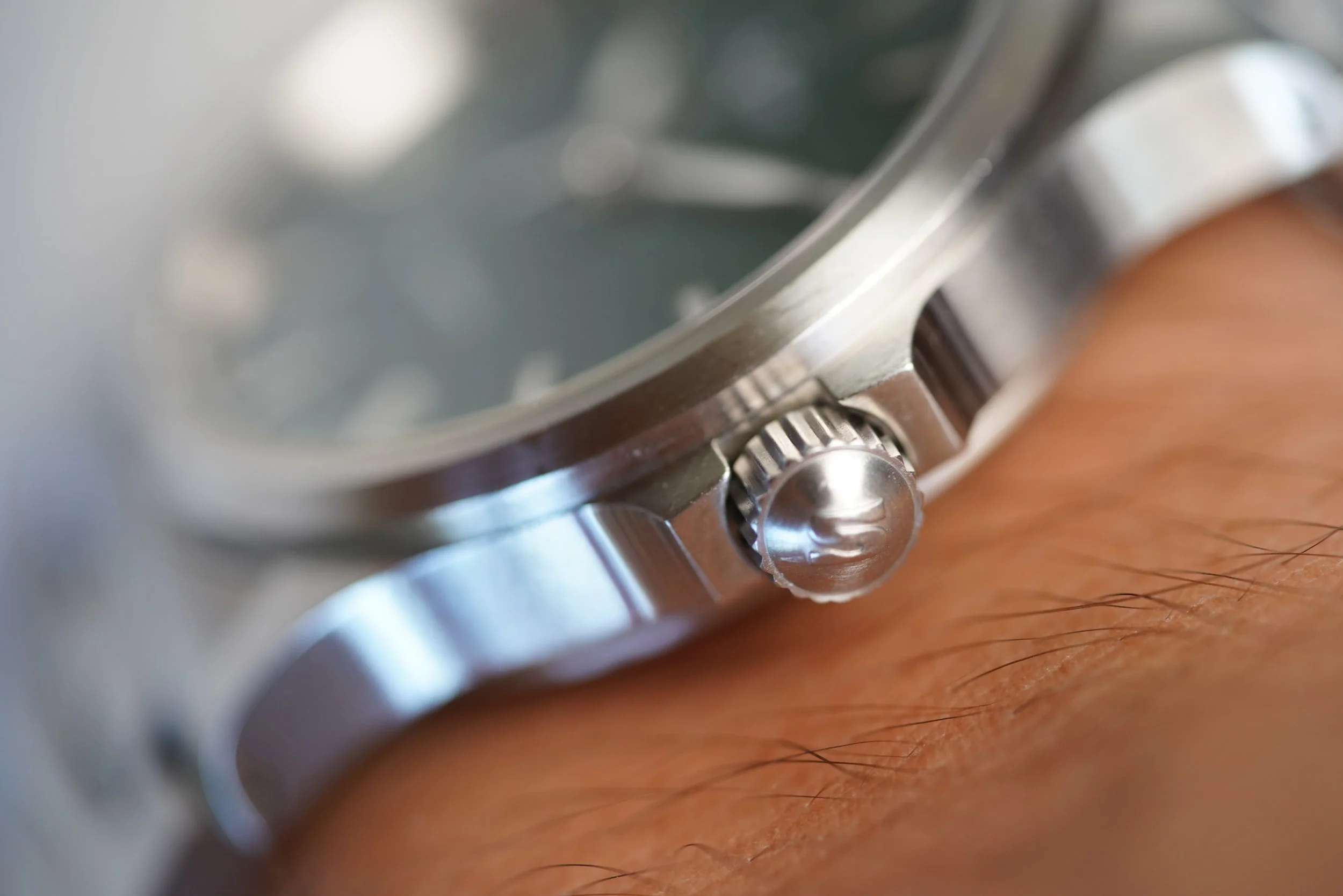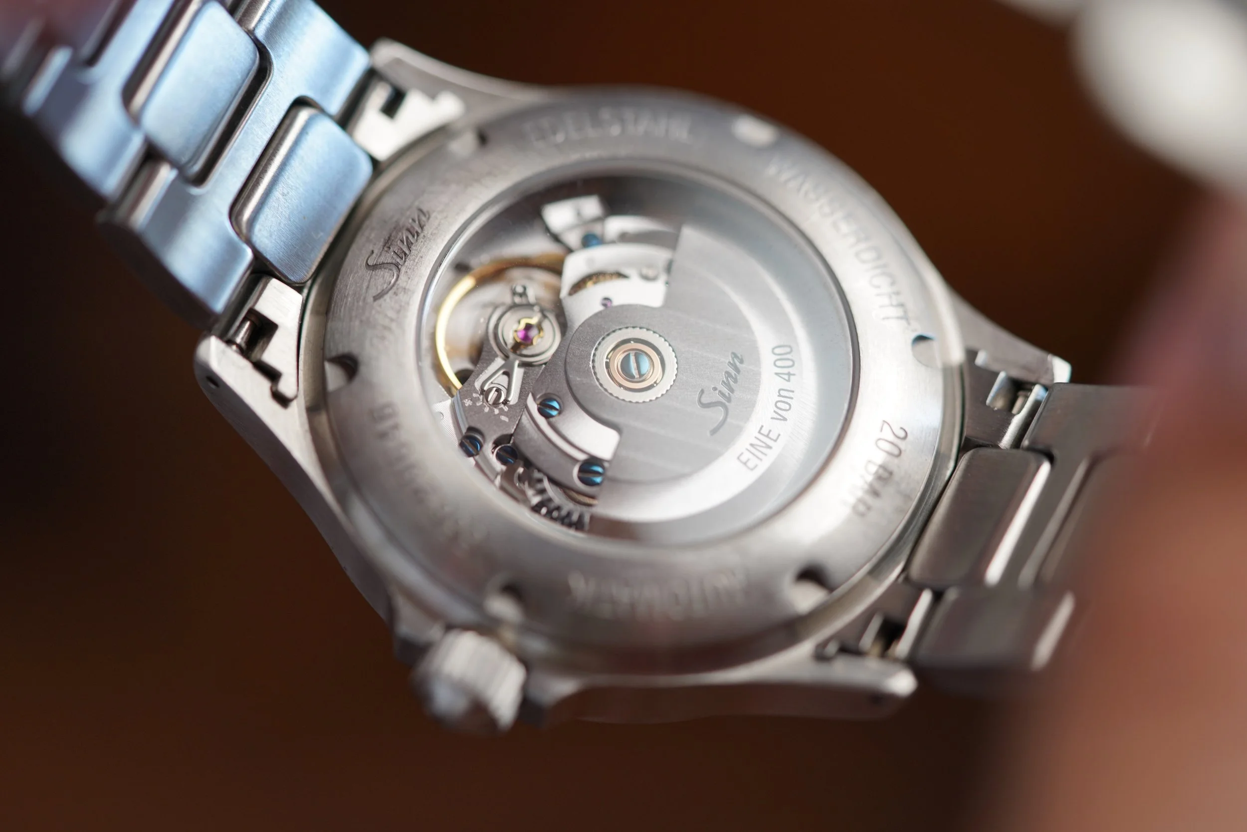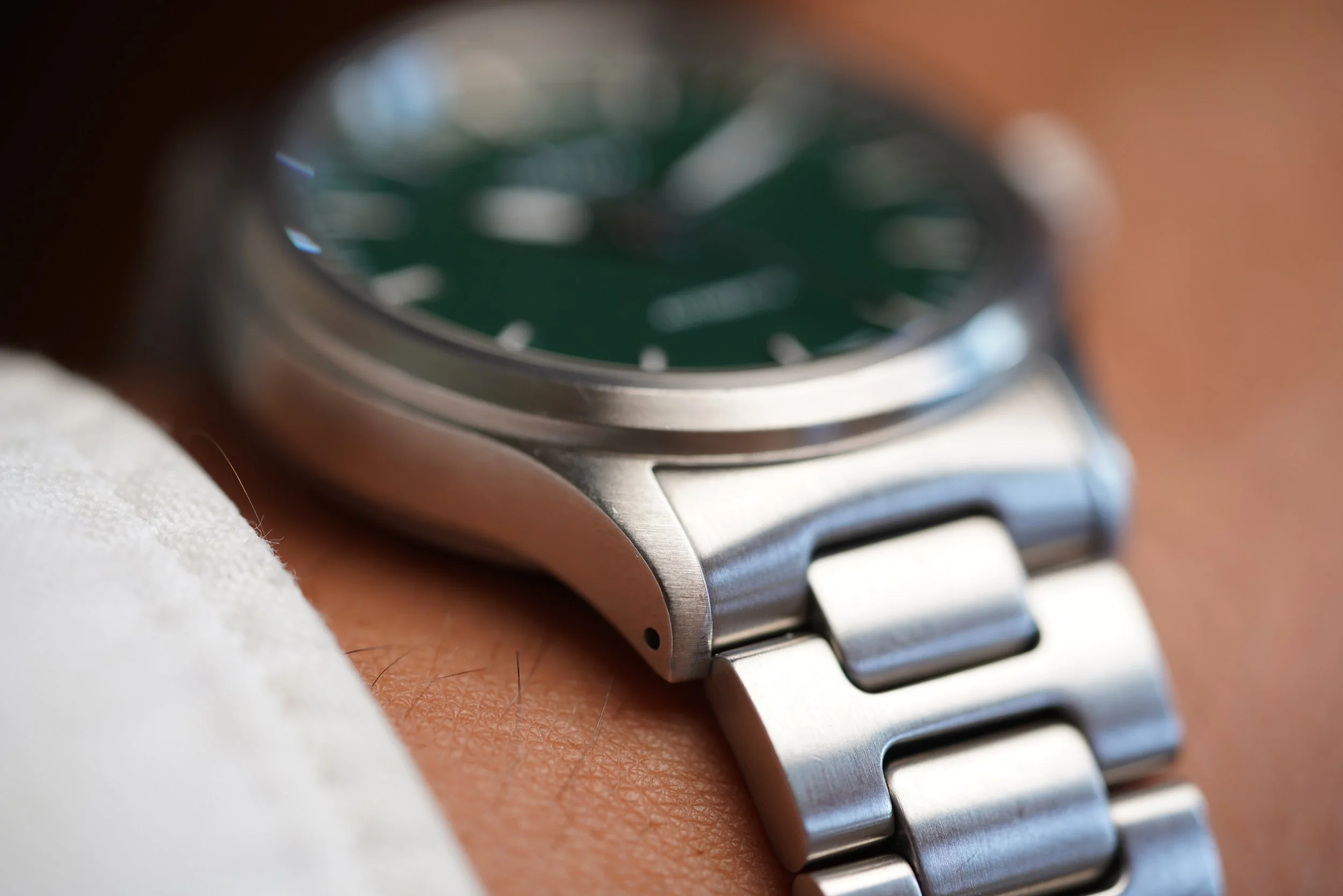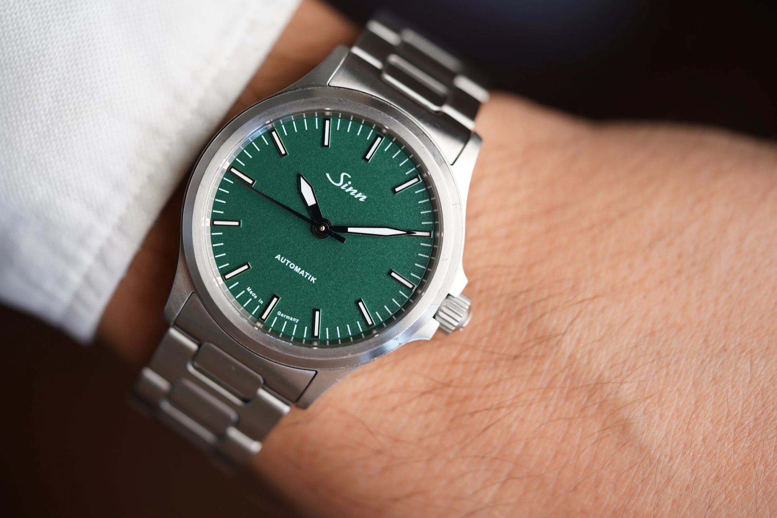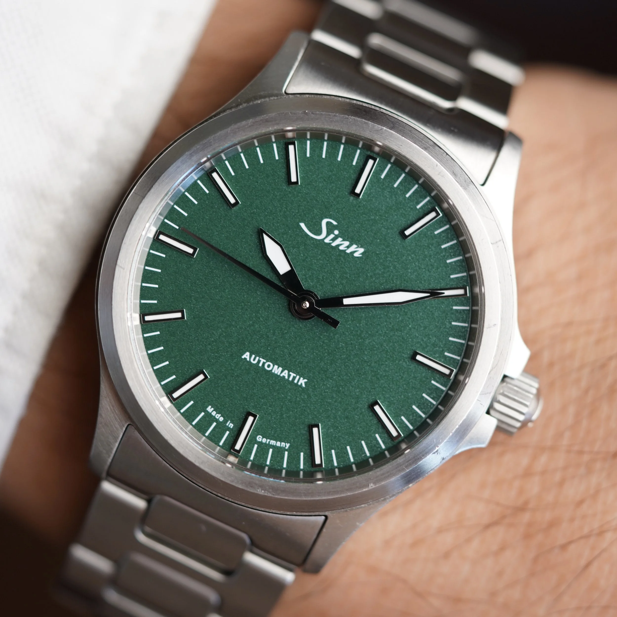 This Sinn ref. 556 is a great stainless steel sports watch that measures 38mm in diameter by 45.5 mm lug-to-lug. This watch is part of a series that paid homage to various gemstones and is one of 400 pieces to feature this Emerald Green color. The dial features hand-applied indexes, and the watch is powered by the automatic SW200-1 movement. It dates to 2022.