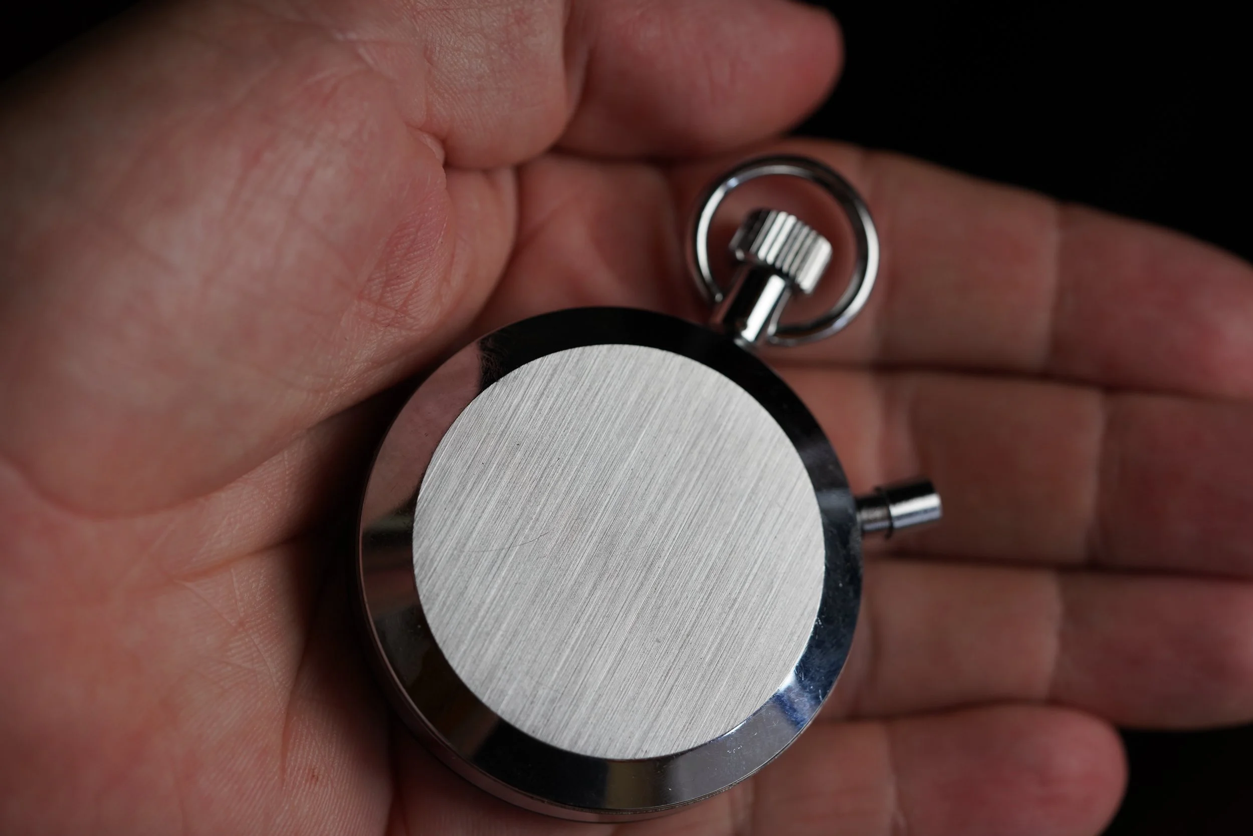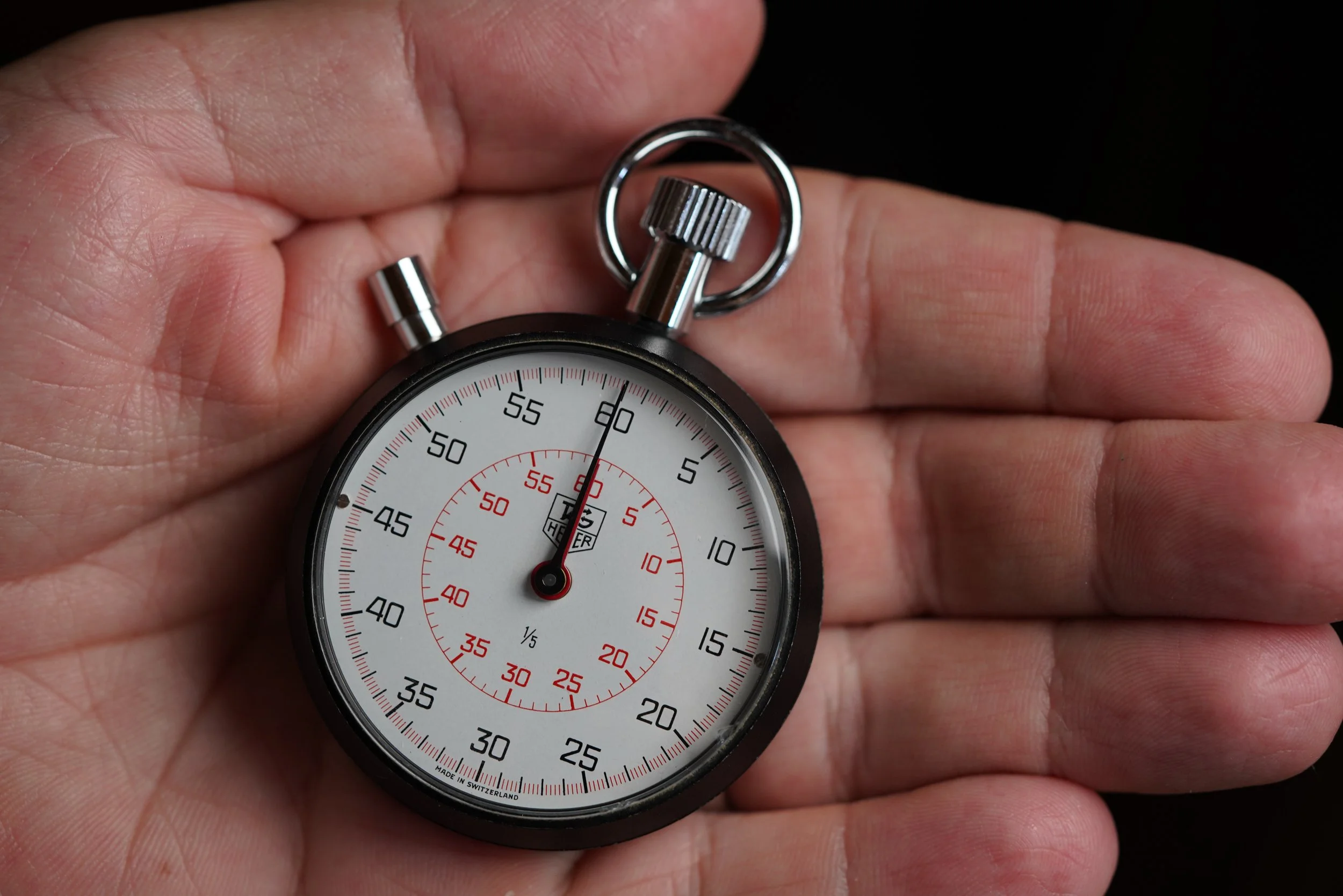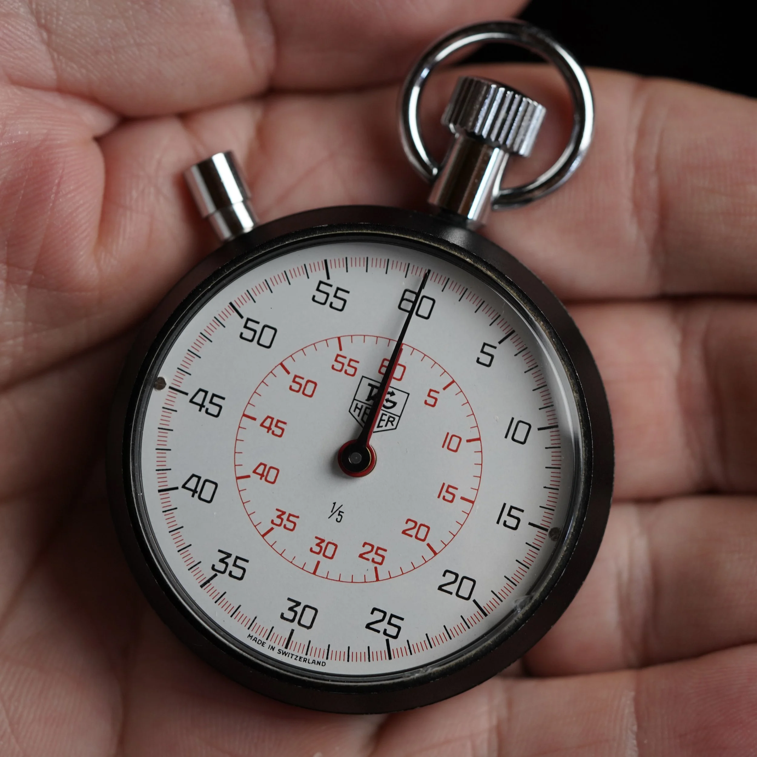 This TAG Heuer stopwatch features a flyback function and tracks elapsed with a 60 minute elapsed minutes hand. It measures 53.5mm in diameter and is 21mm thick. The case is chrome plated. The dial also list ⅕, indicating that the stopwatch measures increments of down to 1/5th of a second.