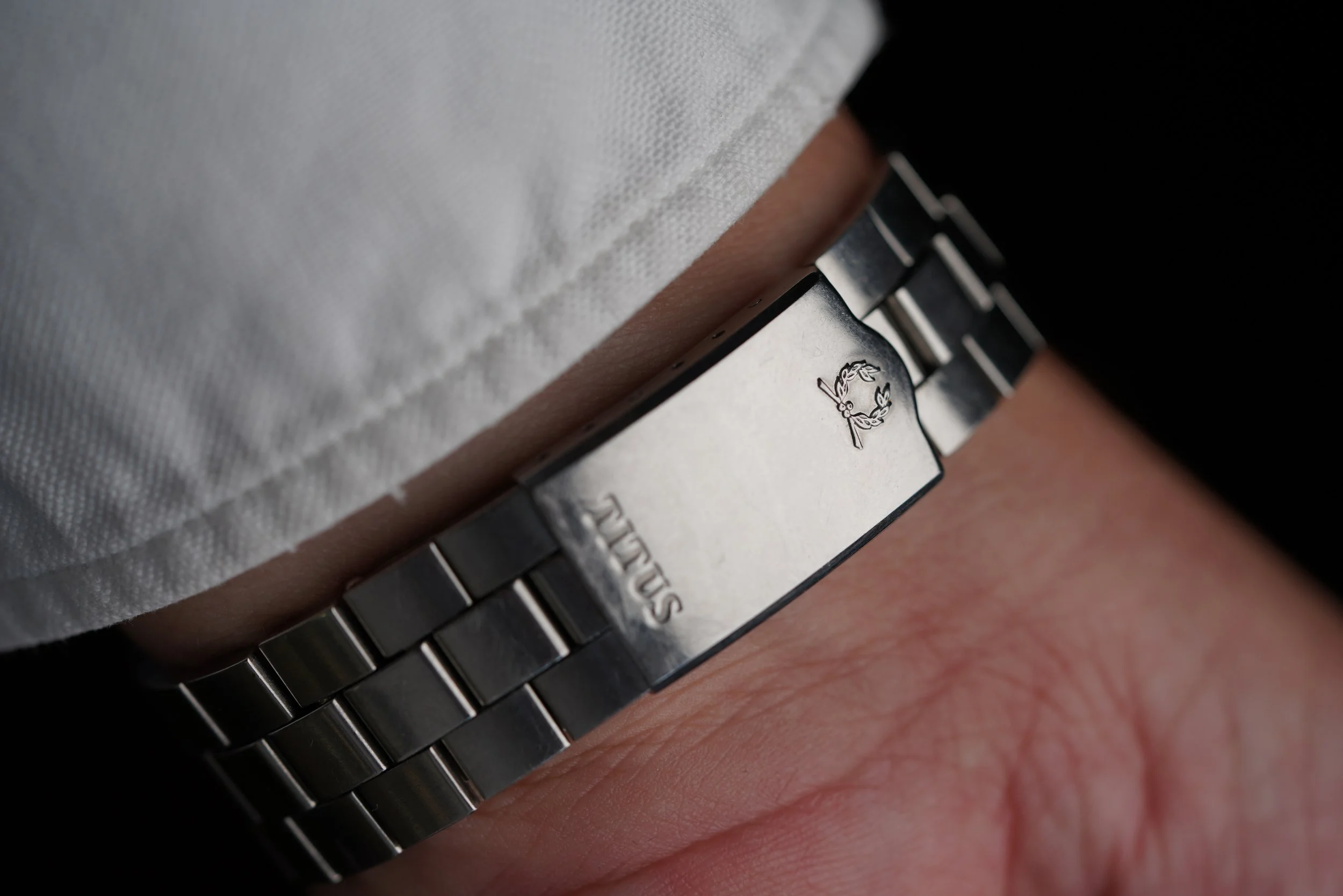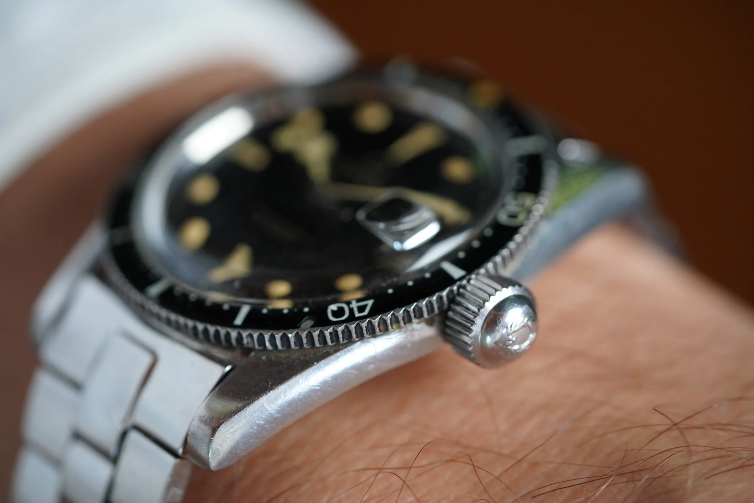This Titus Calypsomatic reference 7840 is an extremely cool vintage dive watch. It is reminiscent of many Rolex Big Crown Submariners and there is a strong collector community for these watches. The watch features the nicest and most attractive glossy dial I have seen on any example. It features warm patina on the hands and markers - which are tritium. This is like wearing a Big Crown without radium! The stainless steel case measures approximately 38mm in diameter (48mm lug-to-lug). The watch comes with an original three link bracelet signed by Titus.