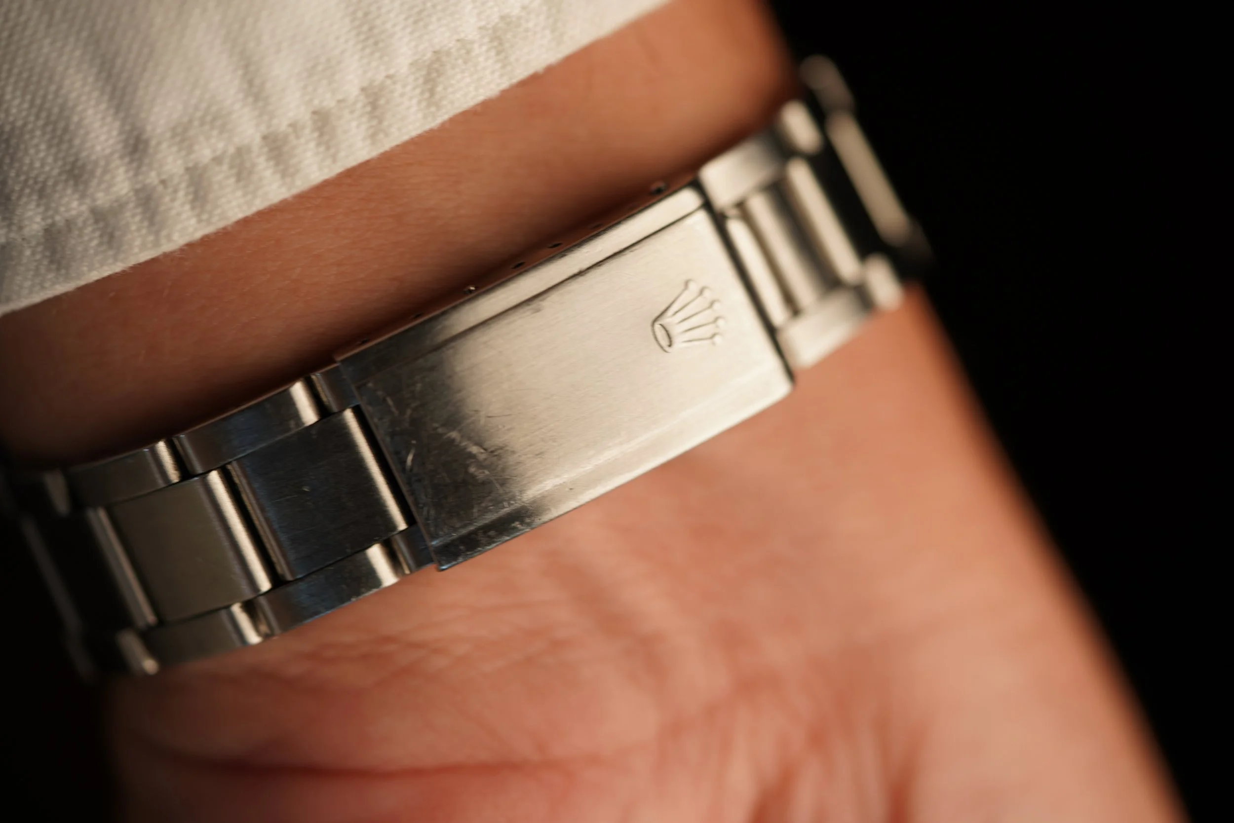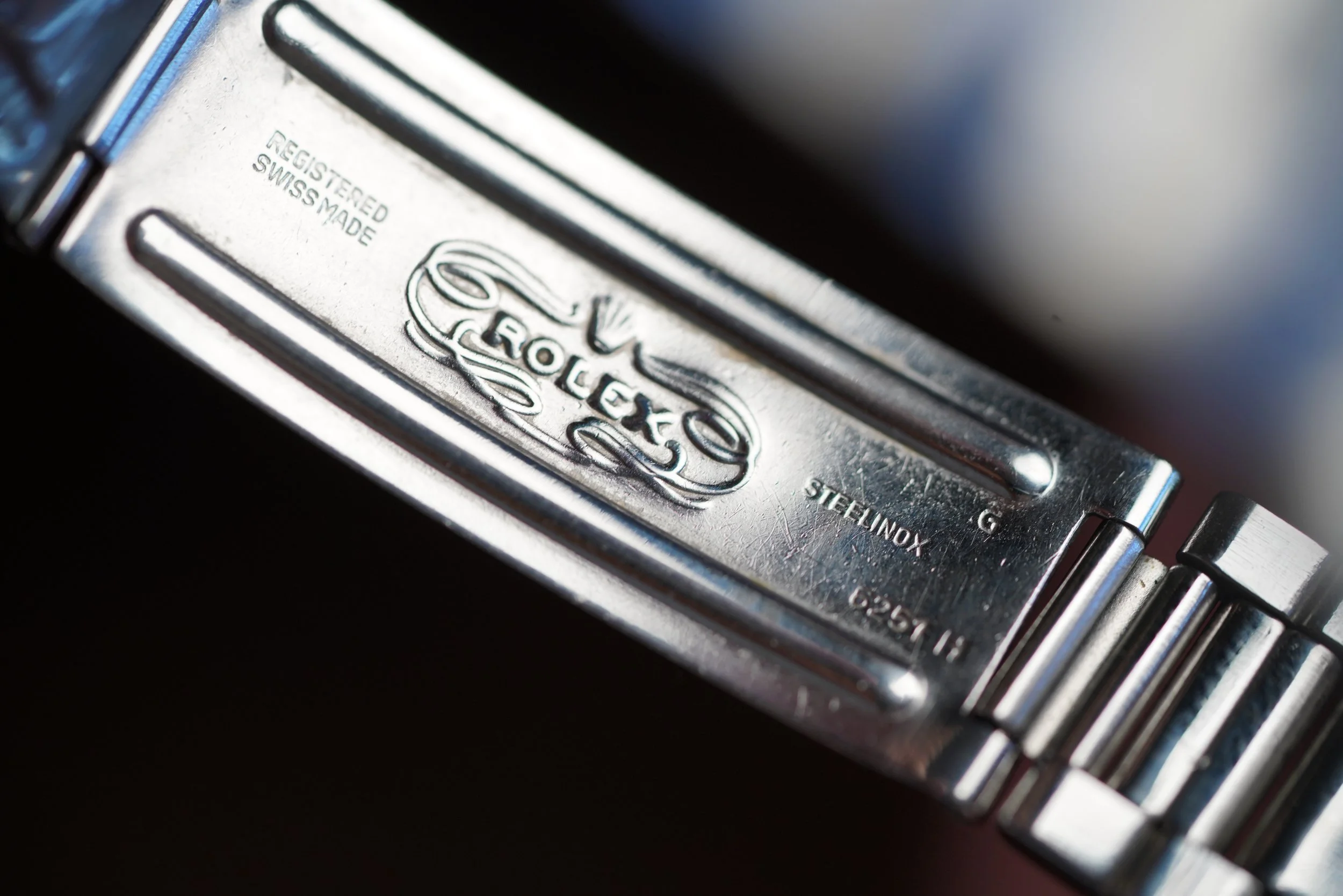 The case appears to be unpolished. The case measures 38mm in diameter (47mm lug-to-lug). The watch is paired on a Rolex 7836 folded-link bracelet with G date code G date code. The bracelet is lightly polished.