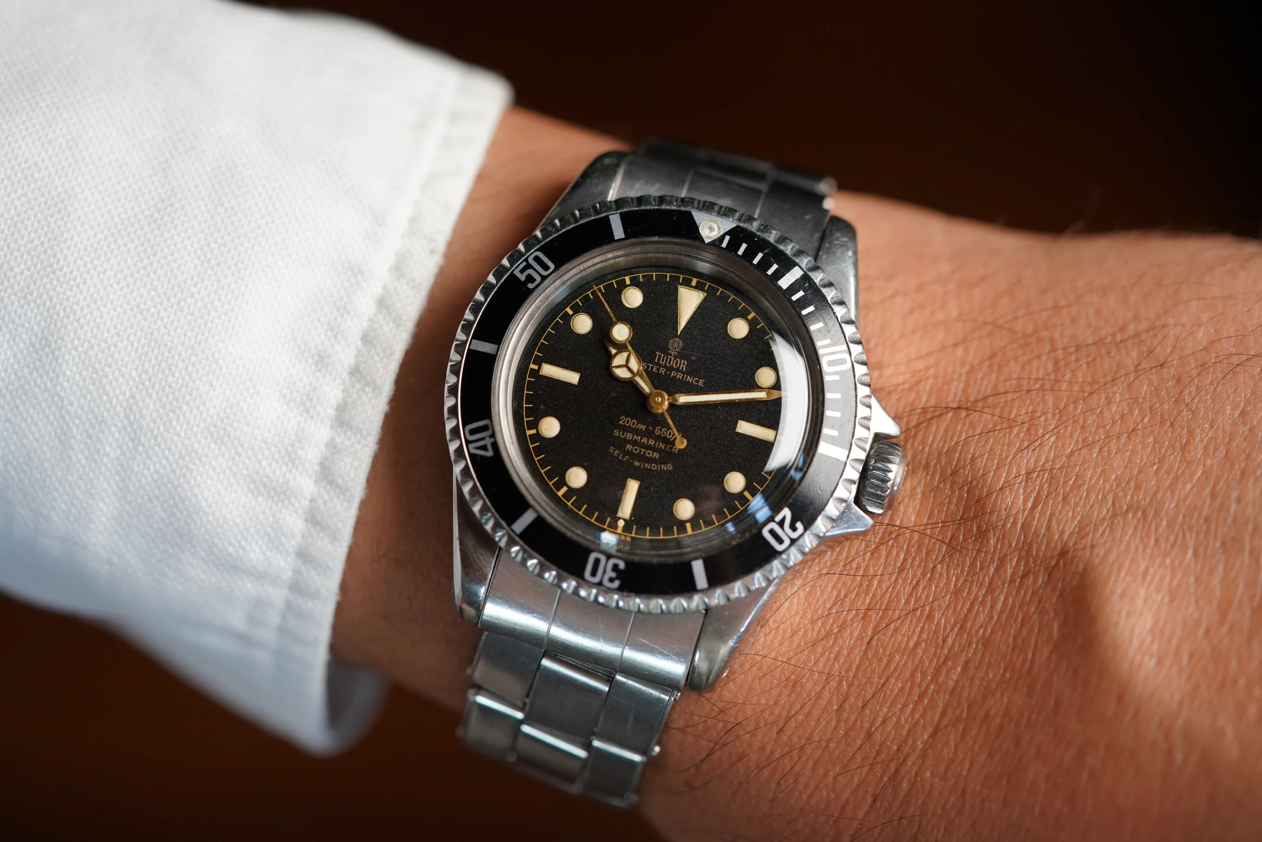 This TUDOR Submariner reference 7928 is a very attractive Submariner. The case production dates to circa 1962 with a 364,xxx serial. It features the PCG (Pointed-Crown-Guards) case design. The dial and lume is very attractive. It features the correct “Long 5” bezel insert and twinlock crown. It is 40mm in diameter and measures 47mm lug to lug. It is paired on a C&I Rolex stretch Rivet bracelet dating to 1961.