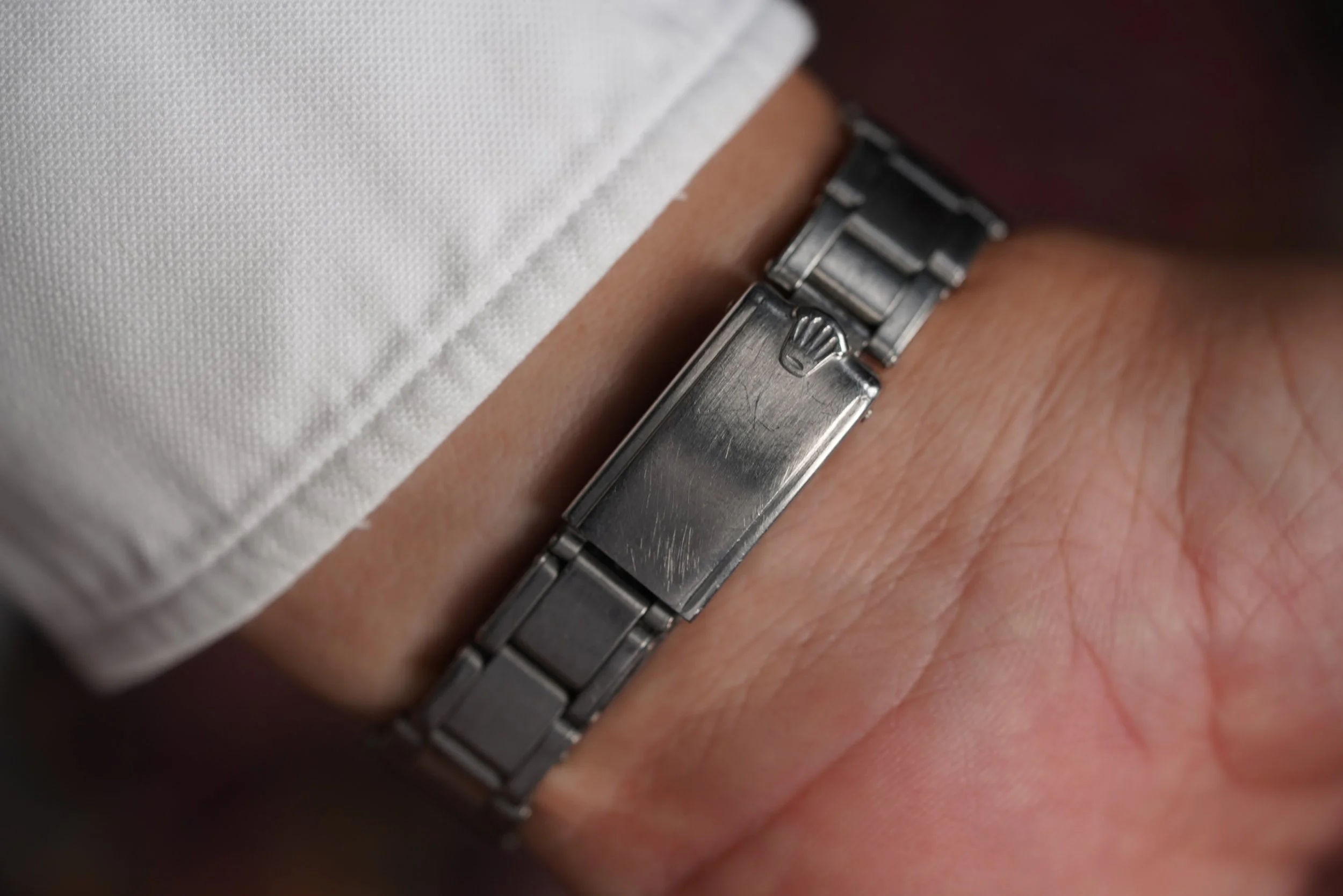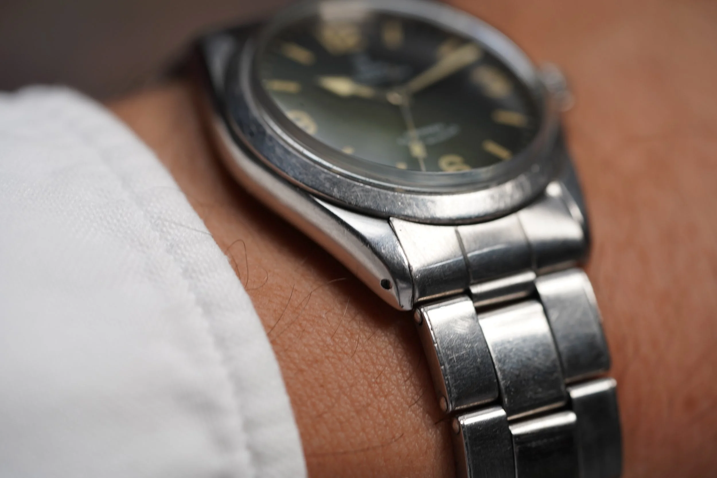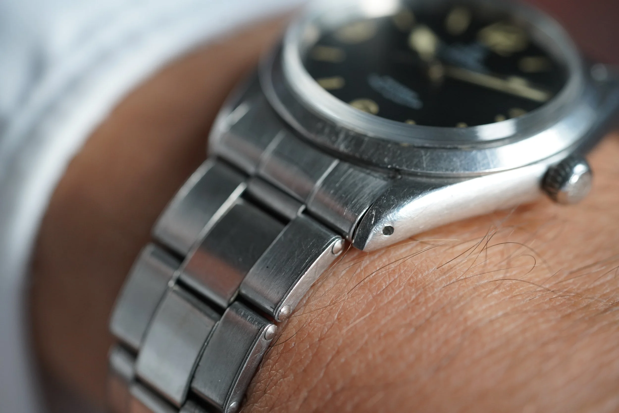 This TUDOR Ranger reference 7995 is a super cool vintage watch. I love these rare no-date models with the “smiley” automatic font. It features a beautiful TUDOR “Rose” logo which collectors go crazy for. The case is lightly polished. The watch measures 34mm in diameter. It dates to circa 1966 with a 0.541M serial. It is paired on a period correct bracelet dating to 1970. The hands are possibly relumed and glow a tad bit longer under UV.