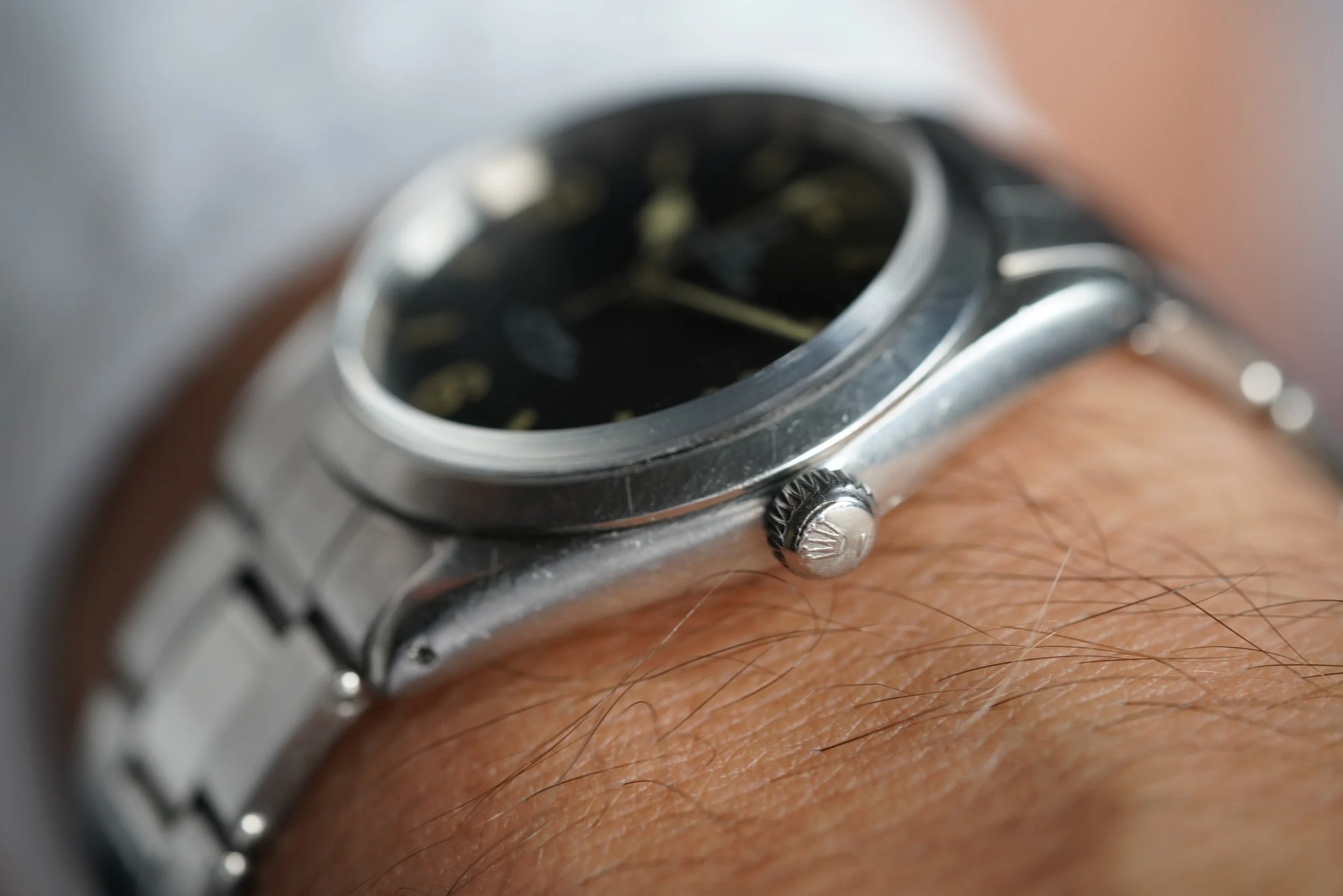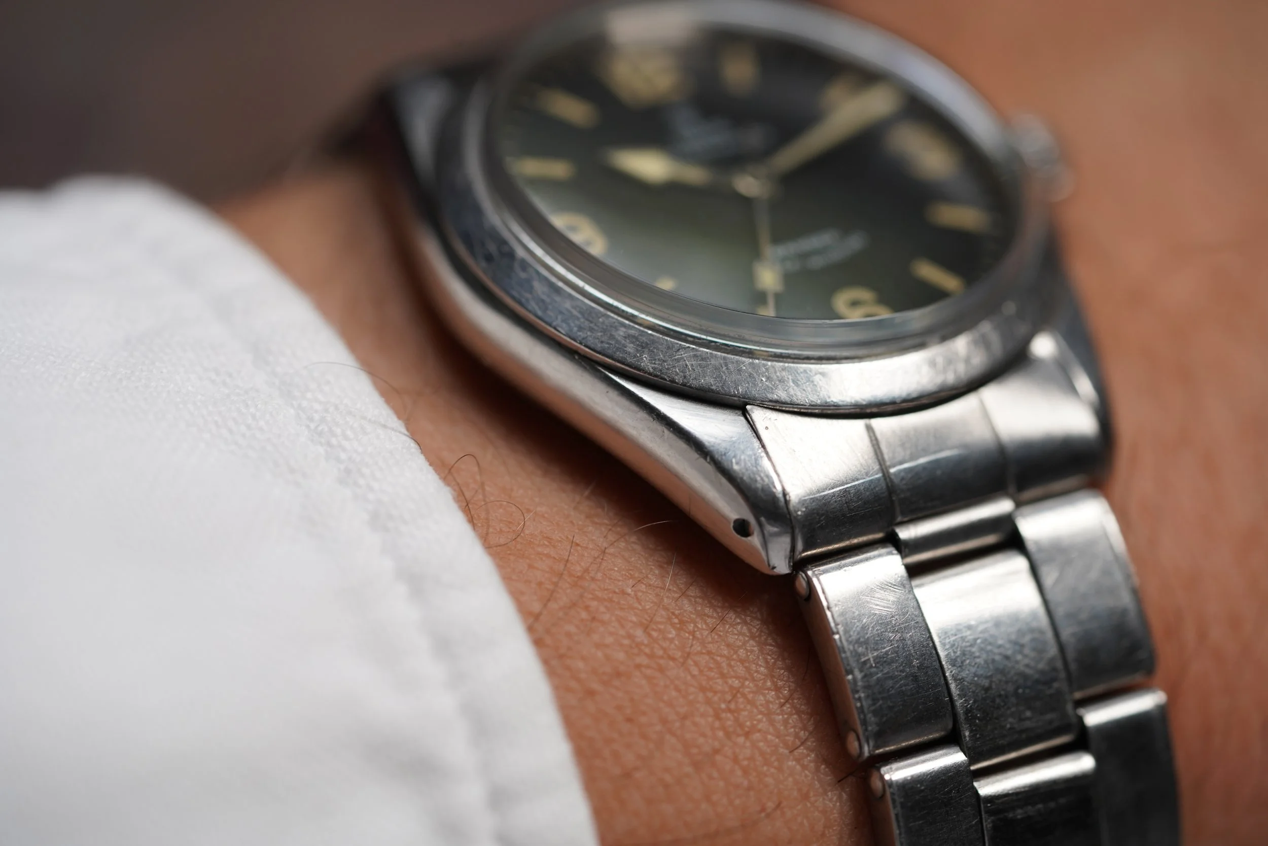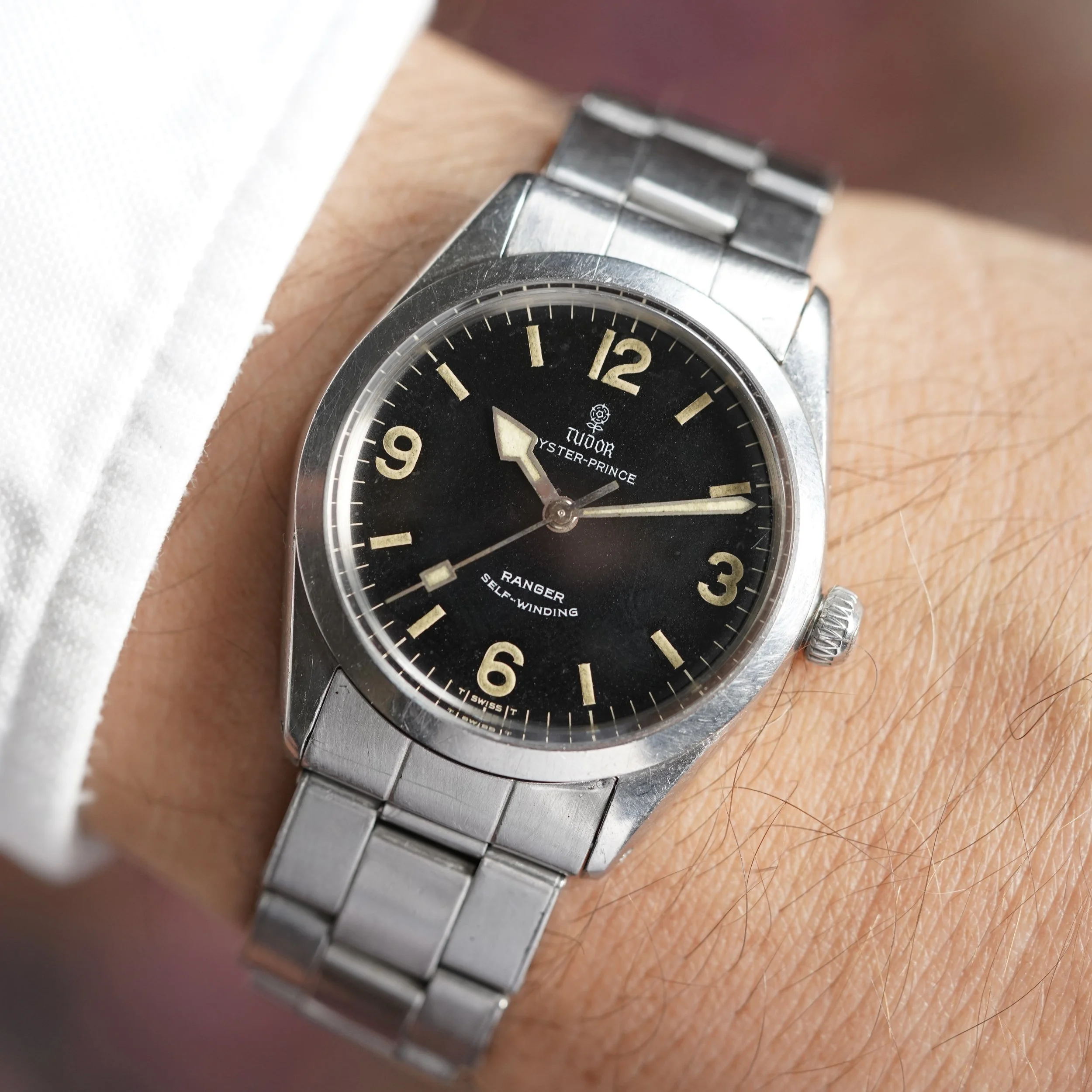 This TUDOR Ranger reference 7995 is a super cool vintage watch. I love these rare no-date models with the “smiley” automatic font. It features a beautiful TUDOR “Rose” logo which collectors go crazy for. The case is lightly polished. The watch measures 34mm in diameter. It dates to circa 1966 with a 0.541M serial. It is paired on a period correct bracelet dating to 1970. The hands are possibly relumed and glow a tad bit longer under UV.