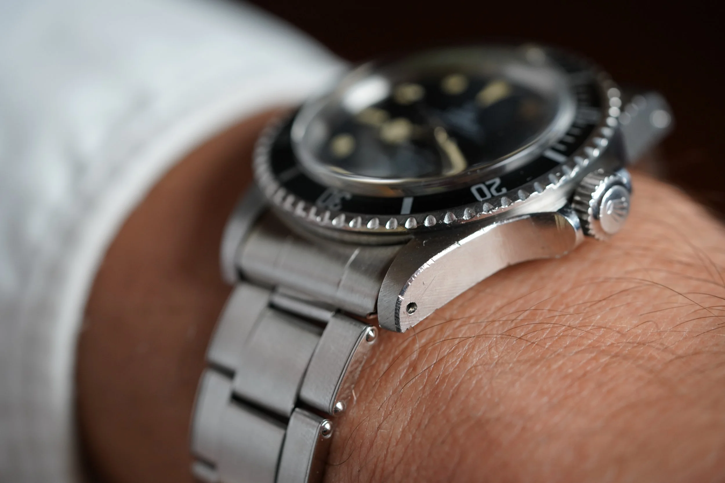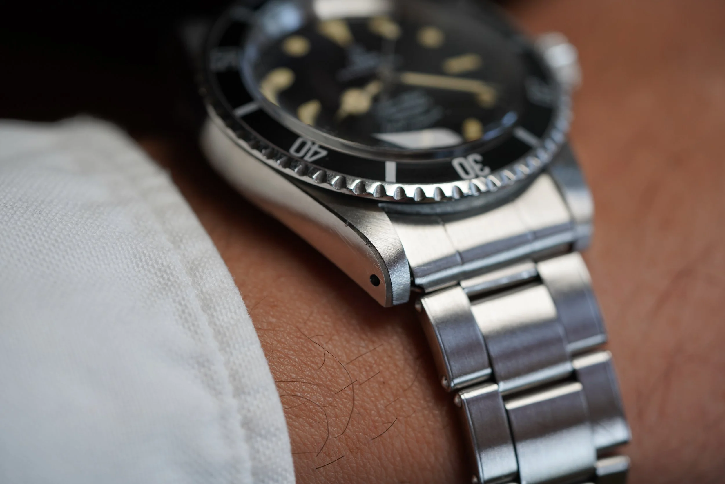 This is a rare TUDOR Submariner reference 7928 with a gilt-glossy dial only found in examples from 1966. It measures 40mm in diameter (47mm lug-to-lug). The original tritium lume has taken a nice patina, and dial is in great shape. The 568,XXX serial number dates to circa 1966. It is paired with a Rolex Gay Frères bracelet dating to 1966 as well. The case has been polished but is attractive.