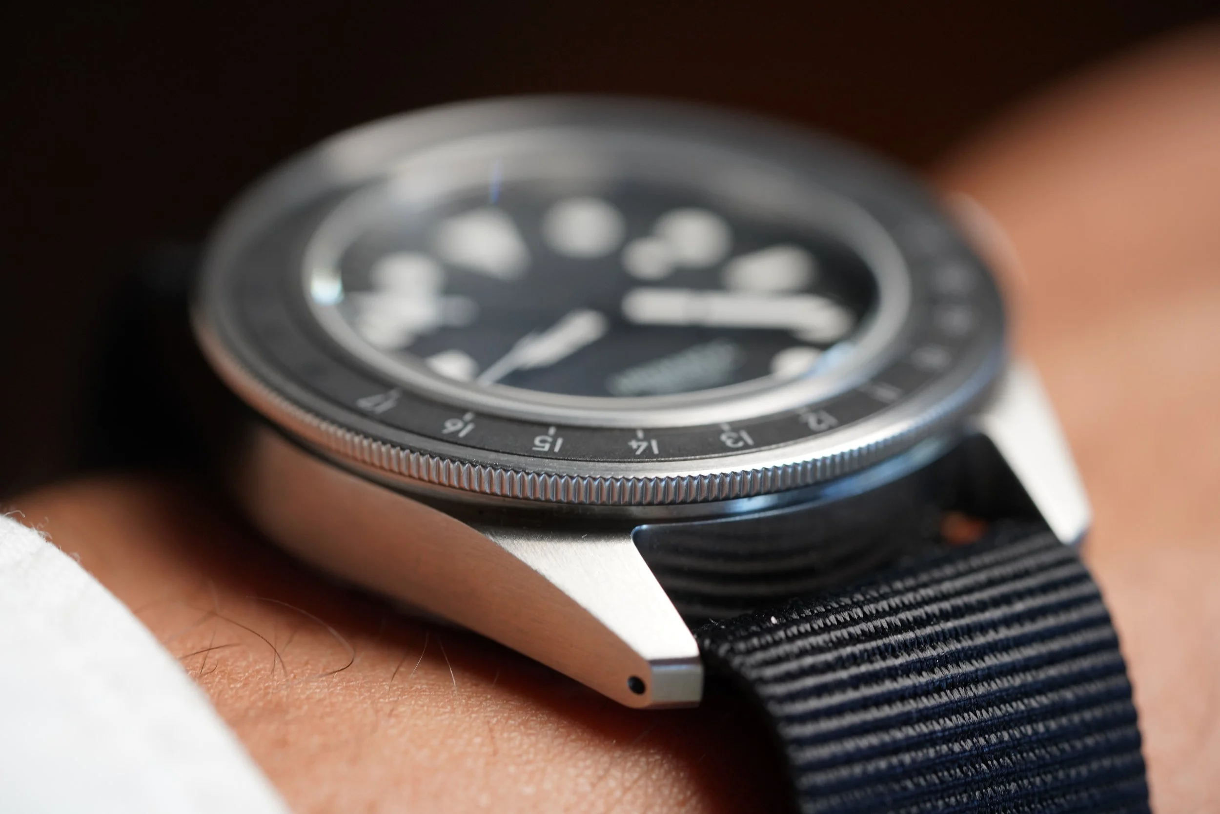 This collaboration with Hodinkee marks Unimatic’s first-ever GMT reference! The watch is stainless steel and measures 41mm in diameter and approximately 49mm lug to lug. It has a unidirectional rotating 24-hour bezel and a black-luminous dial. The watch is powered by the automatic Swiss movement, the Sellita SW330-2. The watch was produced along with two other references, the U2-H and the U1-H, each of which was only produced in 500 examples.