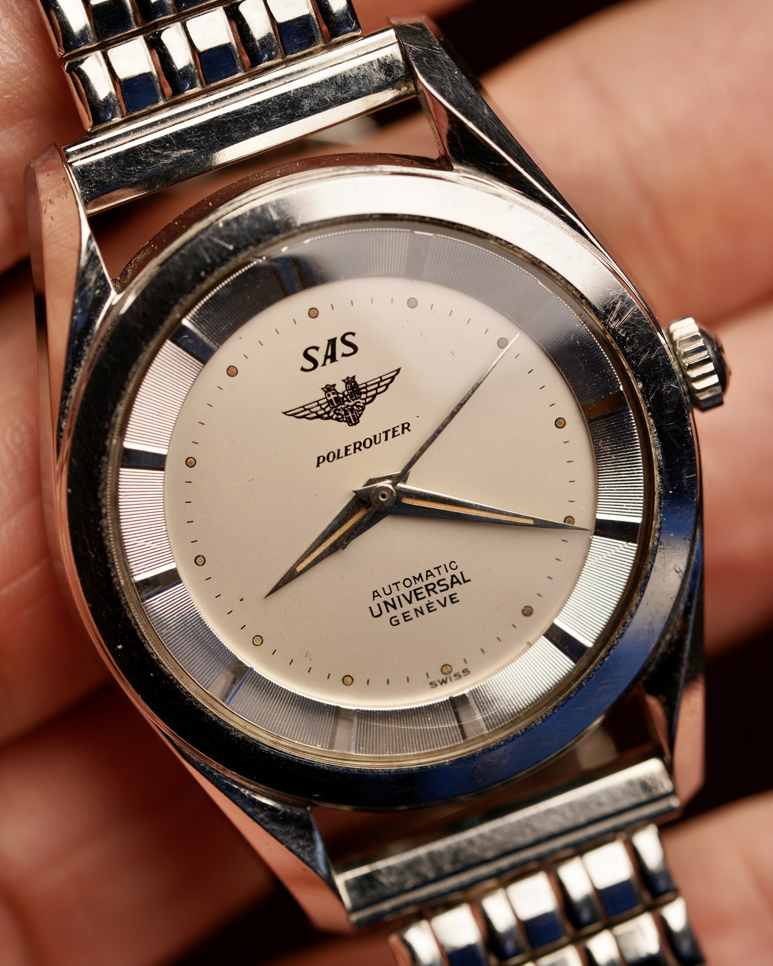 This is a rare example of a Universal Genève Polerouter manufactured for SAS (Scandanavian Airlines Systems) for use on polar flights from Copenhagen to Los Angeles starting from 1954. The watch was designed by horological legend Gérald Genta. The silver, luminous dial features a radial groove-patterned outer disc inset with the hour-markers, as well as luminous dauphine hands. The case is stainless steel with the classic lyre (twisted) lugs. The case was made by Huguenin Freres and bears a resemblance to later Speedmaster Professional cases also made by Huguenin Freres.