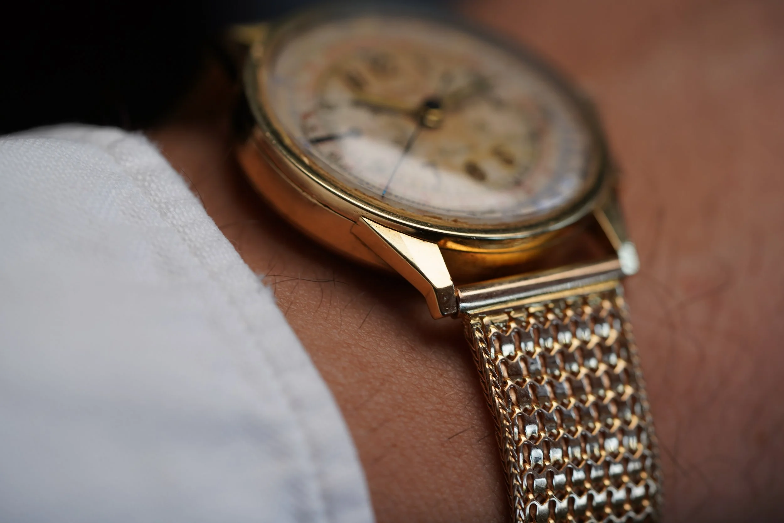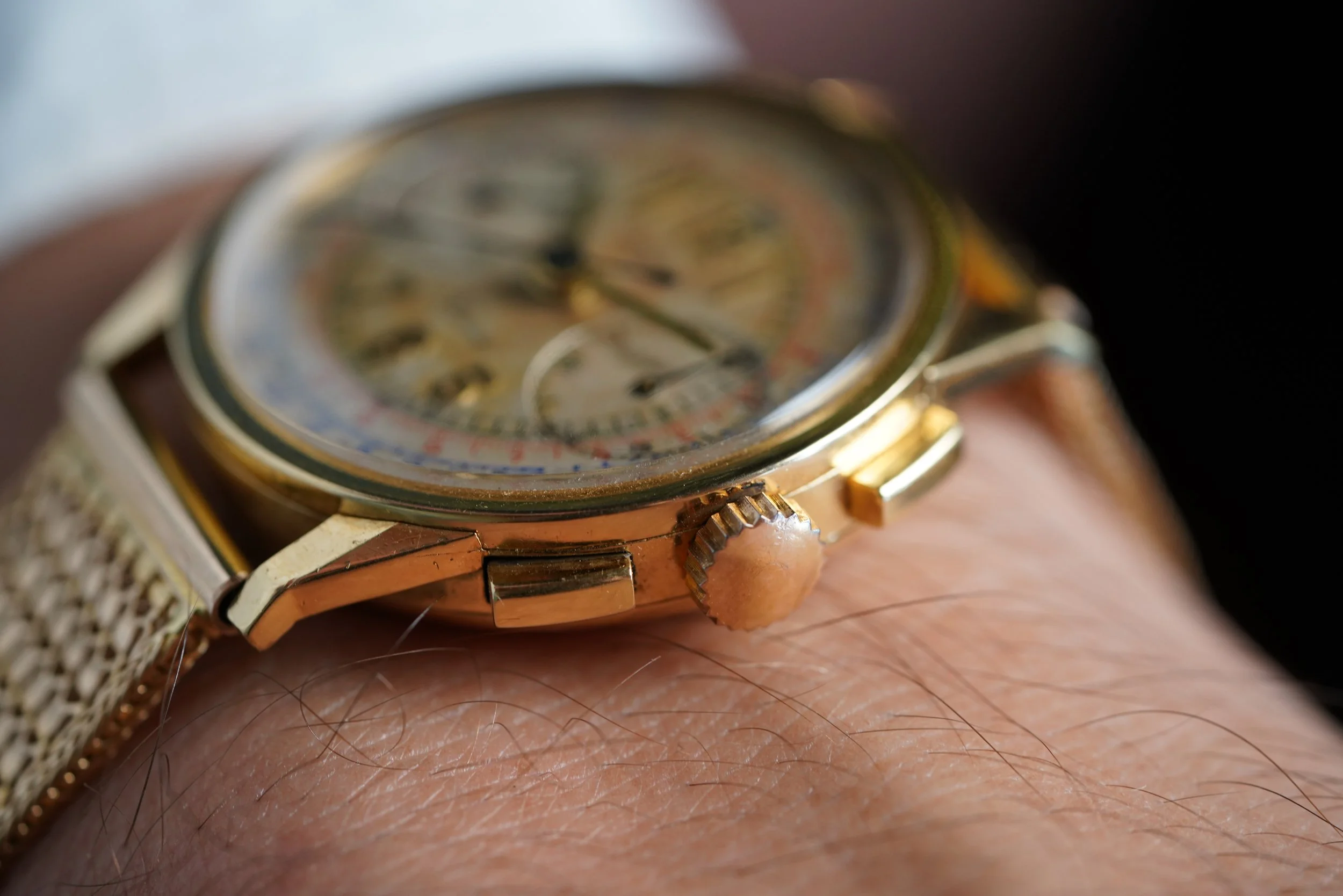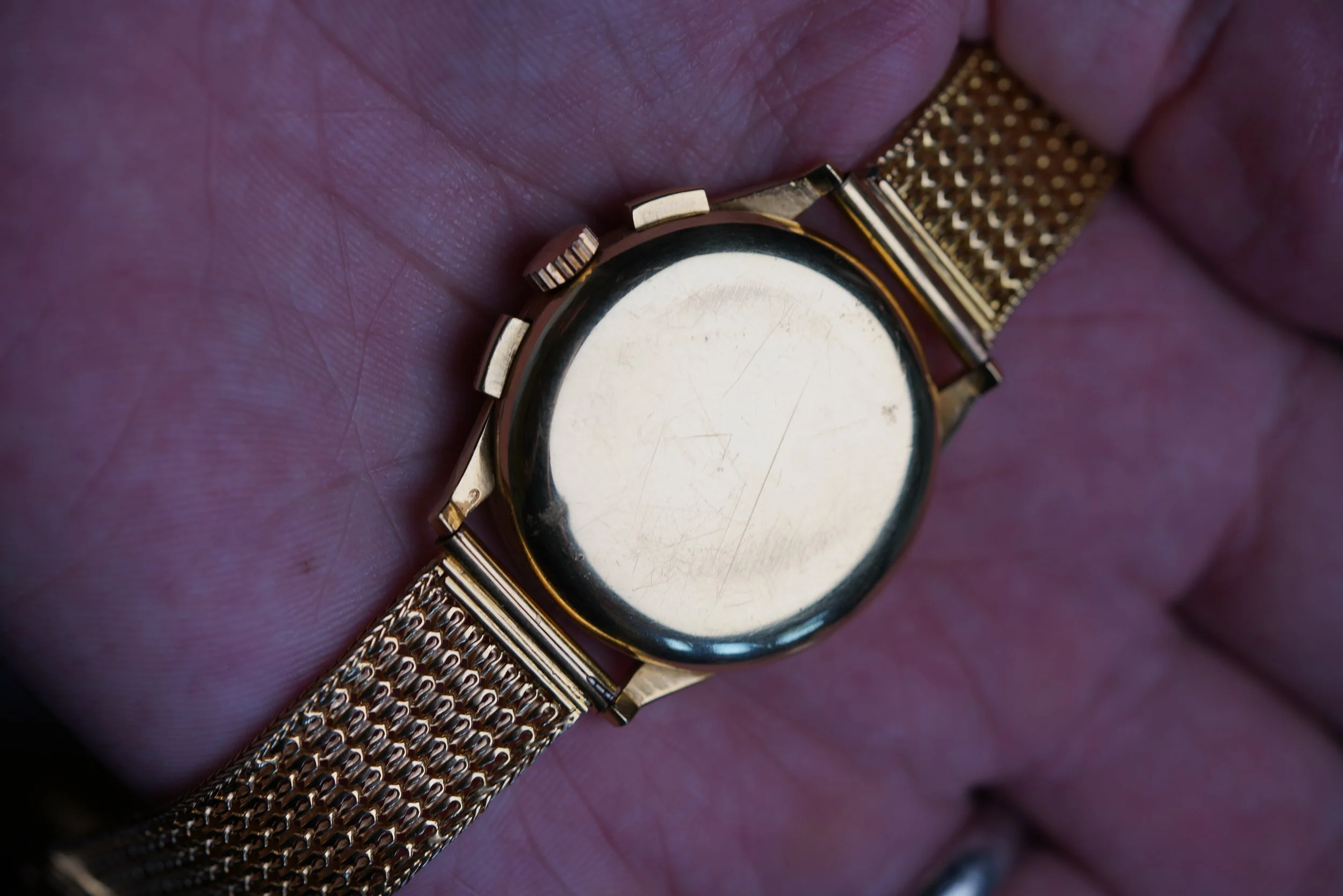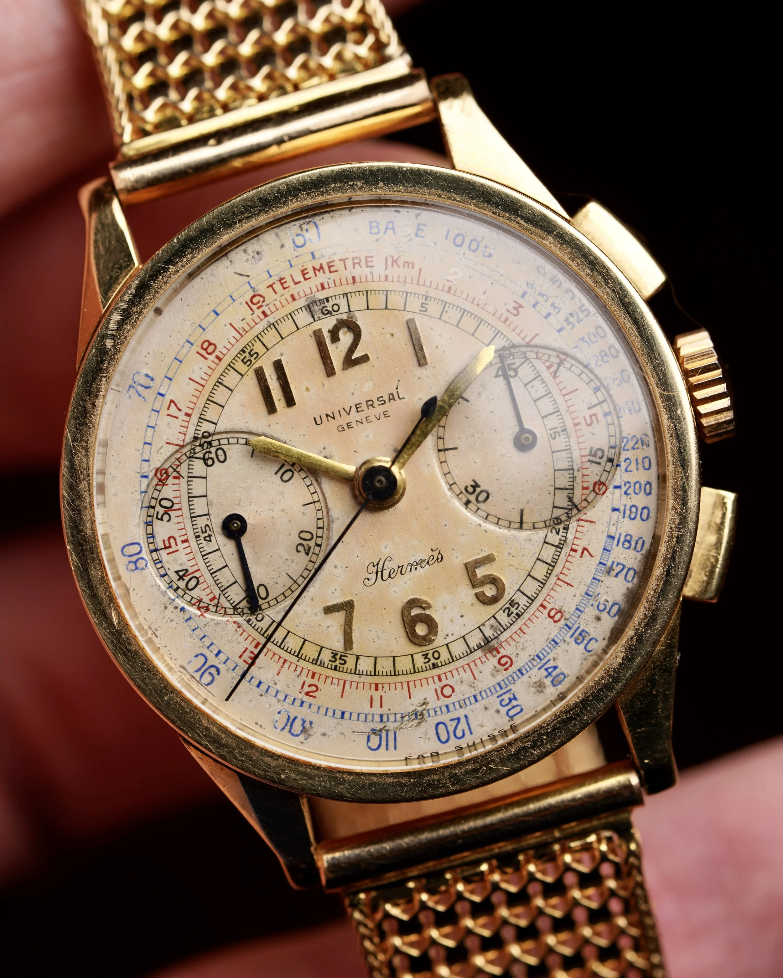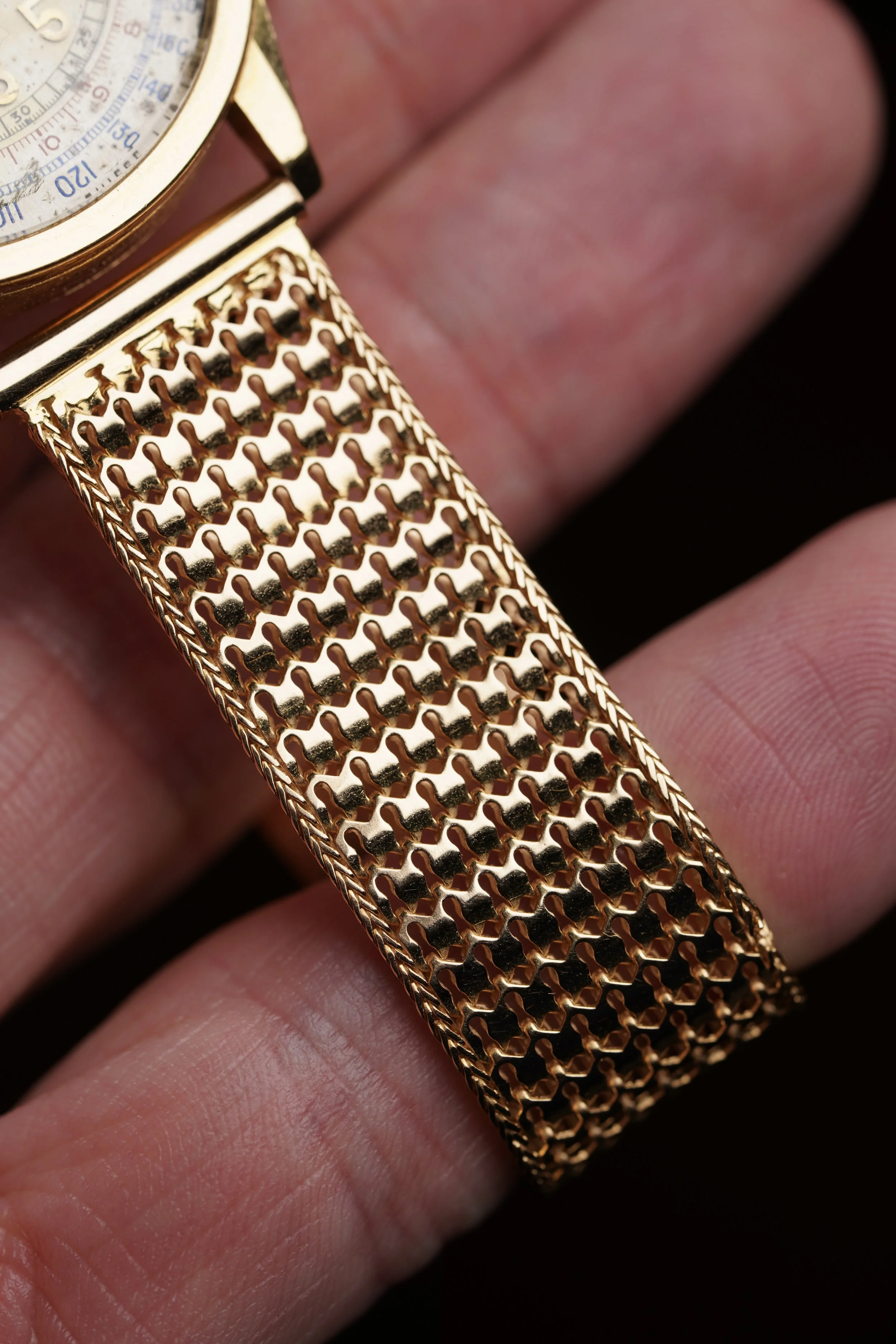 This is a very special Universal Genève Compax chronograph for the French market. The watch dates to circa 1936. The dial is an incredibly rare double-signed example with the early Hermès signature with applied-Arabic numerals. The dial is non-luminous. The dial features a blue tachometer scale and red telemetric. It is paired on a stunning and ornately made 18k yellow gold bracelet. The watch is powered by the manual wind calibre 287.