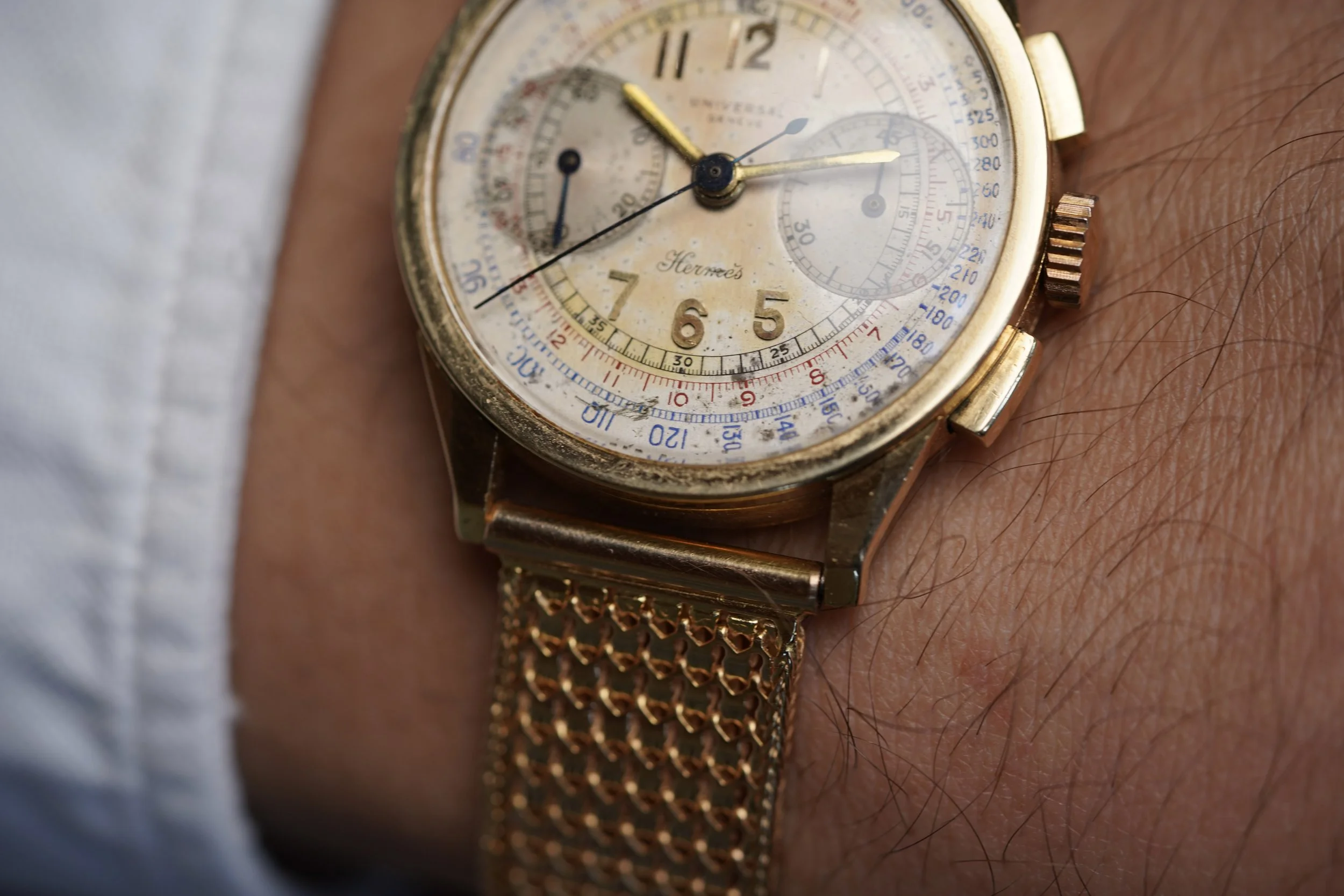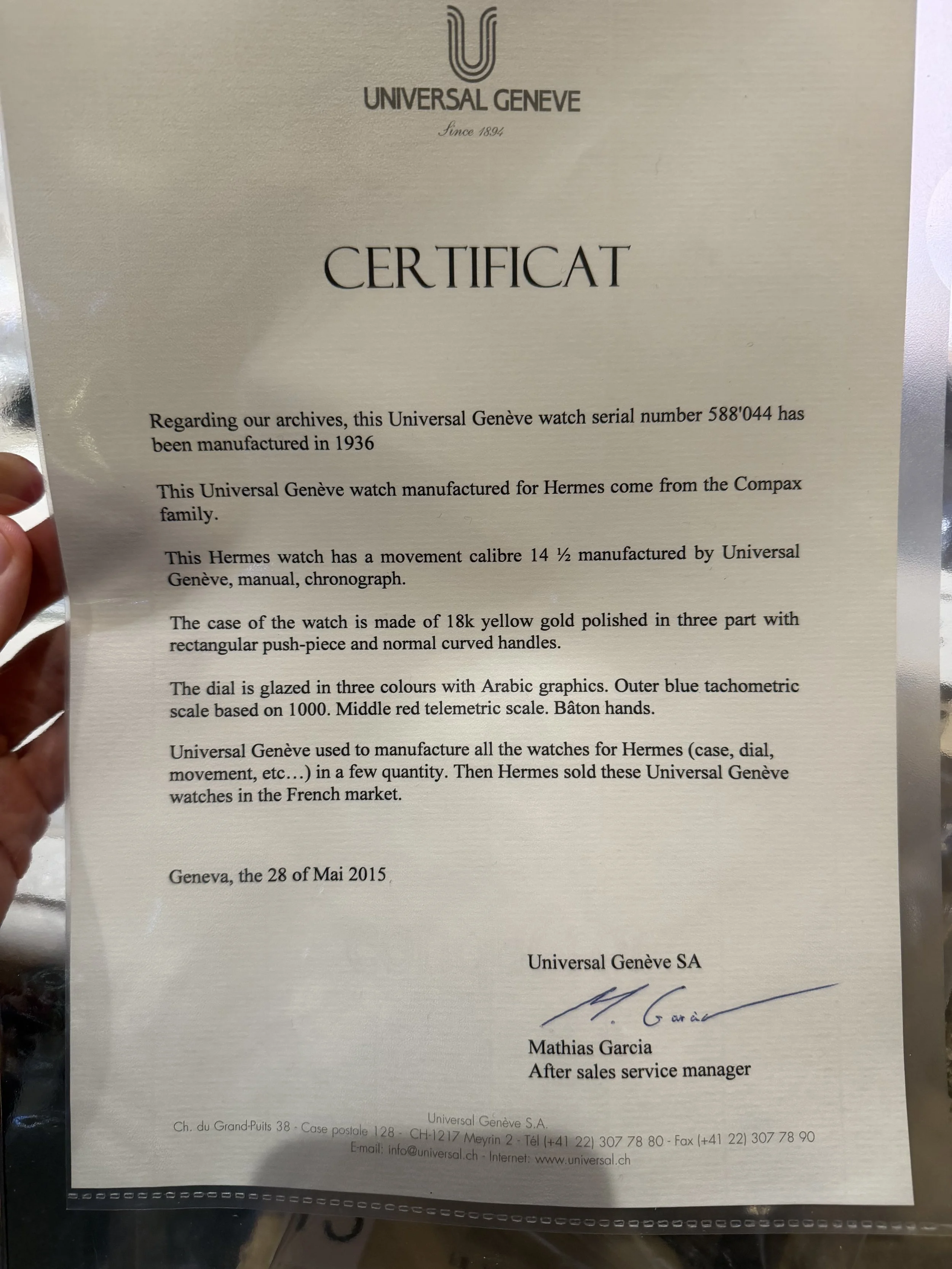 Universal Genève Hermès Compax Chronograph in 18k Yellow Gold on Bracelet w/ Extract, Box and French Magazine