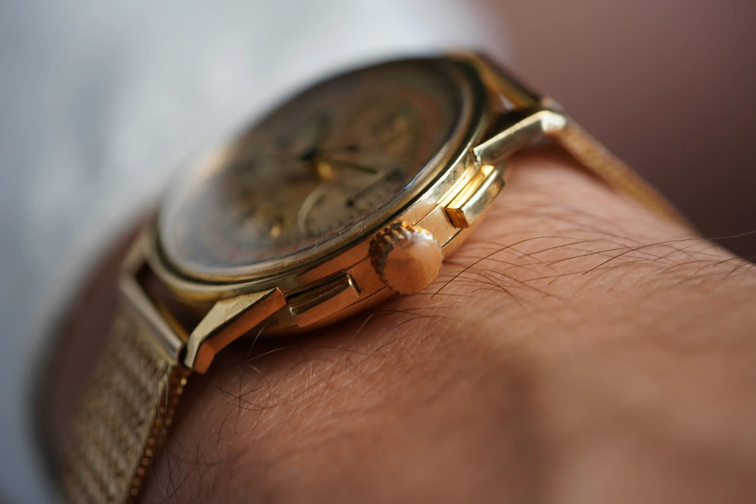 This watch features a lug design similar to the very rare Universal Genève chronographs by Henri Jeanneret in Peseux. There is speculation that Henri Jeanneret may have been related to Pierre Jeanneret and Le Corbusier, who designed Chandigarh, India and whose Jeanneret chairs are highly-prized by collectors worldwide.