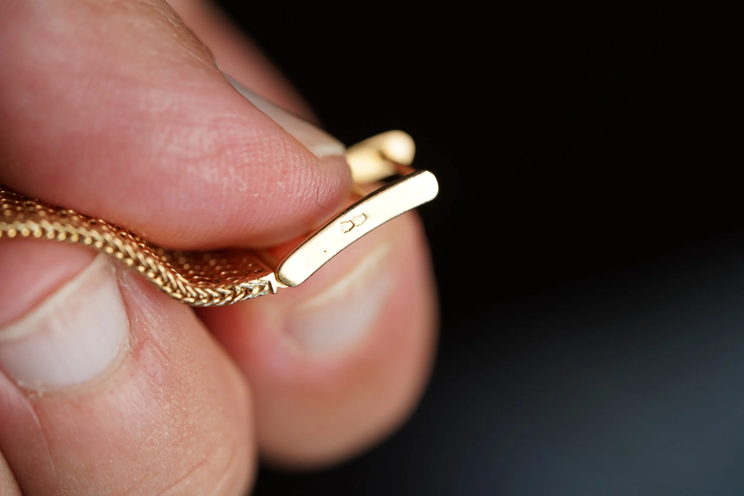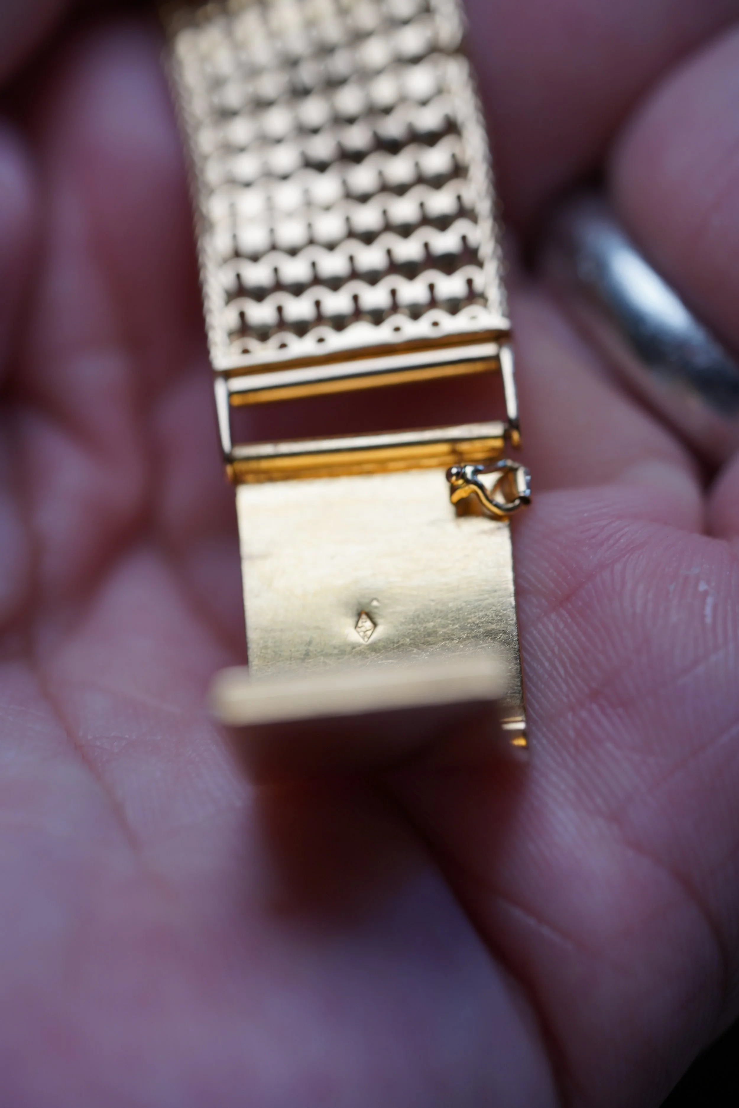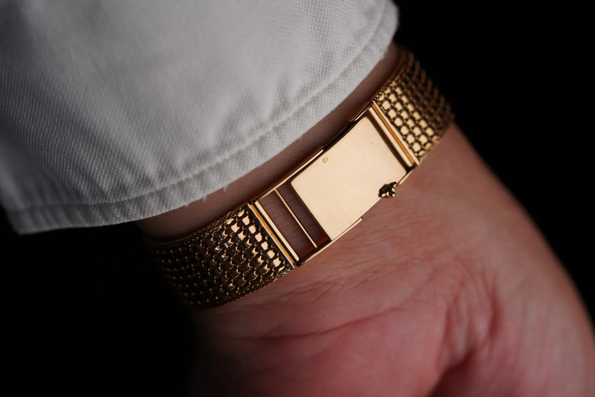 The case is made of 18k yellow fold. It measures approximately 34.5mm in diameter. It has been lightly polished.