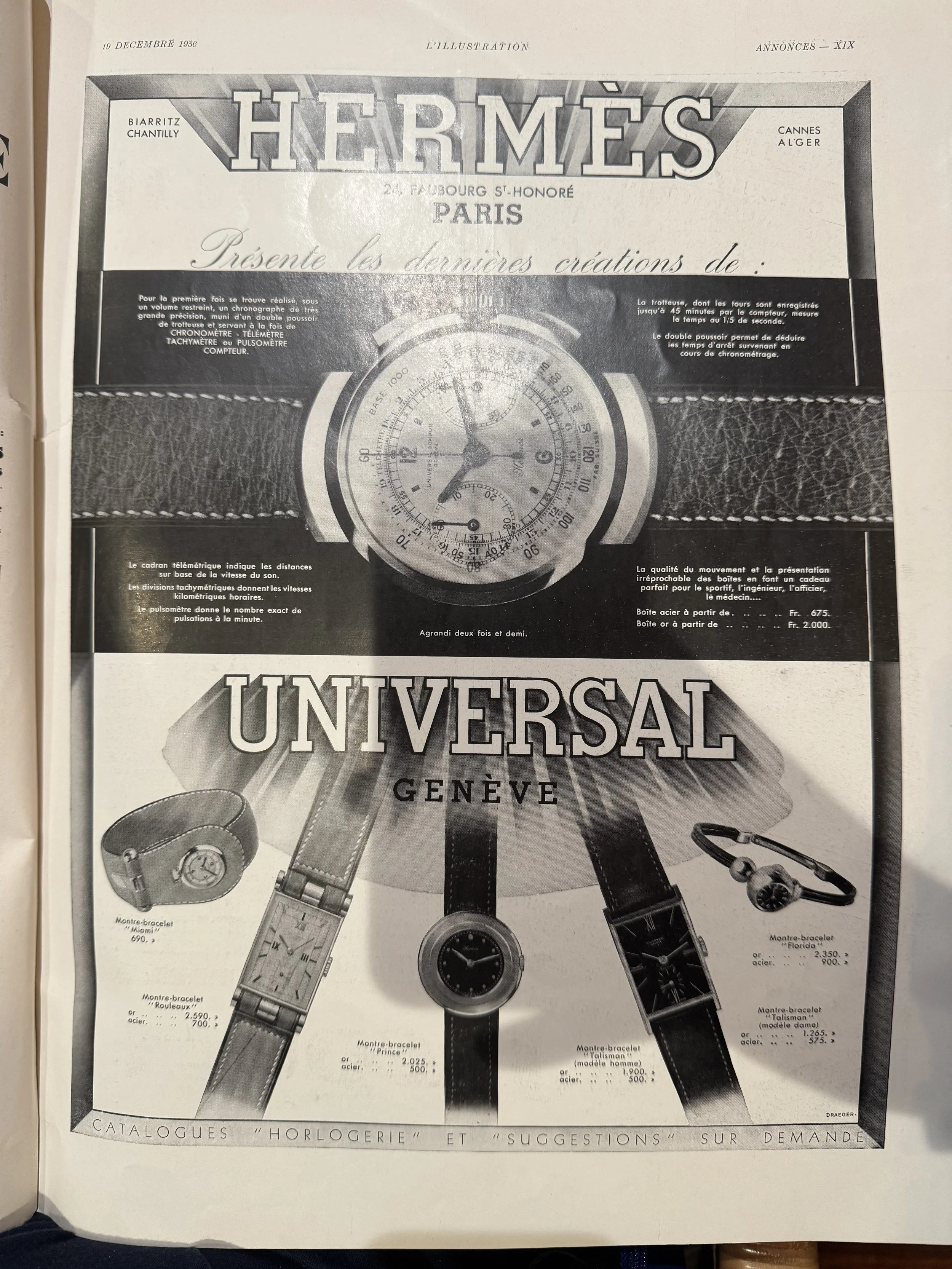 It does not come with papers. It does come with an Extract from Universal Genève. It does come with an Hermès leather box. It comes with a French magazine L'illustration with a Universal Genève Hermes advertisement. We do not know the service history, but it is running well.