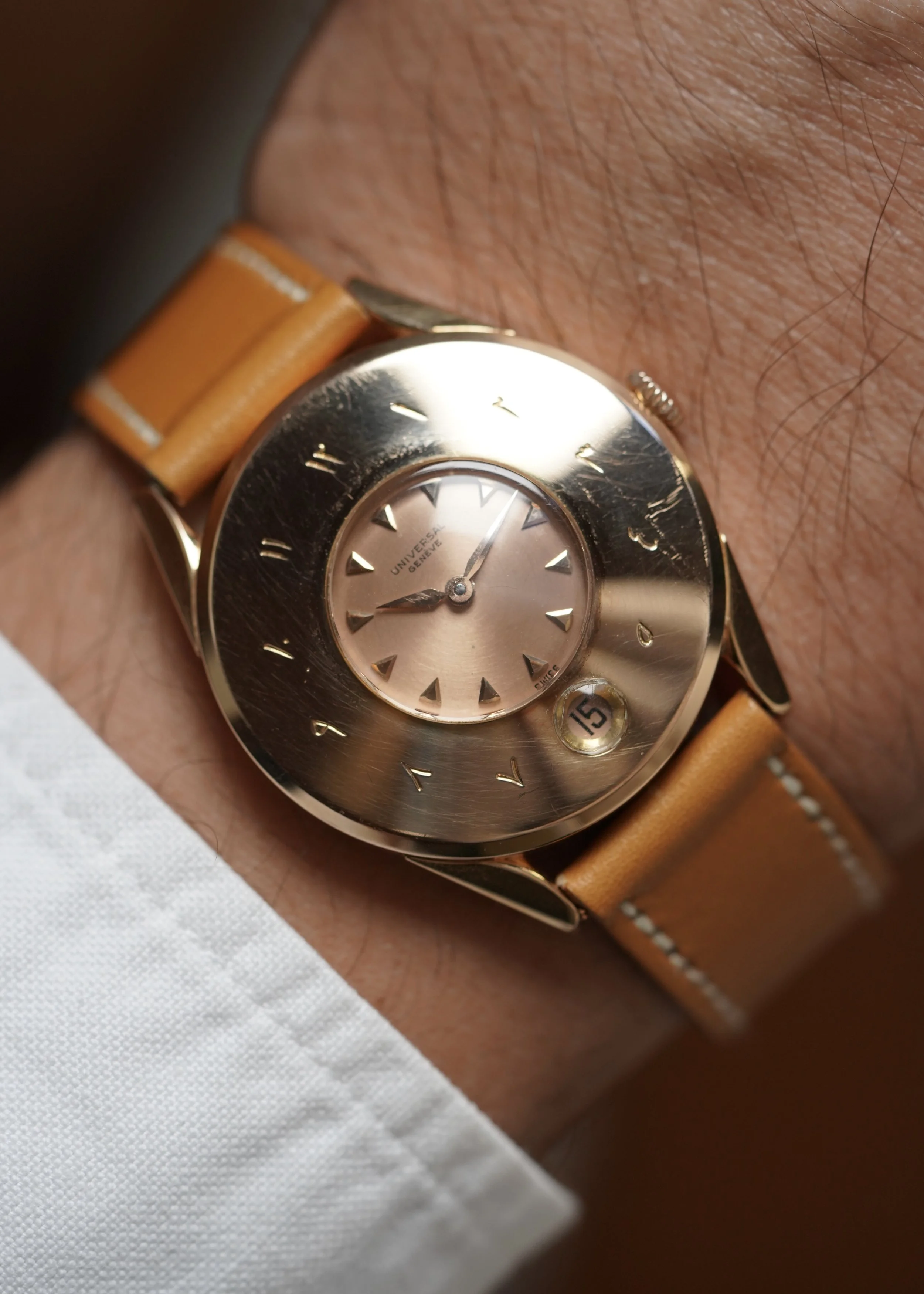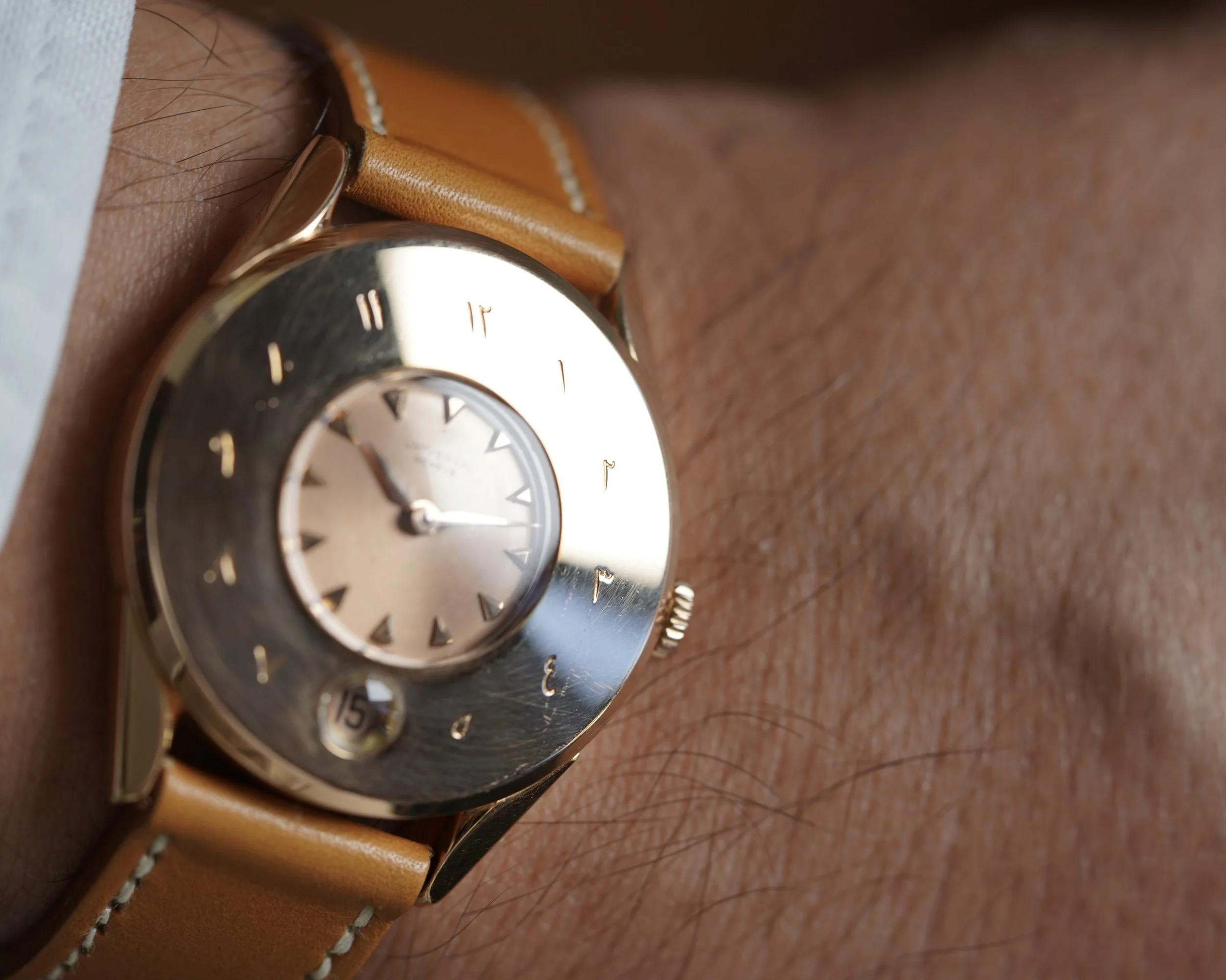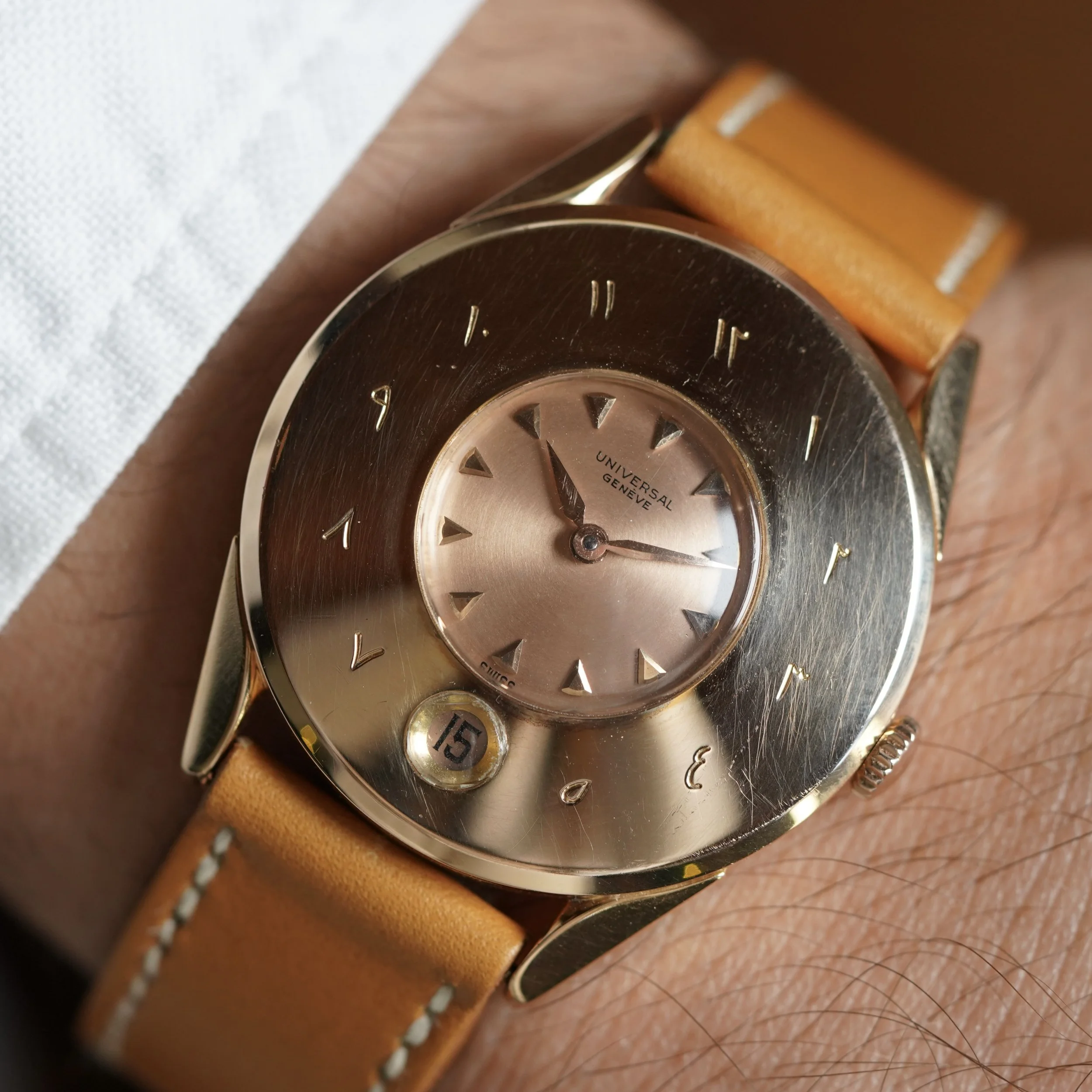 This is a very cool and rare Universal Genève Monodatic also known as the Dioramic. It measures 34.5mm in diameter and 41mm lug to lug. It features a pink on pink dial case which are both in outstanding condition and very attractive. We believe the case is unpolished. It features an incredibly cool Eastern-Arabic bezel. It is the only example we know of in this configuration. The pyramid hour markers and alpha hands are also very special. The watch features female spring bars.