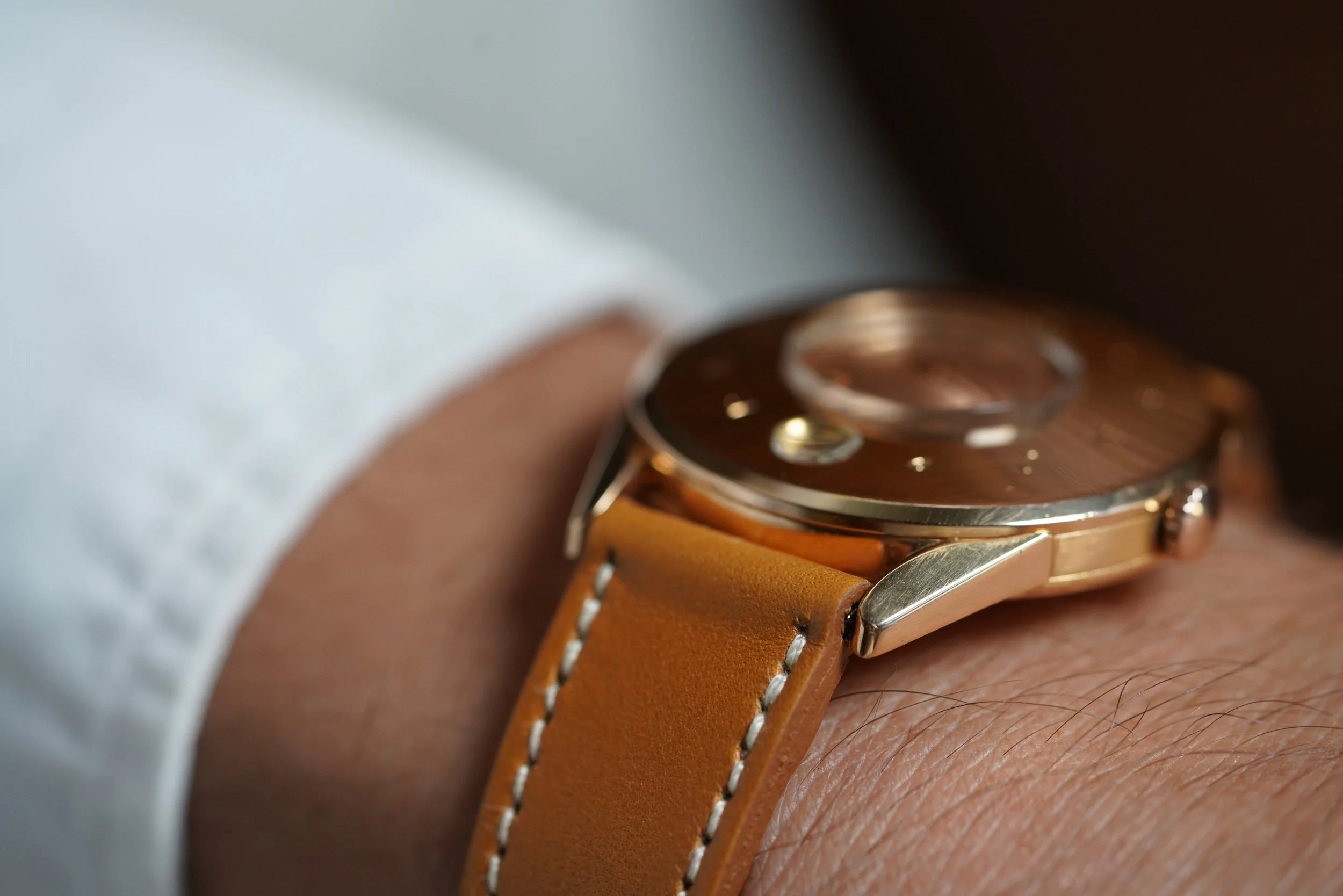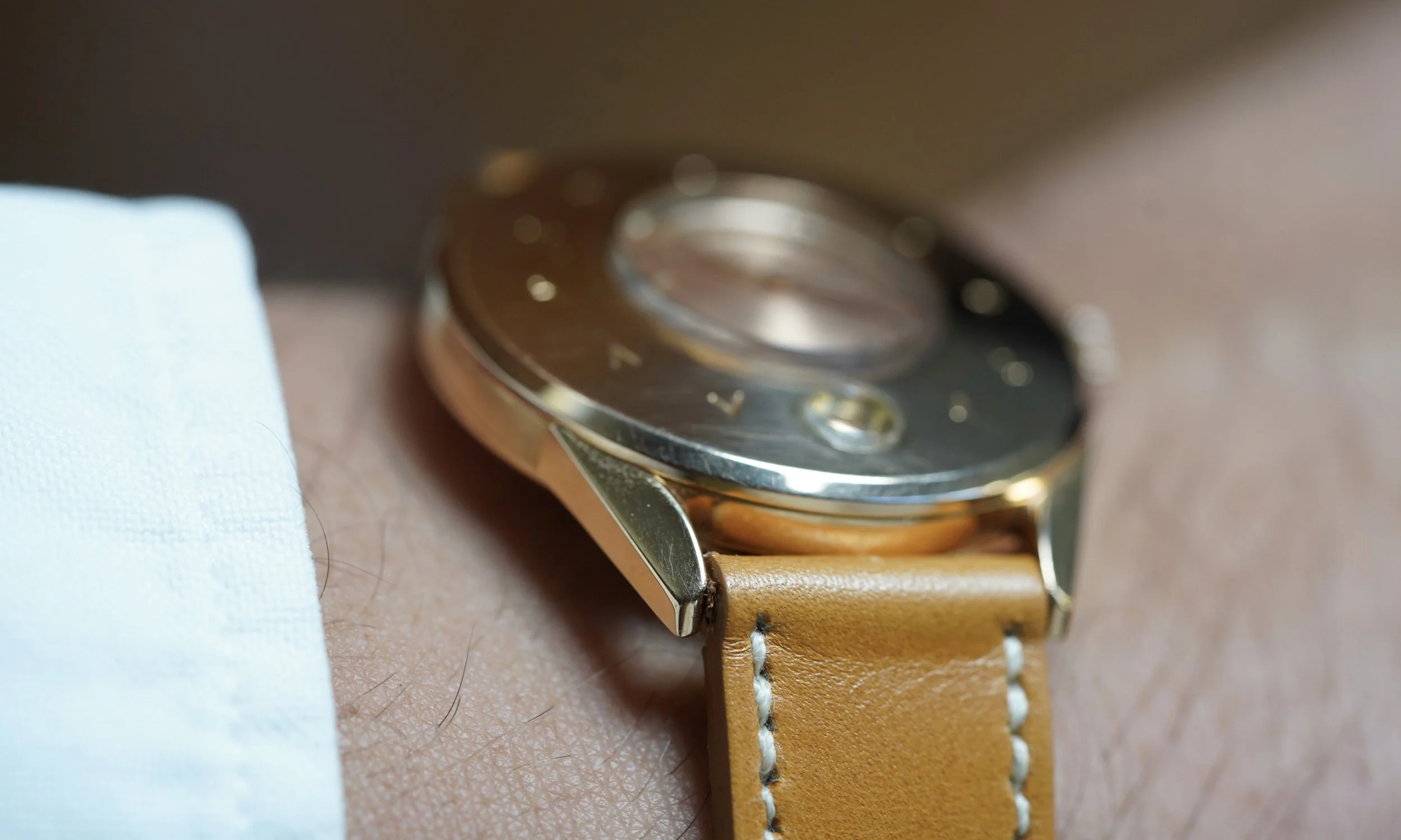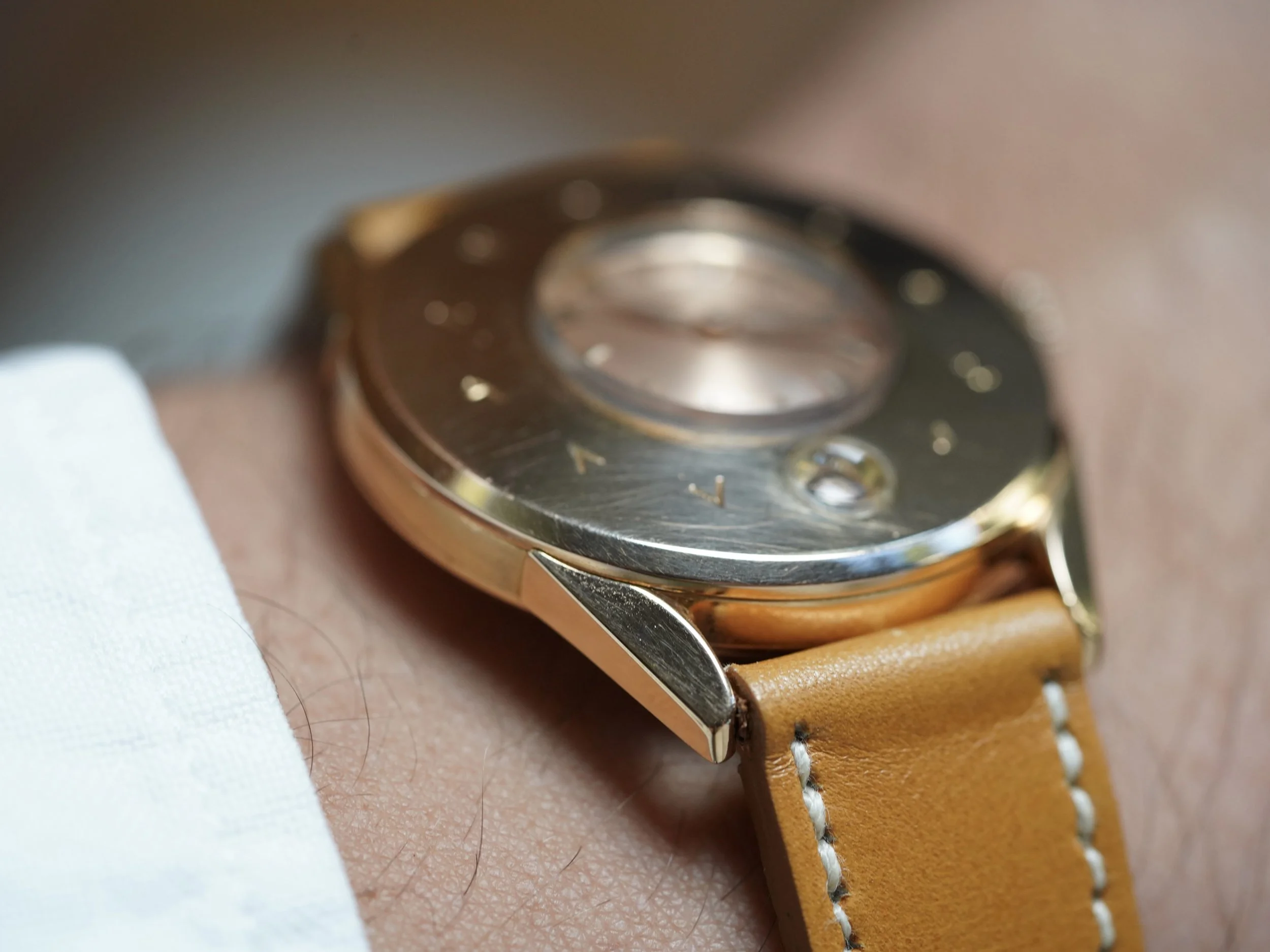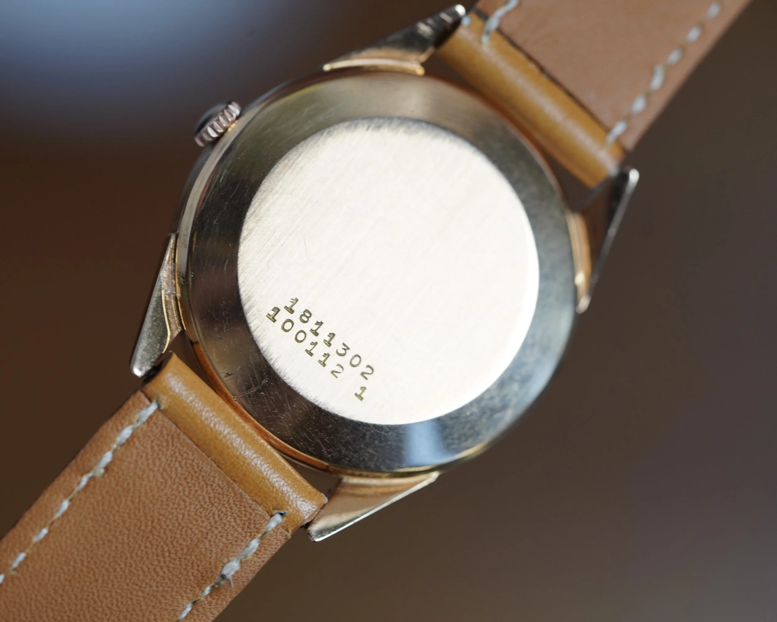 This is a very cool and rare Universal Genève Monodatic also known as the Dioramic. It measures 34.5mm in diameter and 41mm lug to lug. It features a pink on pink dial case which are both in outstanding condition and very attractive. We believe the case is unpolished. It features an incredibly cool Eastern-Arabic bezel. It is the only example we know of in this configuration. The pyramid hour markers and alpha hands are also very special. The watch features female spring bars.