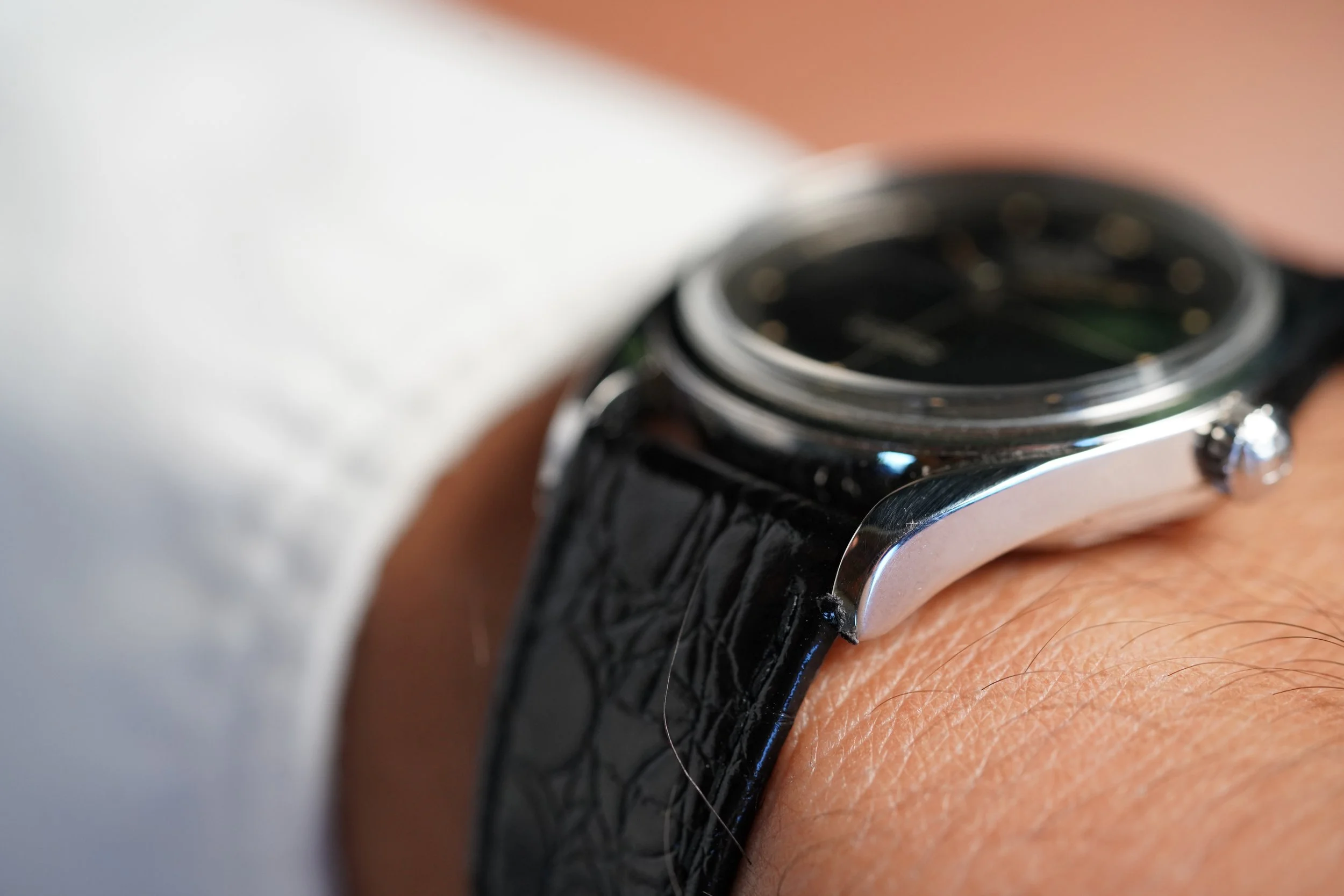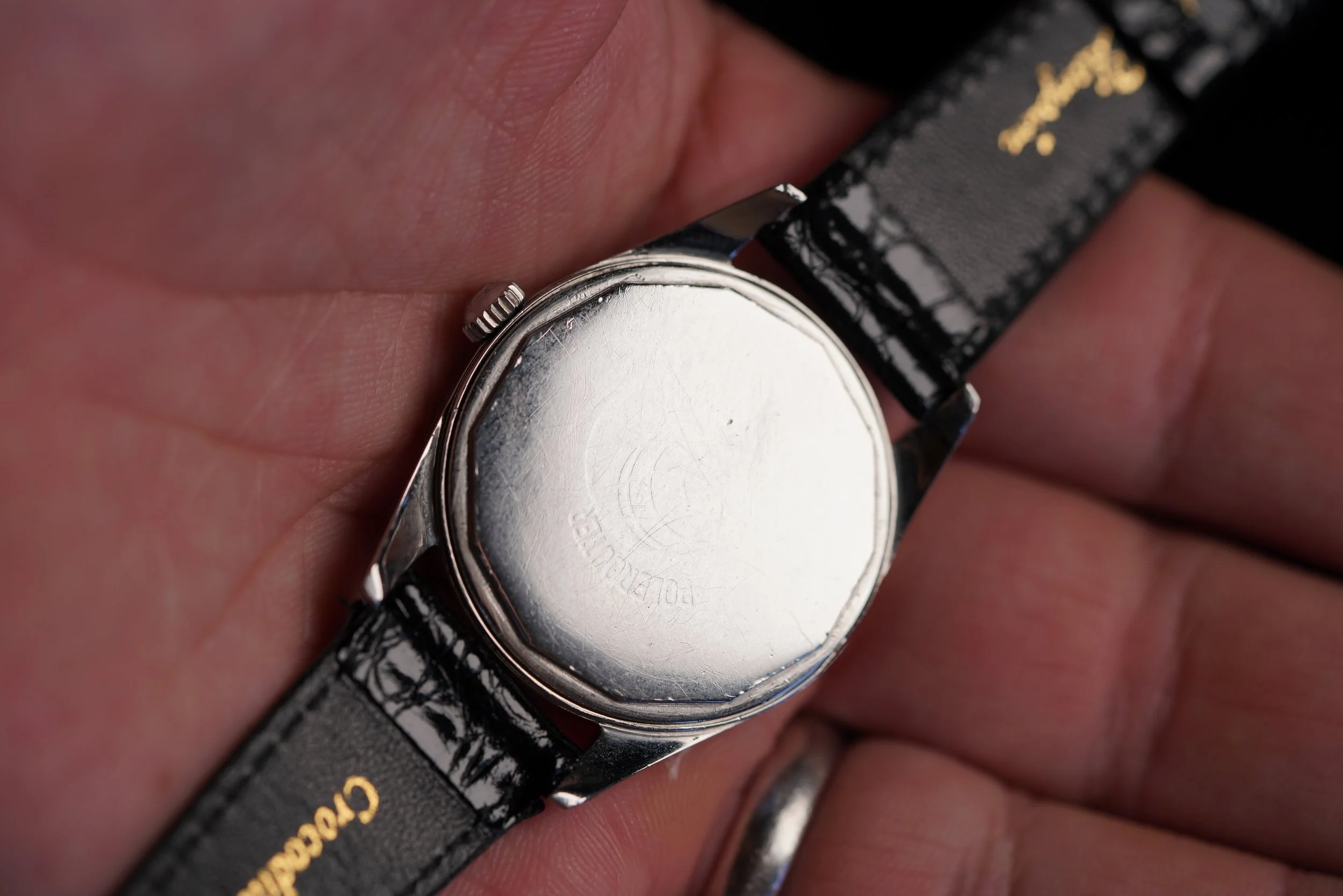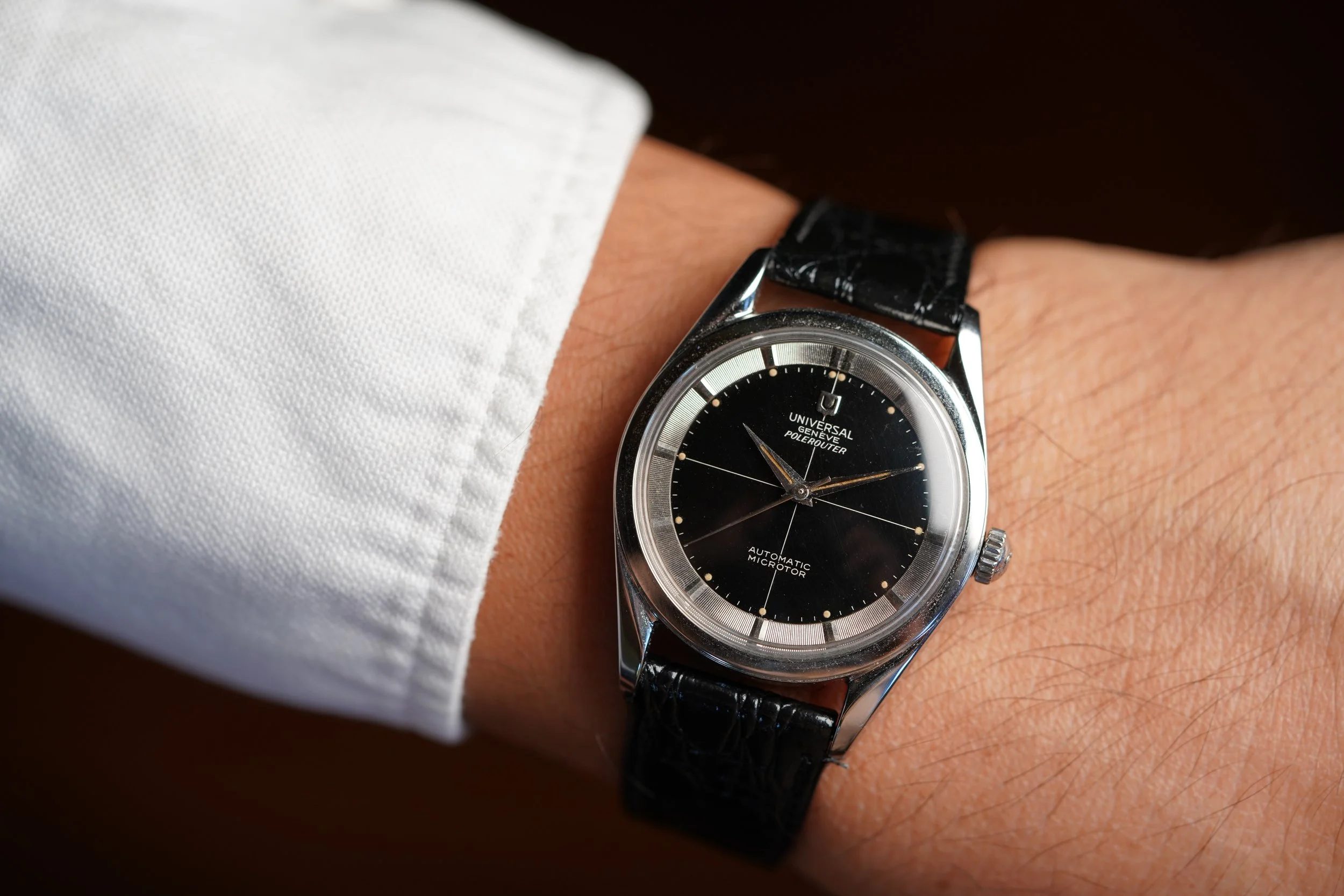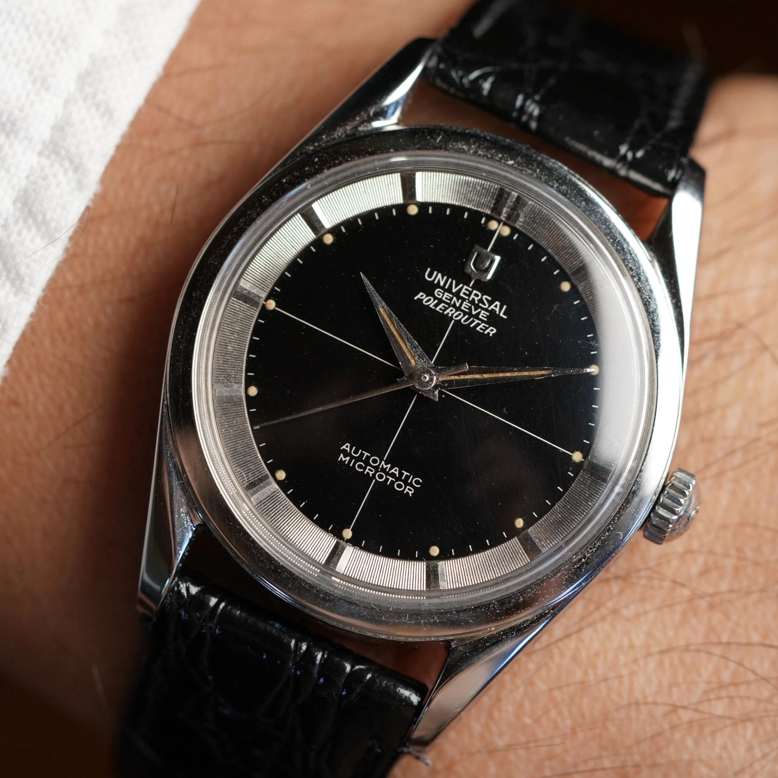 This is a very cool Universal Genève Polerouter reference 20357-1 with black dial. The case has been lightly polished. It measures 35mm in diameter (44mm lug to lug). The watch is paired on a JB Champion strap and Universal Genève buckle which are possibly original to the watch.