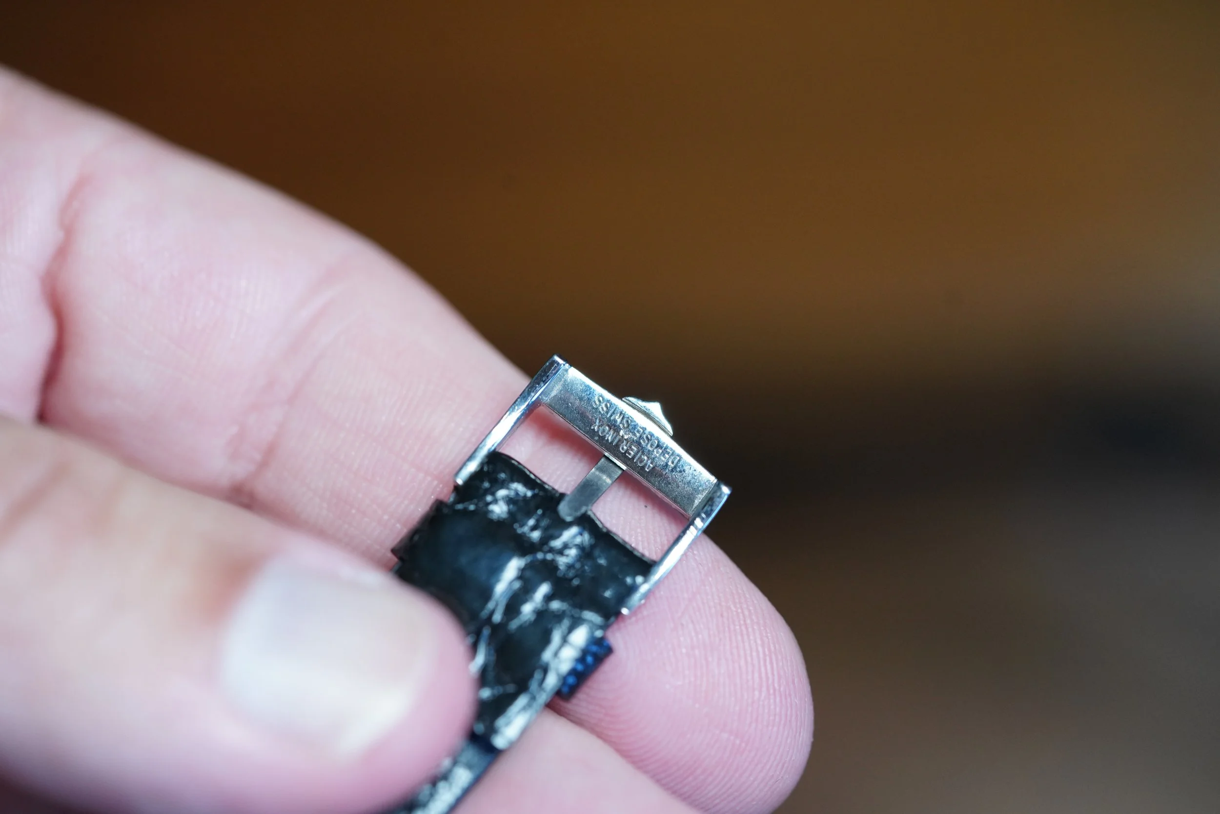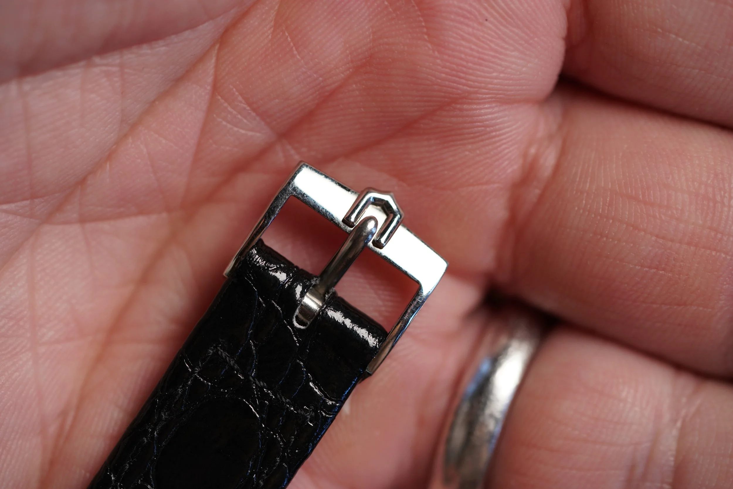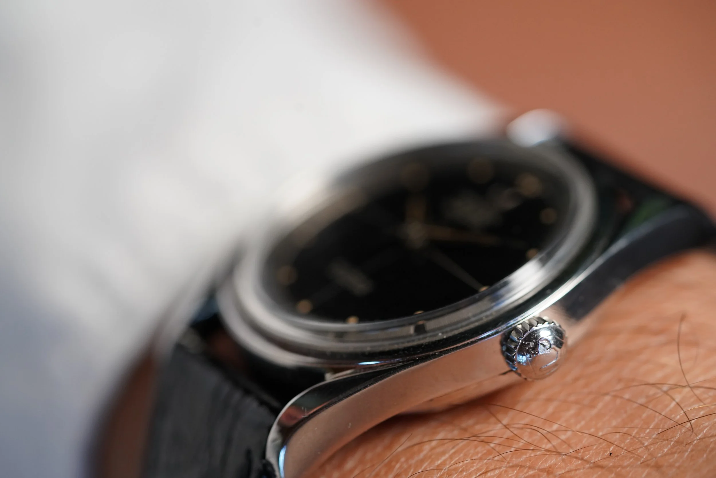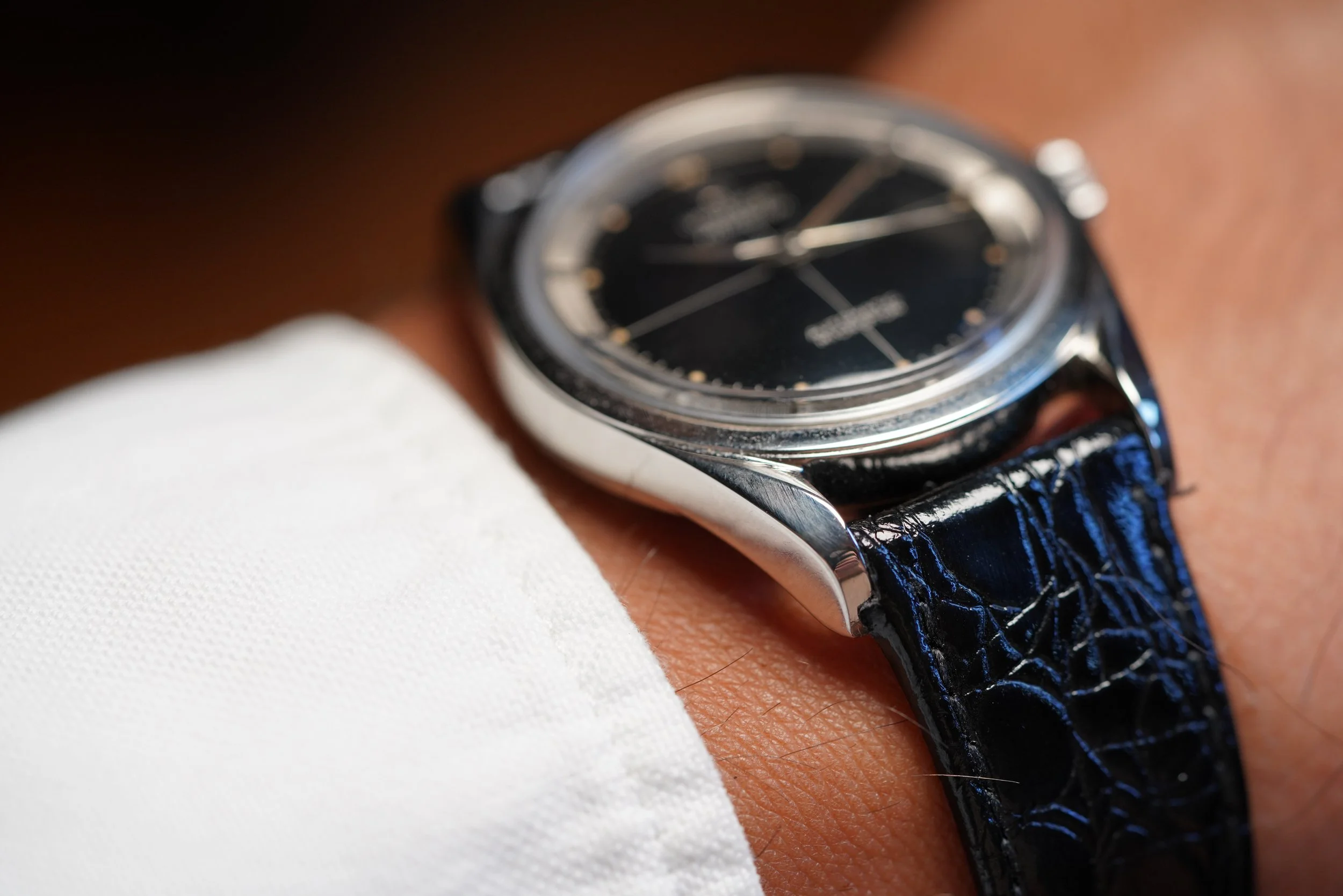 This is a very cool Universal Genève Polerouter reference 20357-1 with black dial. The case has been lightly polished. It measures 35mm in diameter (44mm lug to lug). The watch is paired on a JB Champion strap and Universal Genève buckle which are possibly original to the watch.