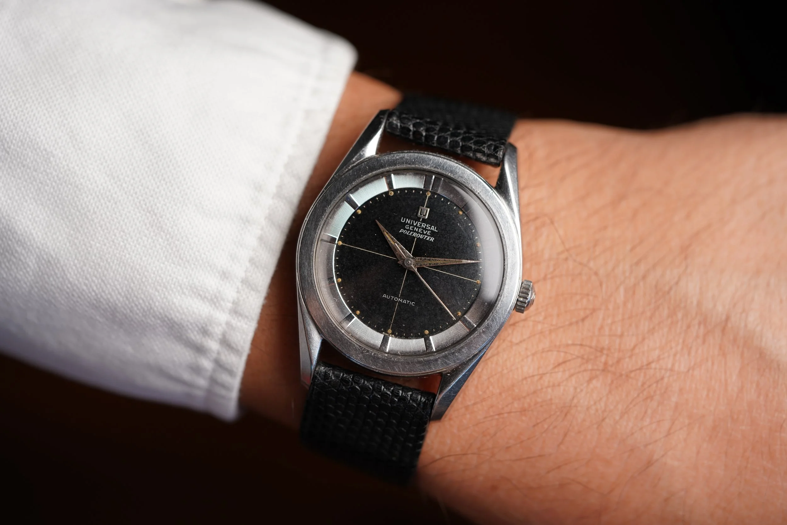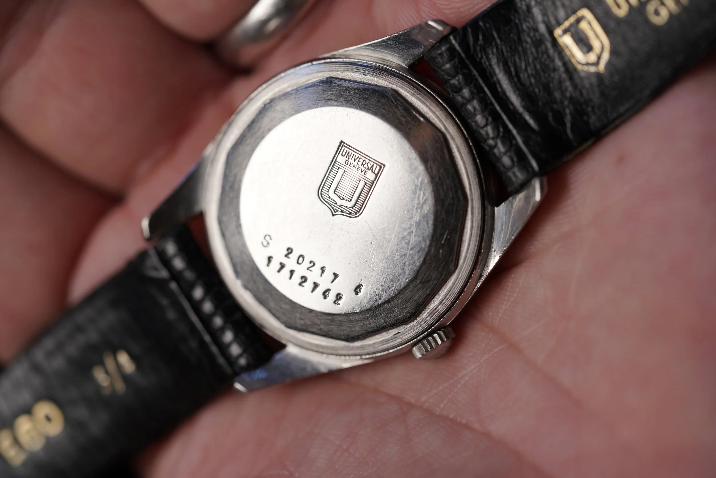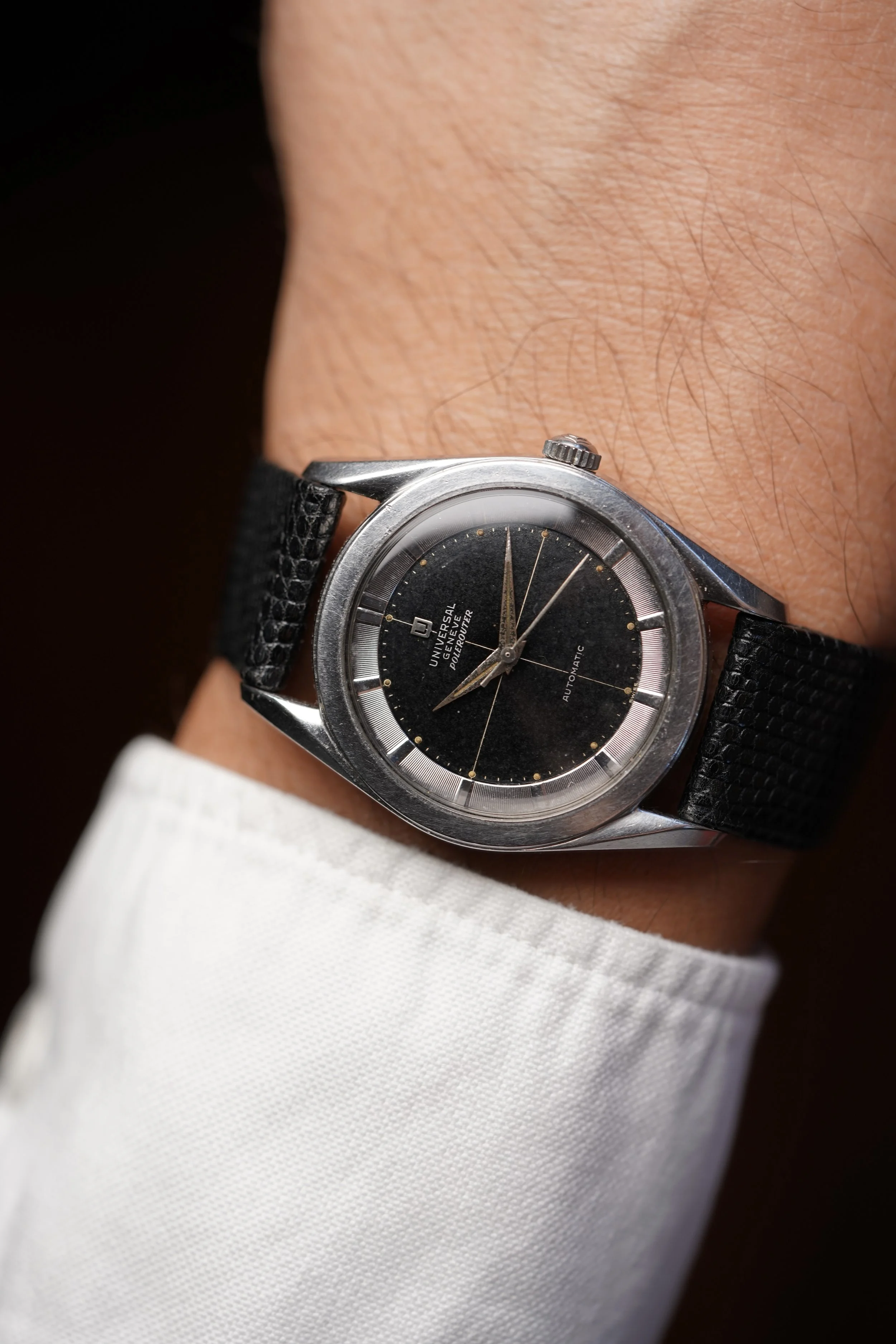 This is a very cool Universal Genève Polerouter reference S20217-4 with black dial. The case has been lightly polished. It measures 35mm in diameter (44mm lug to lug). The watch is paired on a Universal Genève strap and buckle which are possibly original to the watch. It features a bumper automatic movement.