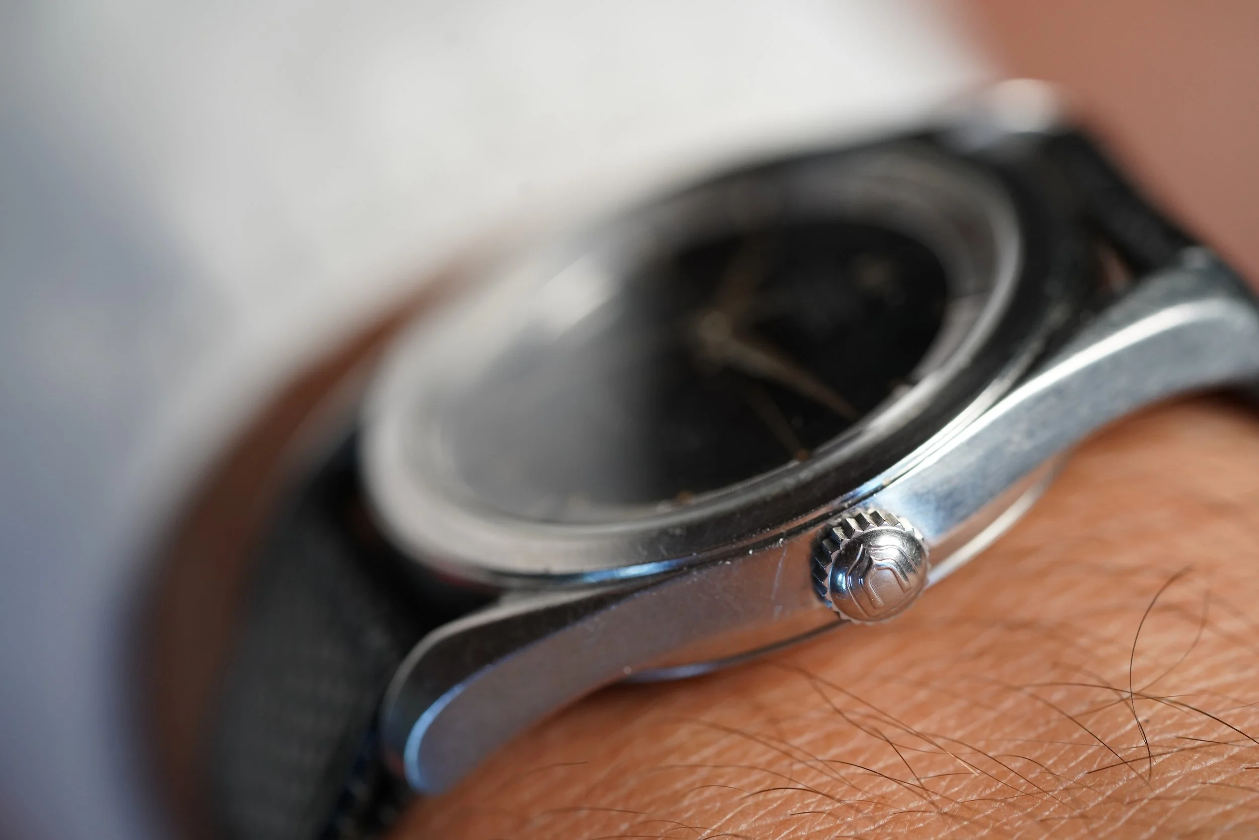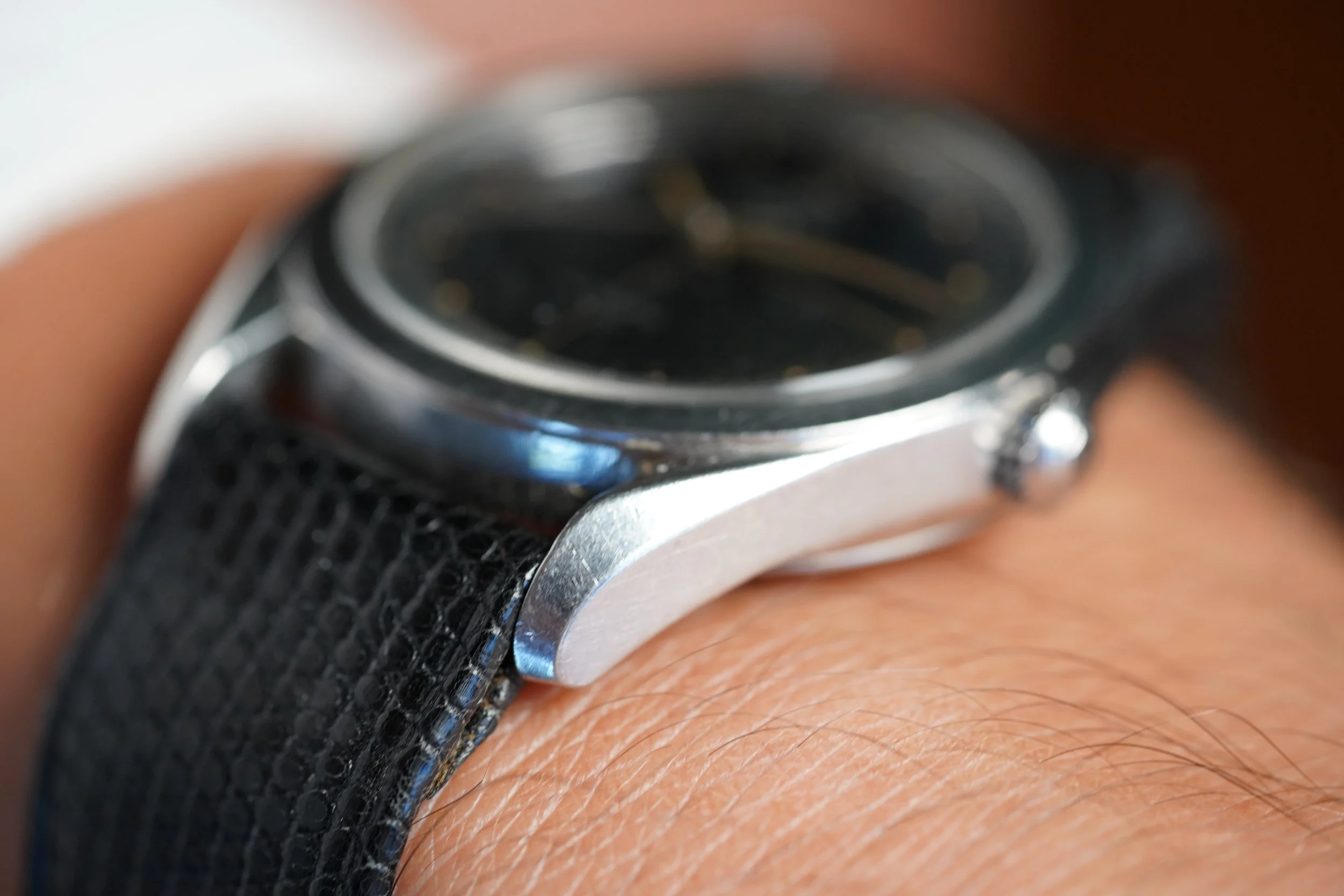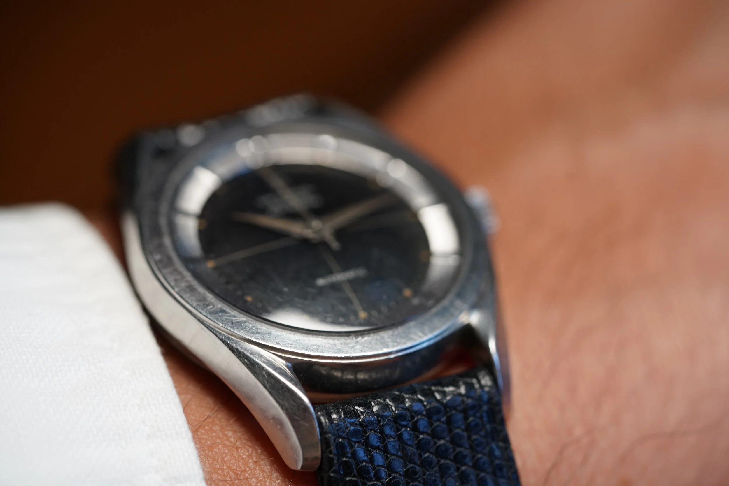 This is a very cool Universal Genève Polerouter reference S20217-4 with black dial. The case has been lightly polished. It measures 35mm in diameter (44mm lug to lug). The watch is paired on a Universal Genève strap and buckle which are possibly original to the watch. It features a bumper automatic movement.