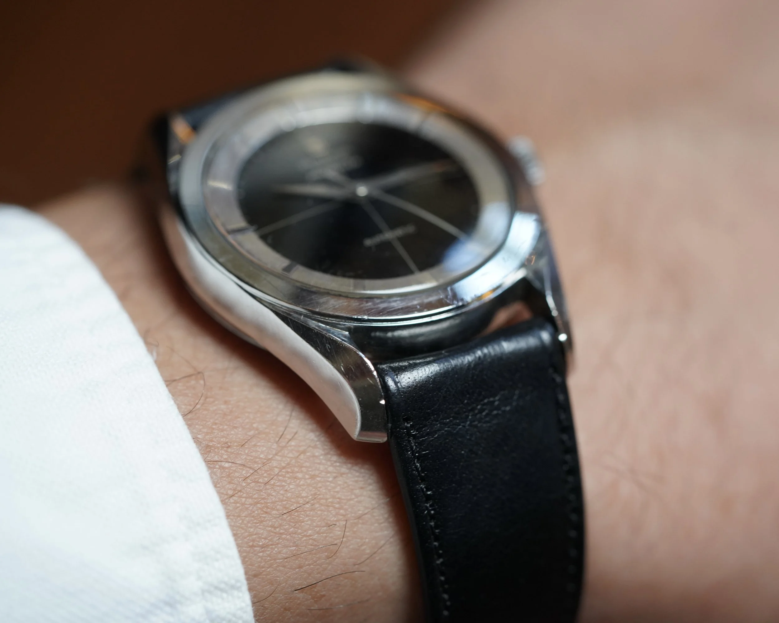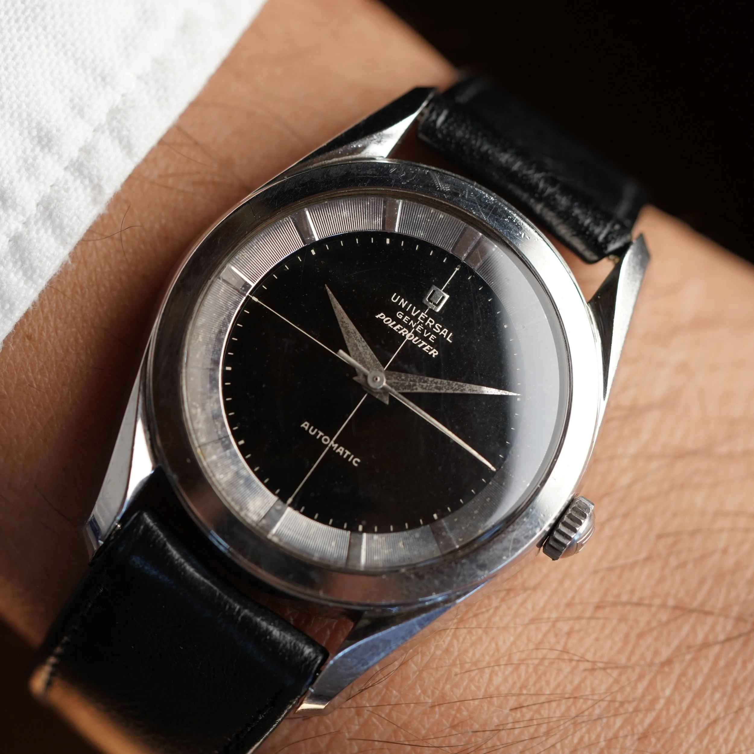 This is a very nice Universal Genève Polerouter Reference S20217-2. The case appears to be unpolished. It measures 35mm in diameter (44mm lug to lug). It features a beautiful non-luminous gilt dial which is in great condition and very attractive.