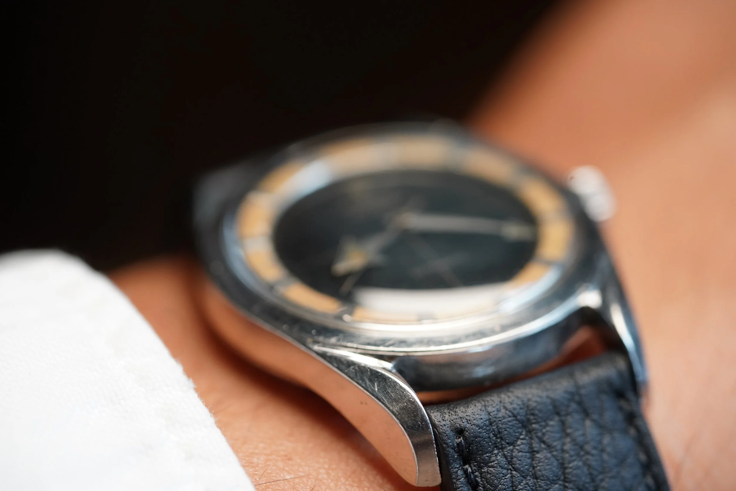 This is a very nice Universal Genève Polerouter Reference H 20217-8. The watch is nicknamed for its Broad Arrow handset and also referred to as the Nite Lite. These watches are great early Polerouter models with luminous handsets and dials.