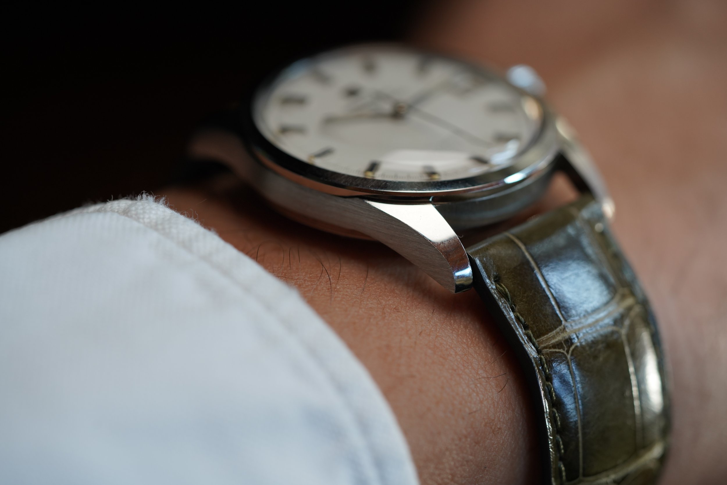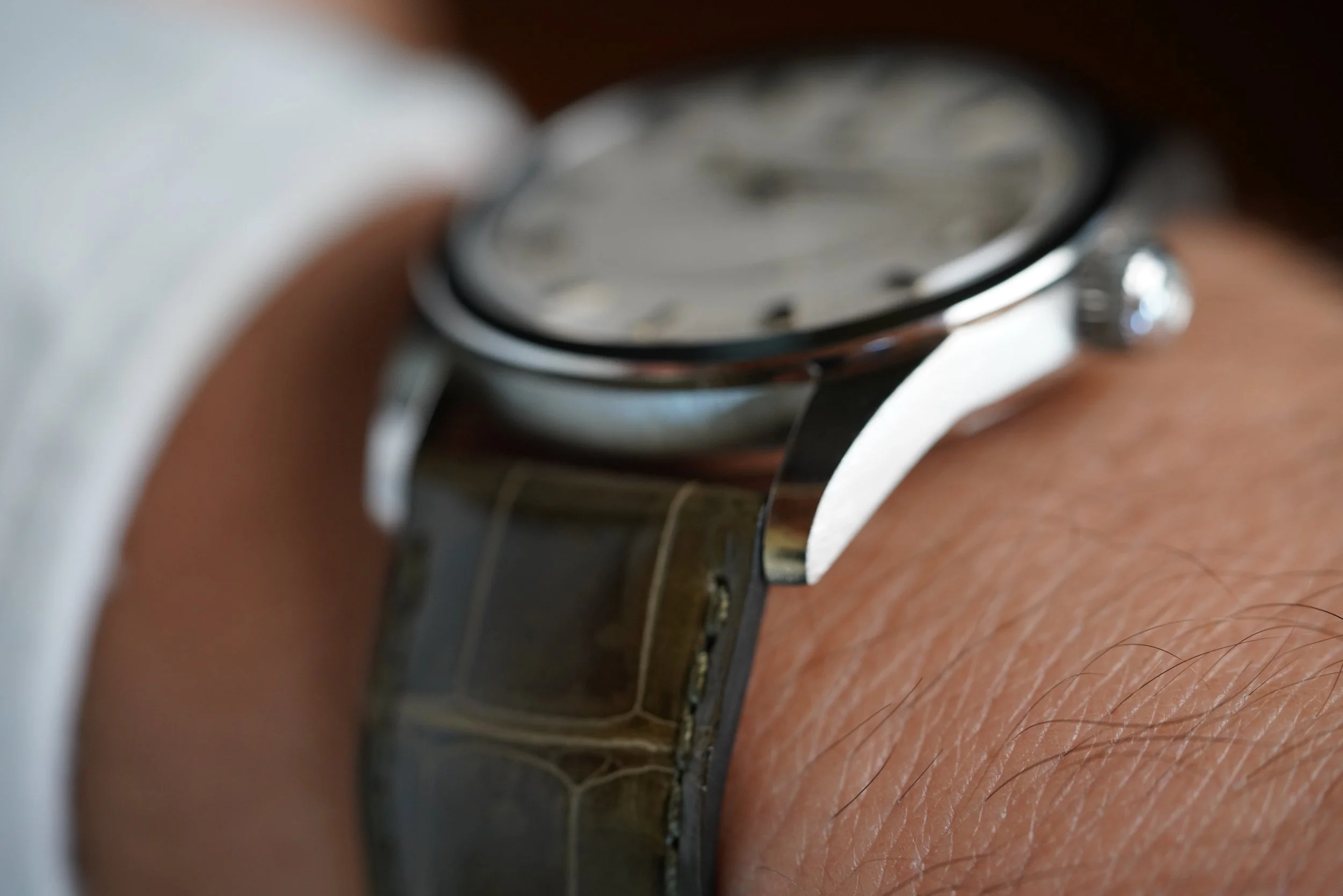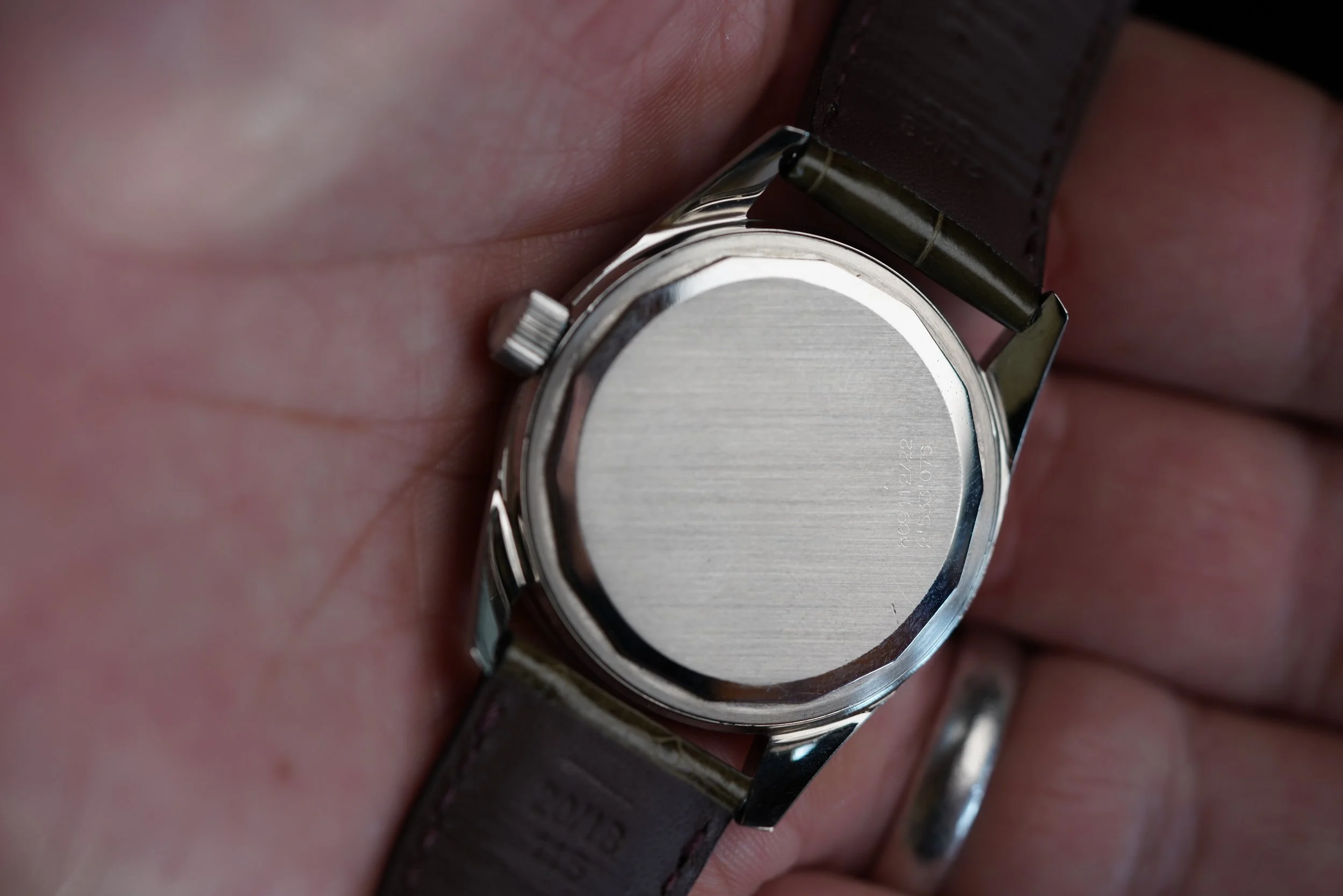 This Universal Genève Polerouter Super reference 869112/22 is a great steel watch with white dial. The case measures approximately 35mm in diameter and 42mm lug to lug. It features a cream dial with a date with a date aperture at 3 o’clock. The case appears to be unpolished.