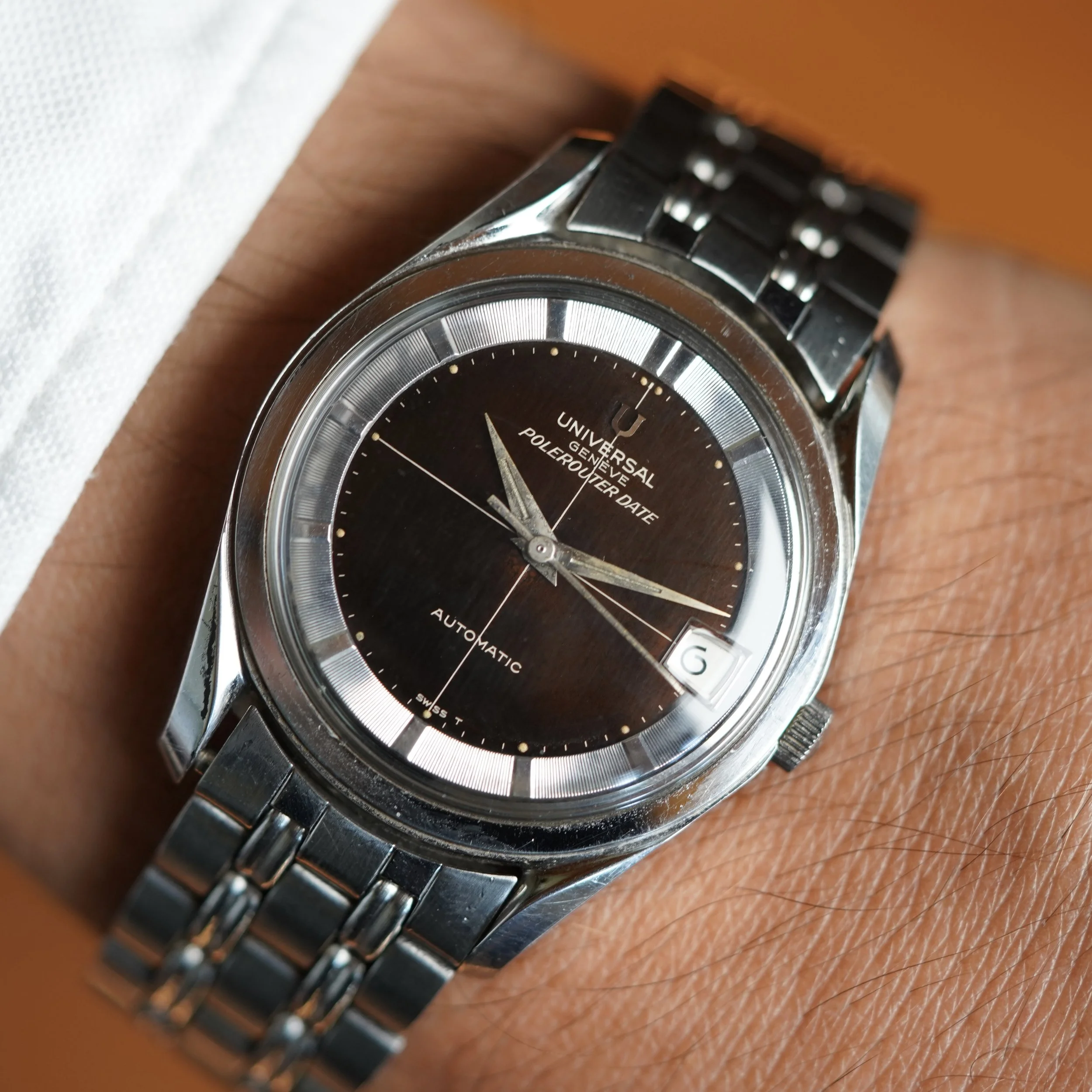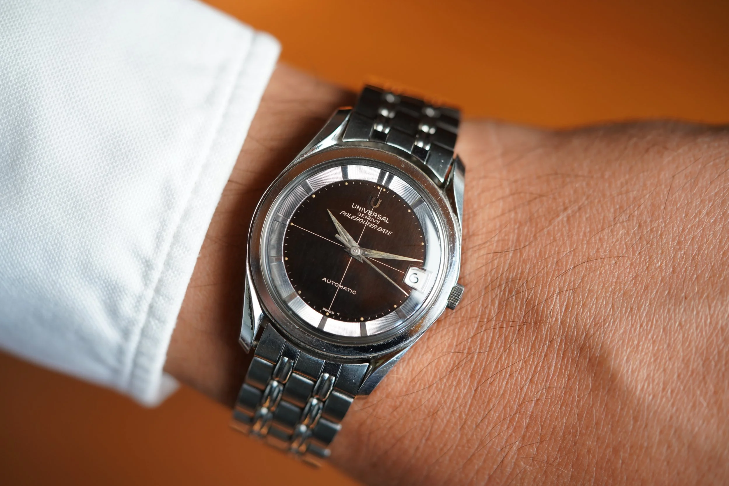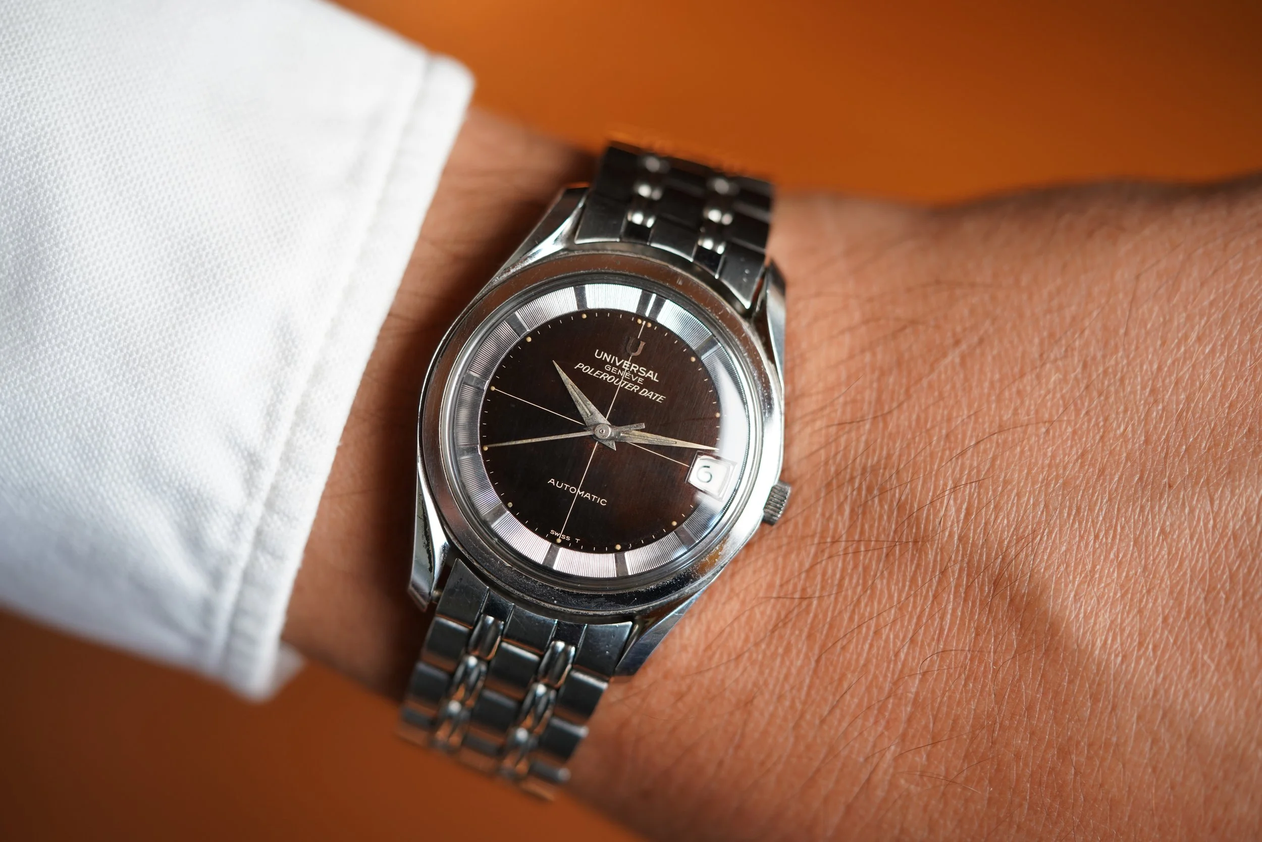 The Polerouter is an iconic watch designed by Gérald Genta, and this example, reference 86911 with date, features a stunning tropical dial. The case appears to be unpolished and was made by Huguenin Frères. The case measures 36mm in diameter and approximately 44.5 mm lug-to-lug. The watch is paired with a stainless steel Universal Genève bracelet made by Gay Frères, dating to 1966 which is later and attractive.