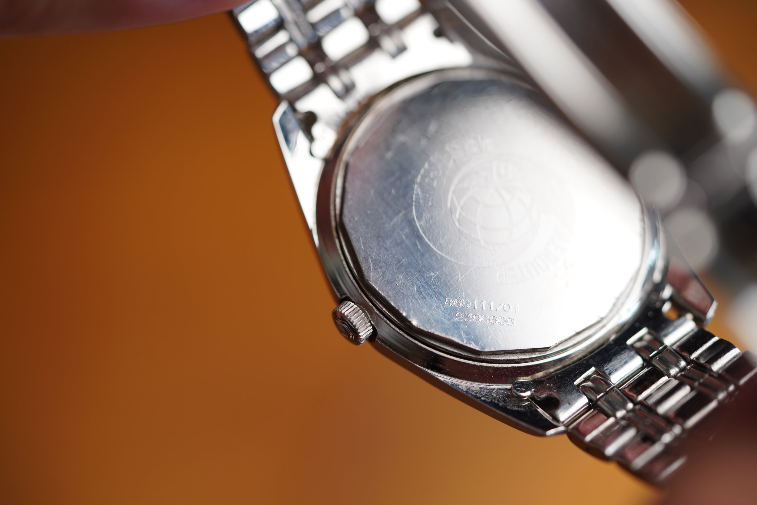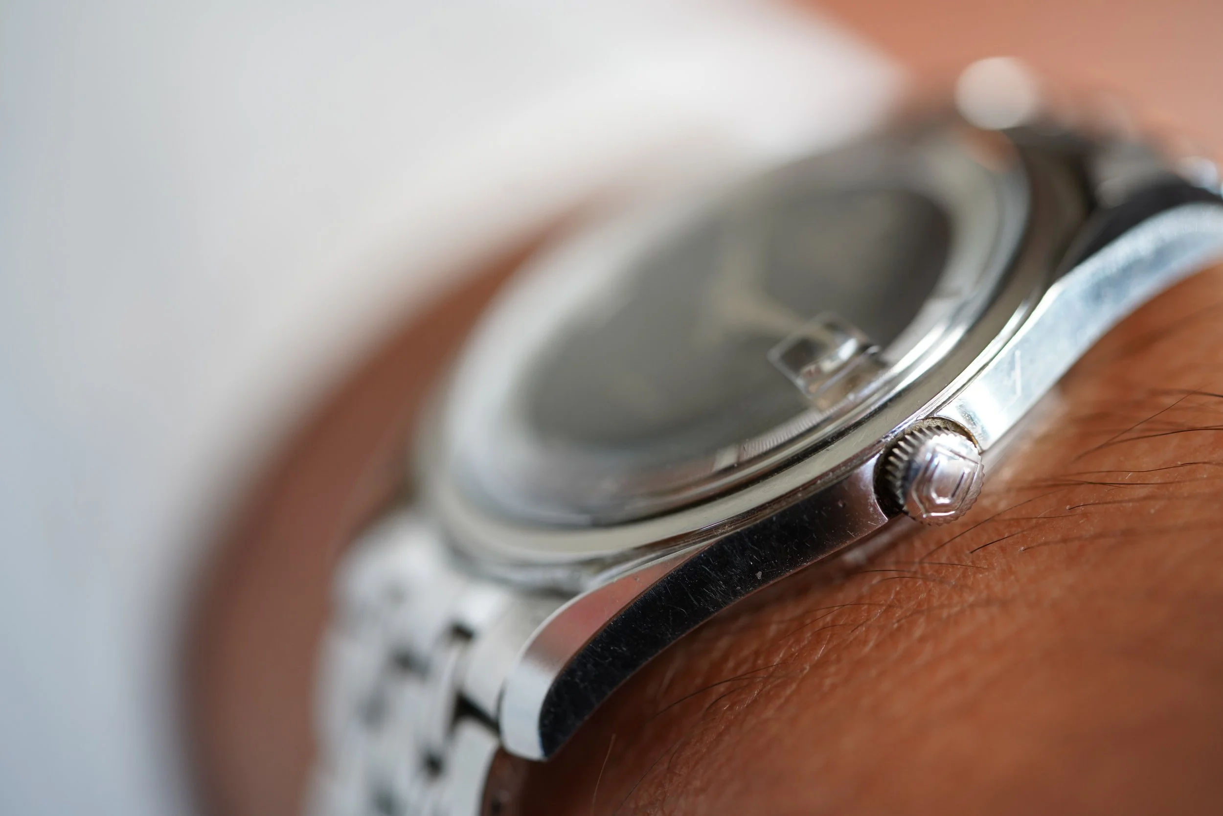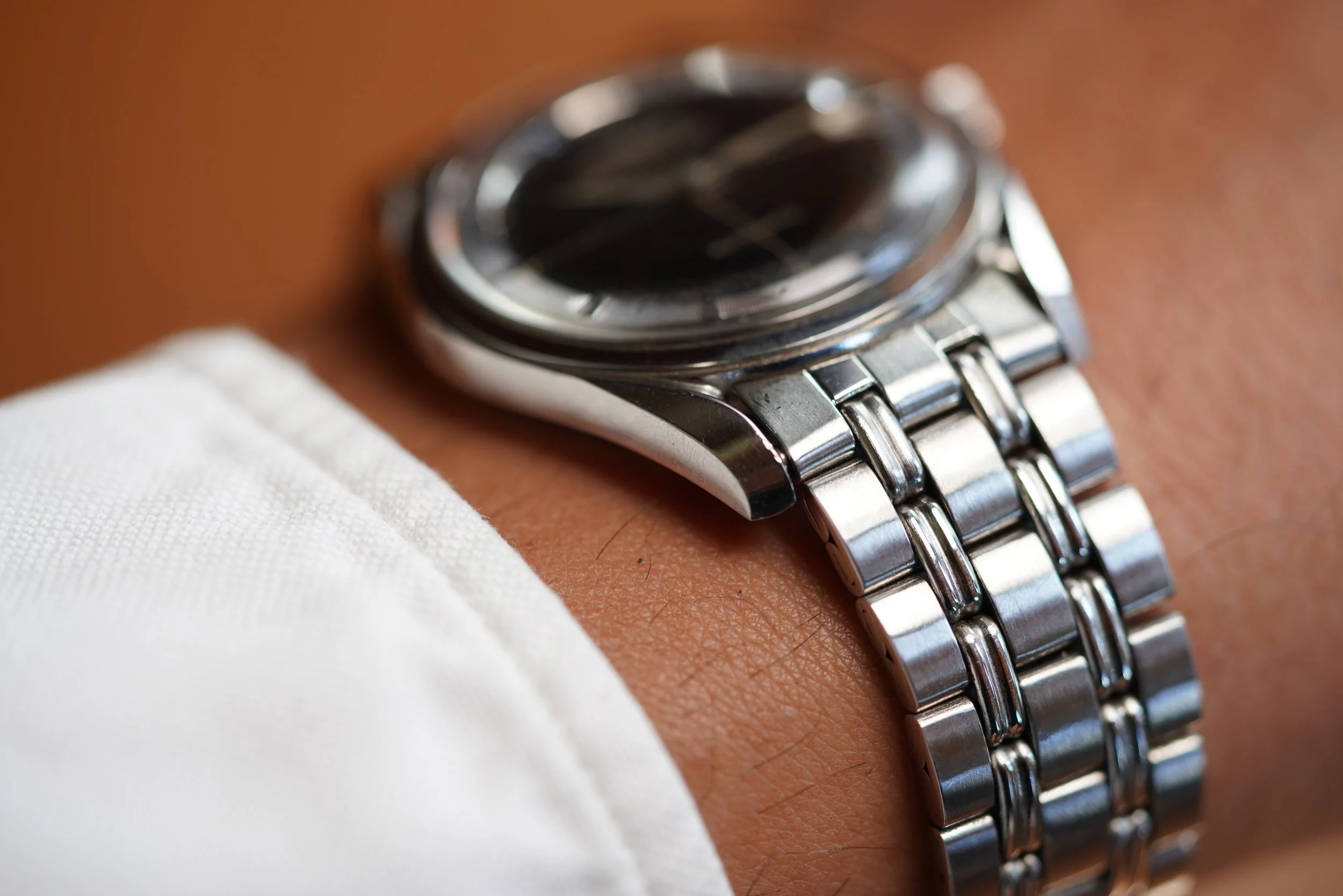 The Polerouter is an iconic watch designed by Gérald Genta, and this example, reference 86911 with date, features a stunning tropical dial. The case appears to be unpolished and was made by Huguenin Frères. The case measures 36mm in diameter and approximately 44.5 mm lug-to-lug. The watch is paired with a stainless steel Universal Genève bracelet made by Gay Frères, dating to 1966 which is later and attractive.