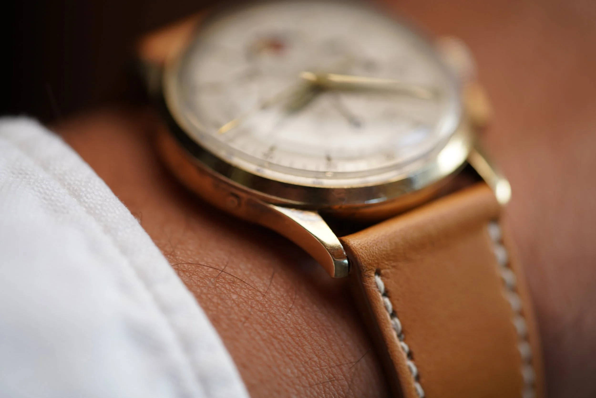 Universal Genève is one of the most fantastic watchmakers with a great past catalog. This 14k yellow gold case is in great condition. It appears to be unpolished. The diameter measures approximately 35mm and is 41mm lug-to-lug.