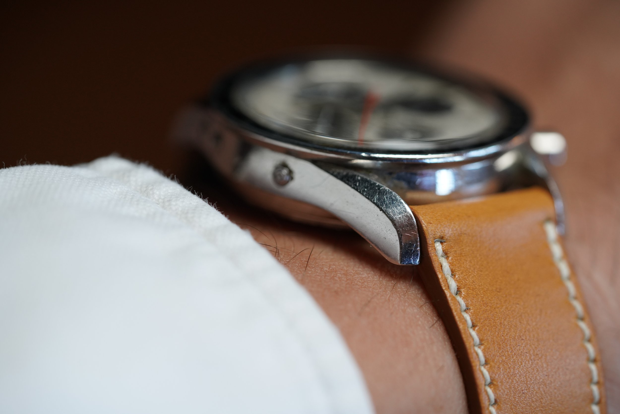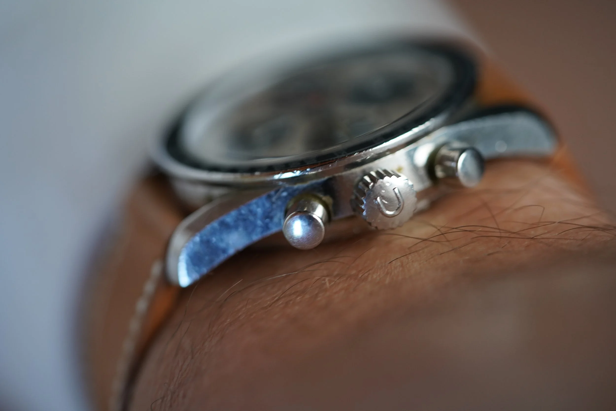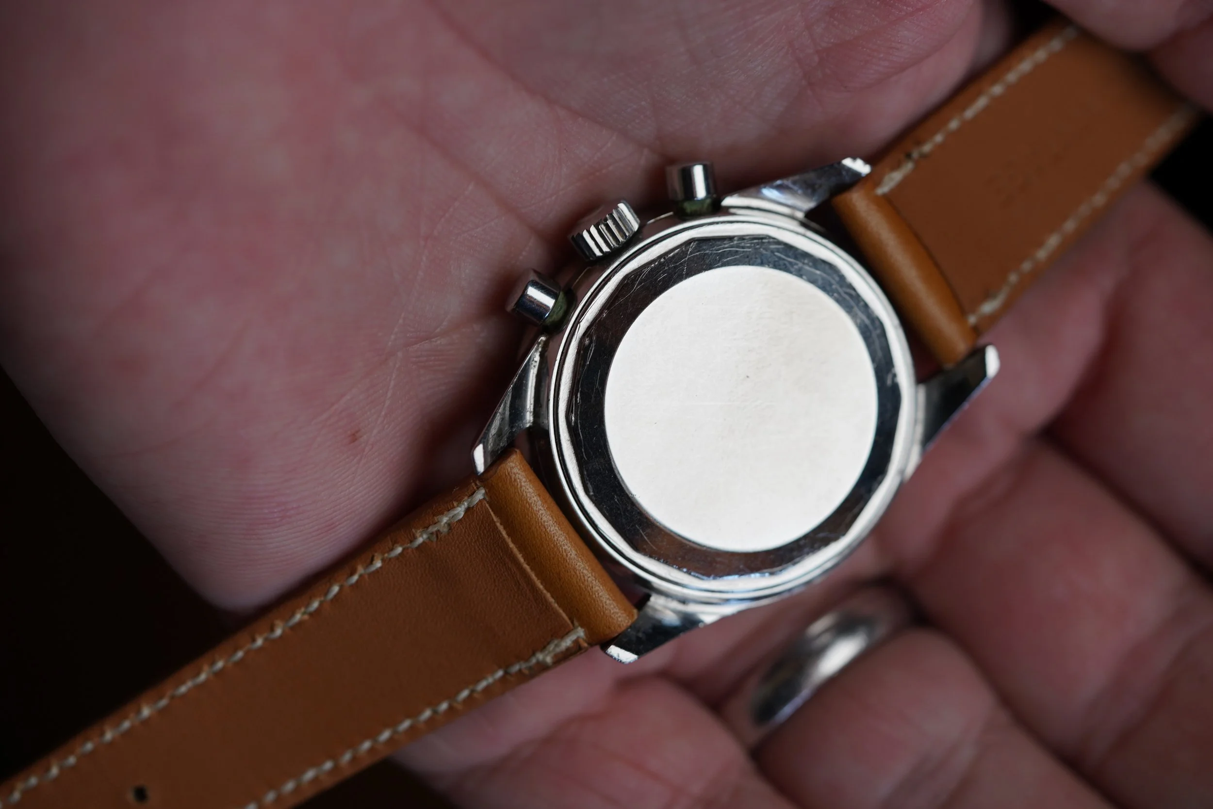 This is a nice Universal Genève Tri-Compax with Eric Clapton dial. Clapton wore a similar model when he was part of Cream and the watch now has the moniker “Eric Clapton” in the watch community. The watch dates to the mid-late 1960s. The case has been lightly polished. The case reference and serial have been lost from the polishing, so it is not clear whether the dial was is correct for this model. The watch measures 36mm in diameter. It is powered by the calibre 281.