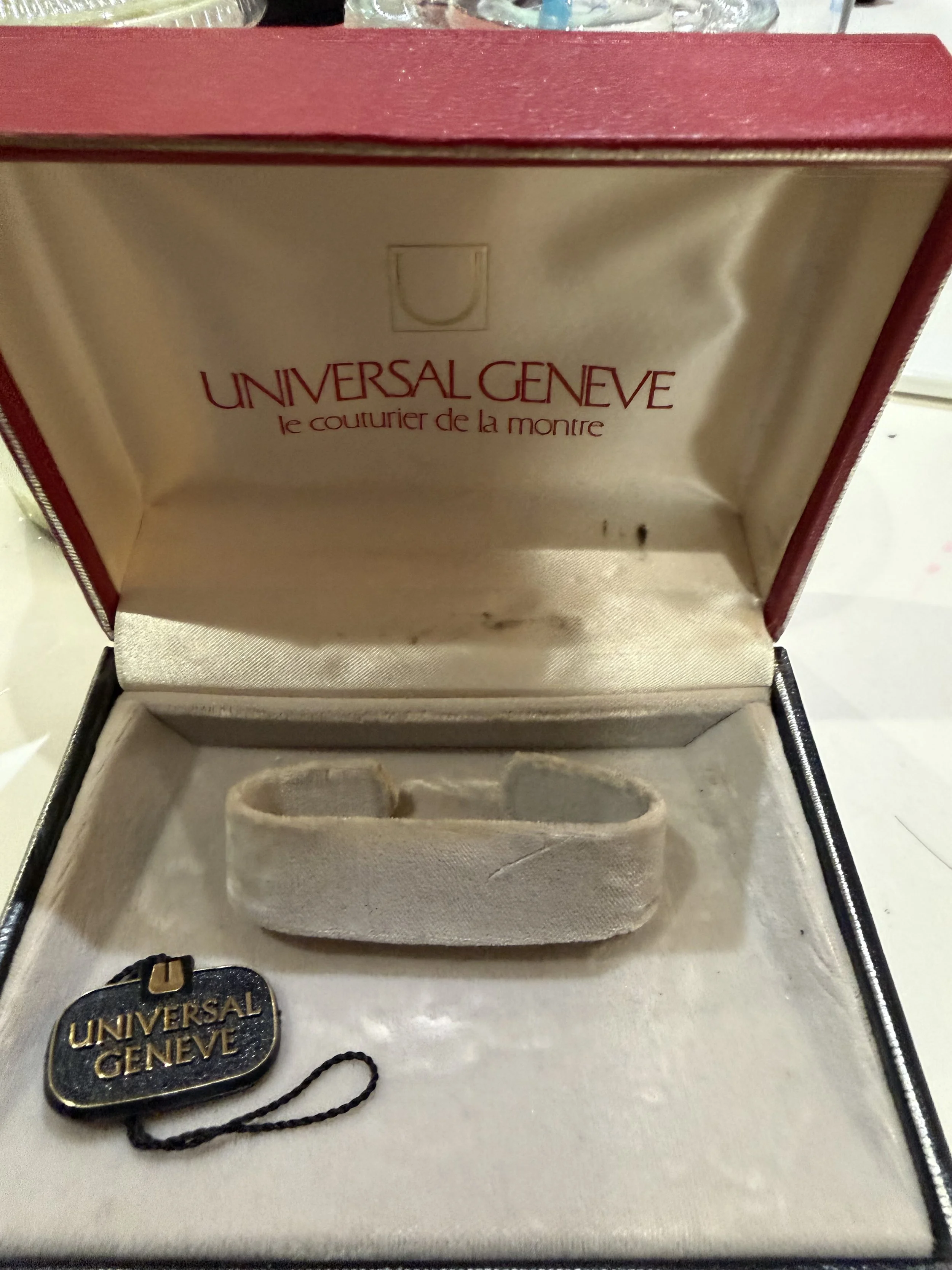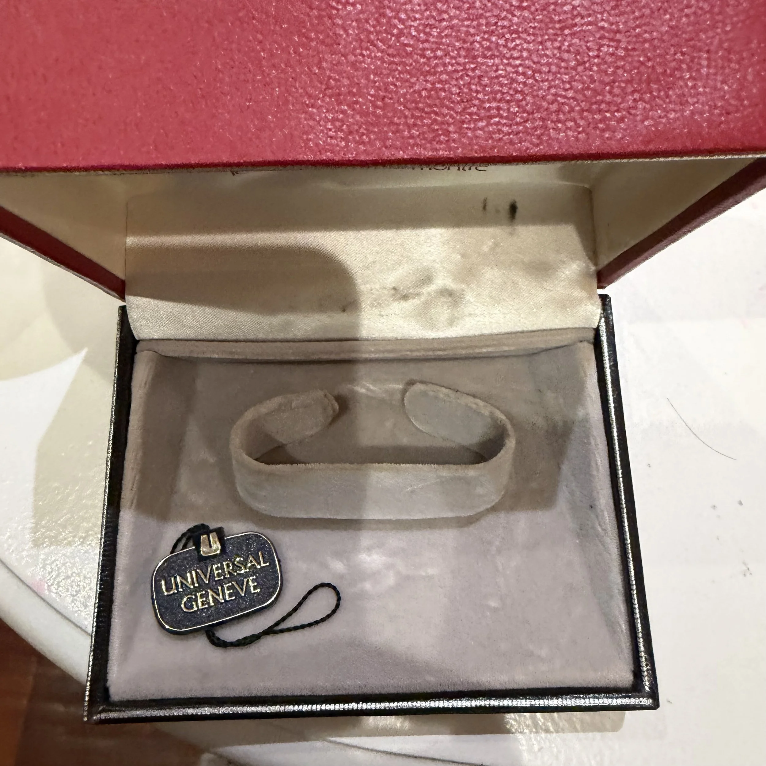 The watch does not come with papers. It does come with a Universal Genève box and hangtag. We do not know the service history, but it is running well.