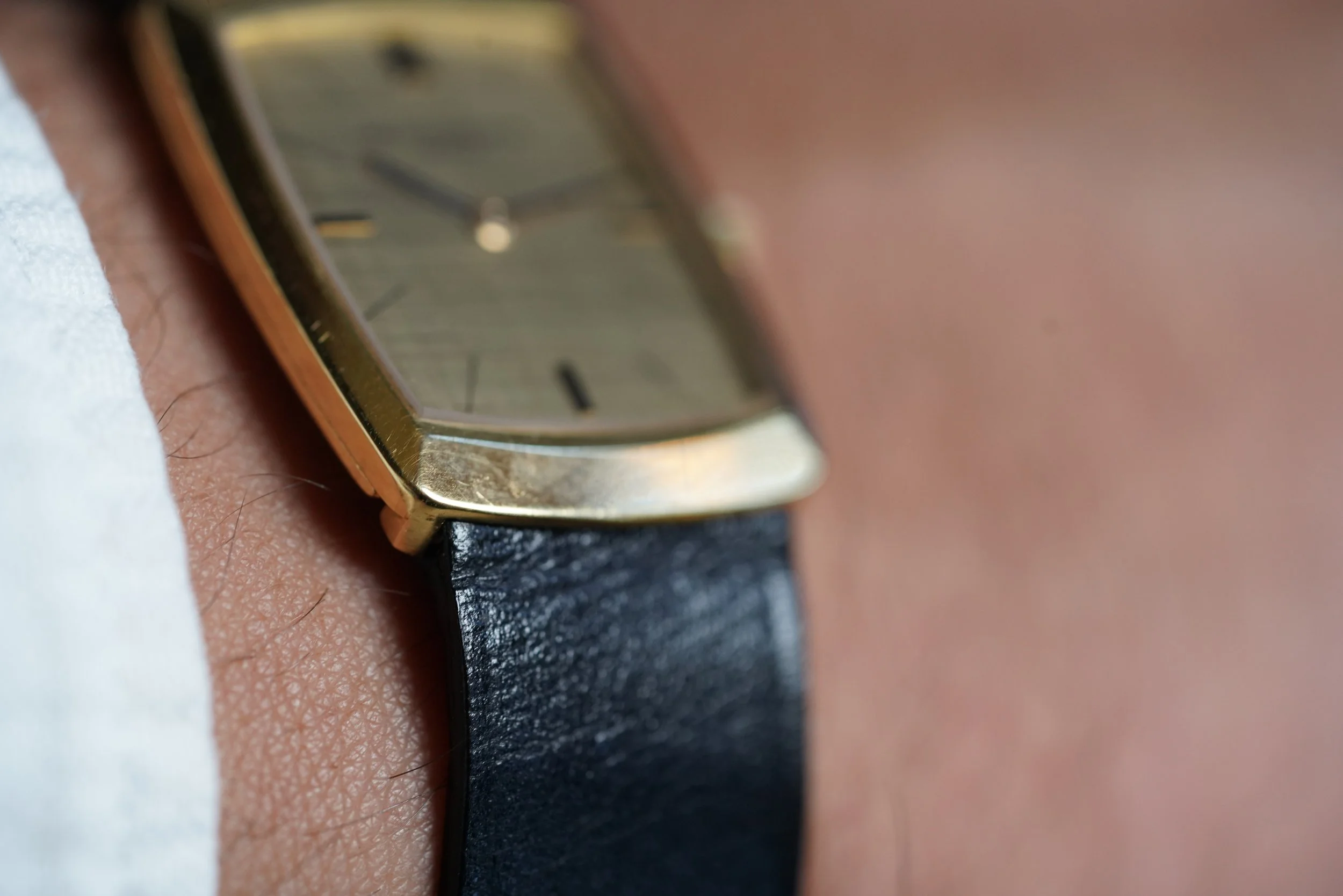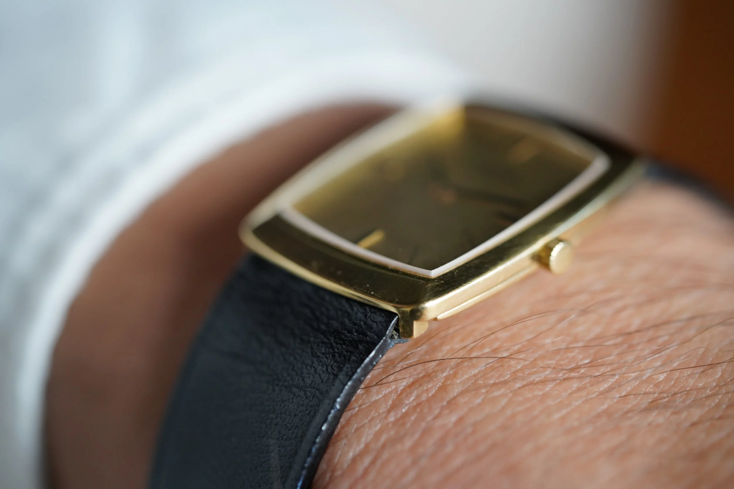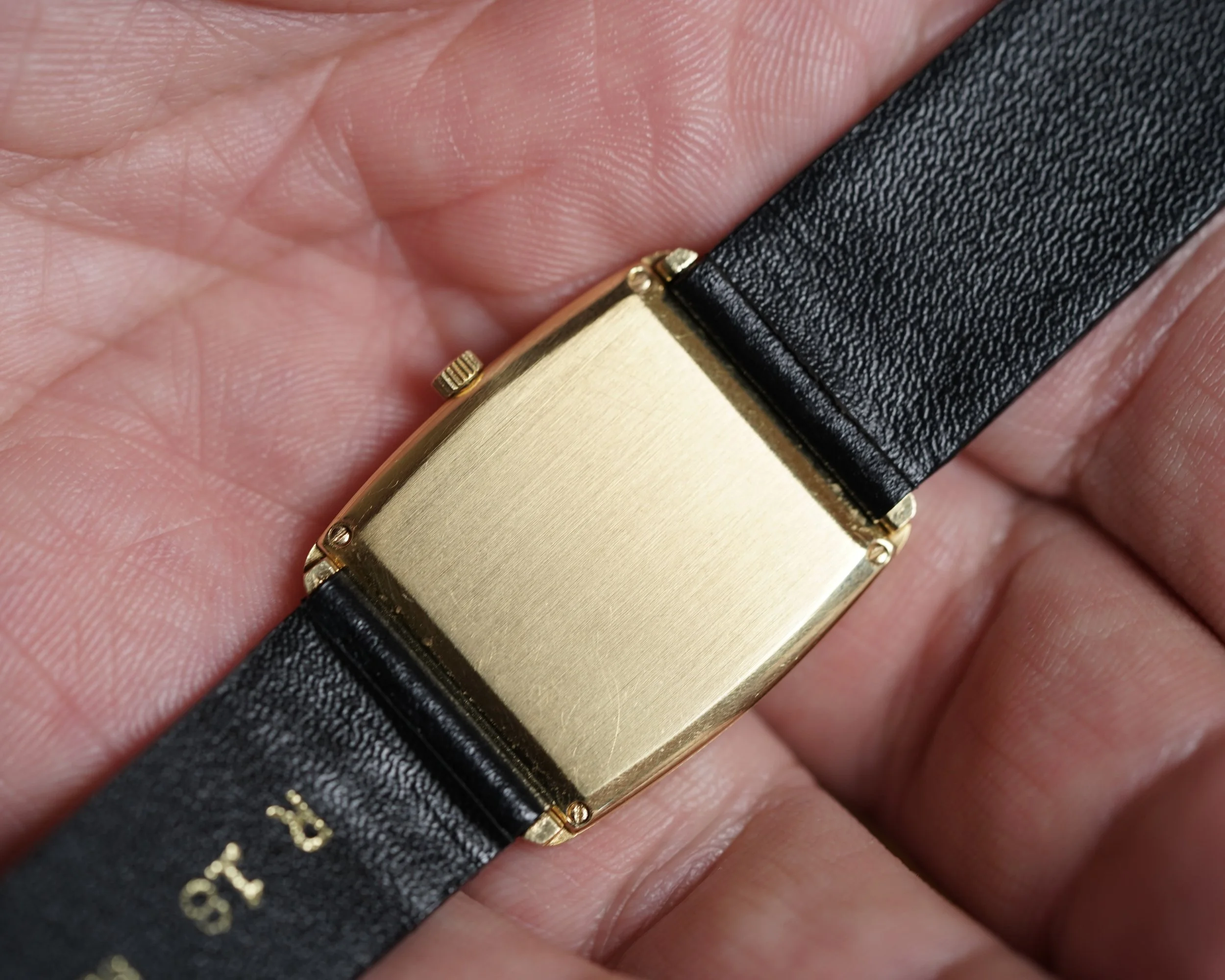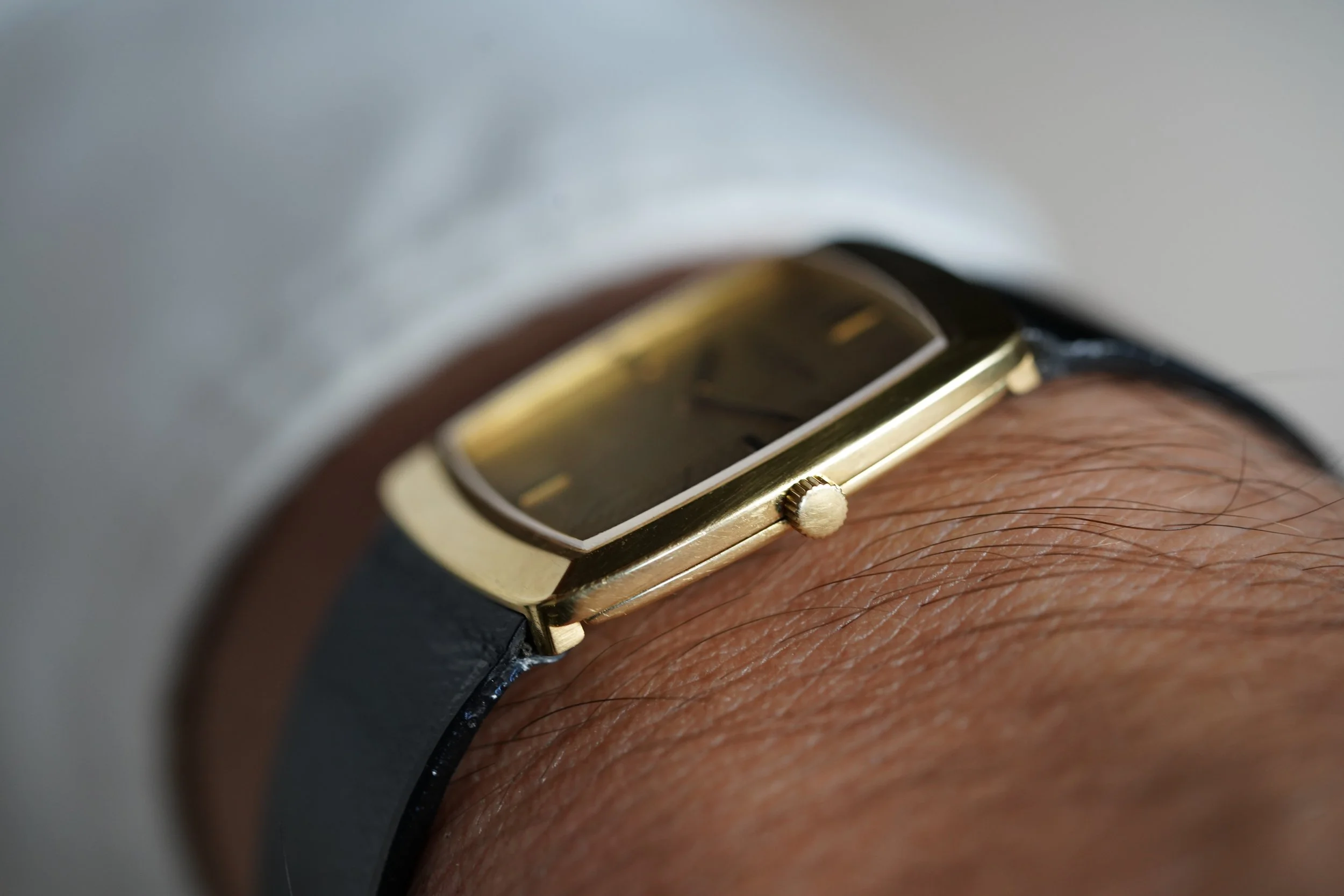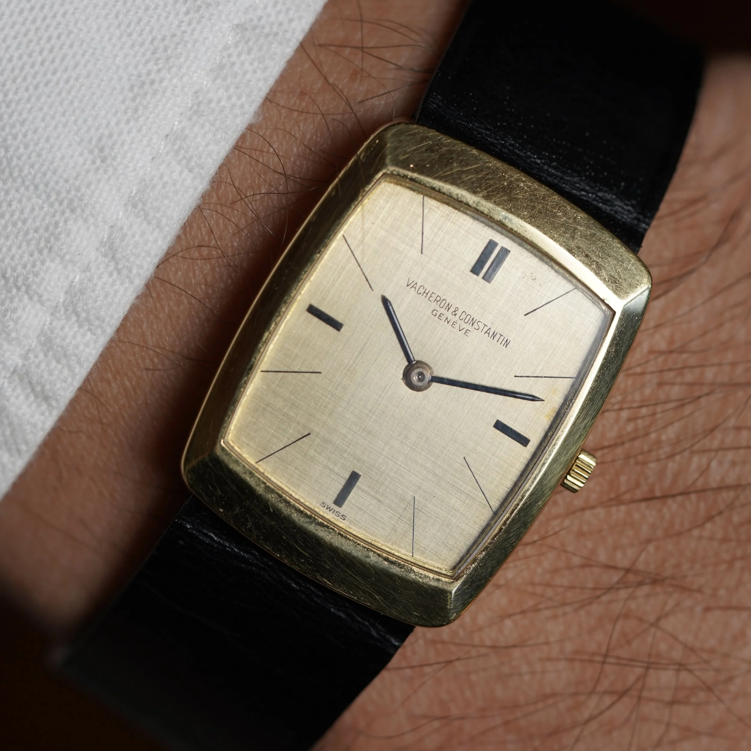 This Vacheron & Constantin Model 97342 is a very sophisticated timepiece in 18k yellow gold. The case measures 24mm in diameter and 31mm in length. The case is possibly unpolished. It dates to the late 1960s.