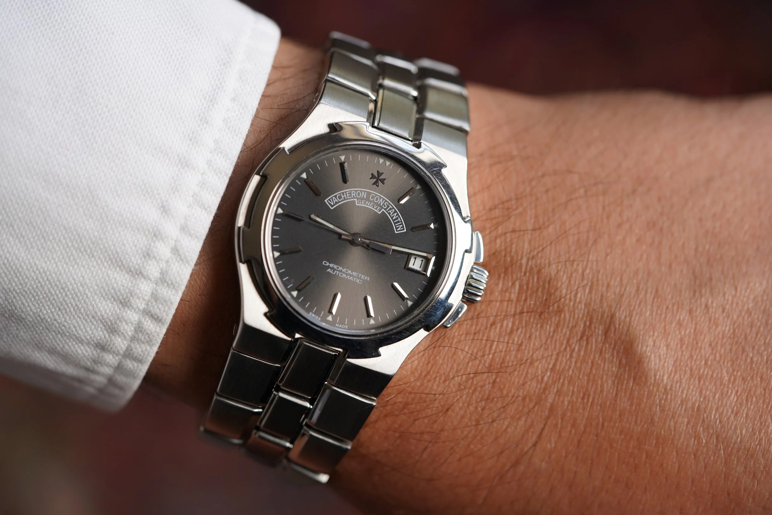 This Vacheron Constantin Overseas is a very cool watch with a great design. The case is strong. We believe it has been lightly polished. It measures 37mm in diameter (43mm lug-to-lug). It is powered by the calibre 1310. We do not know the year of production.