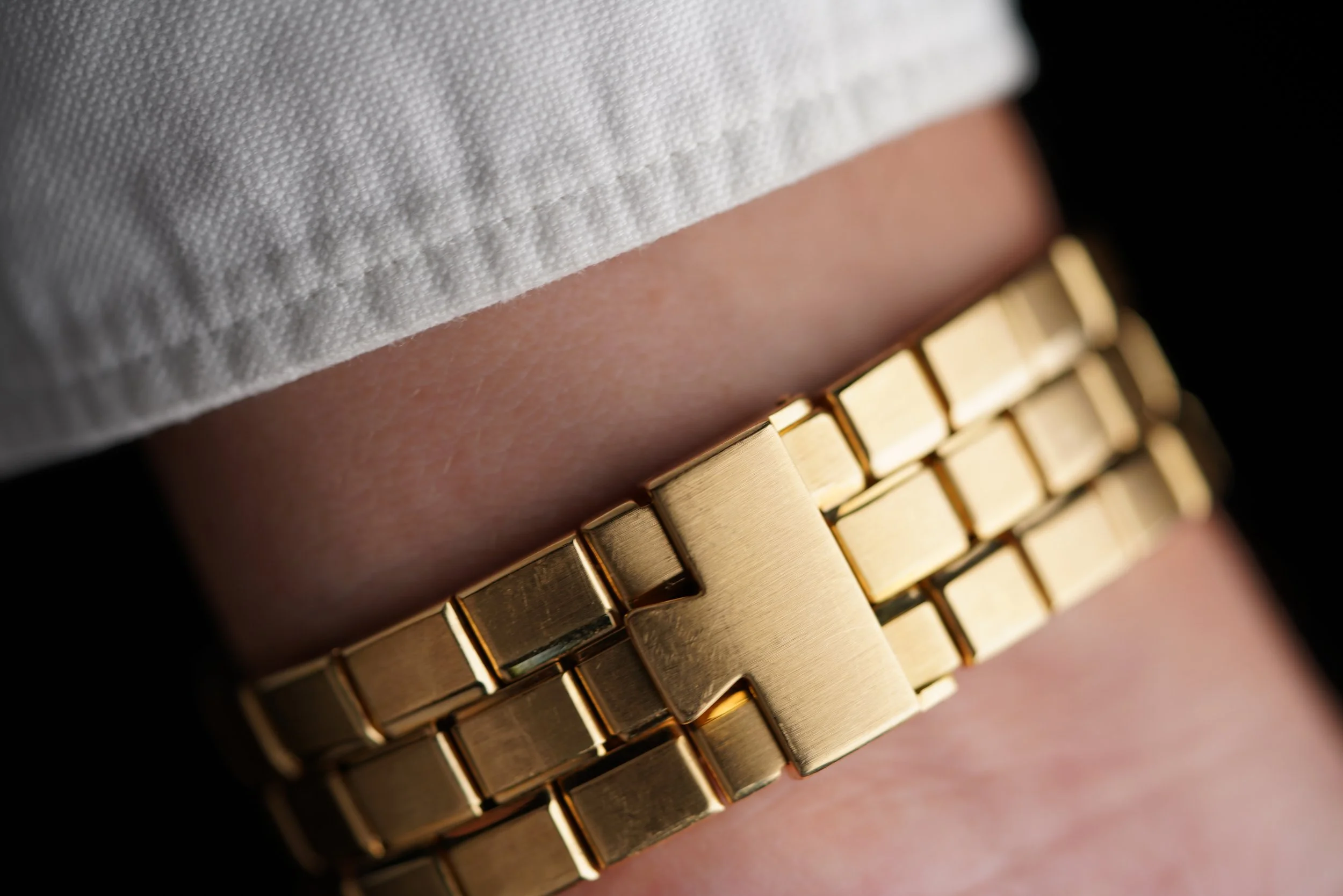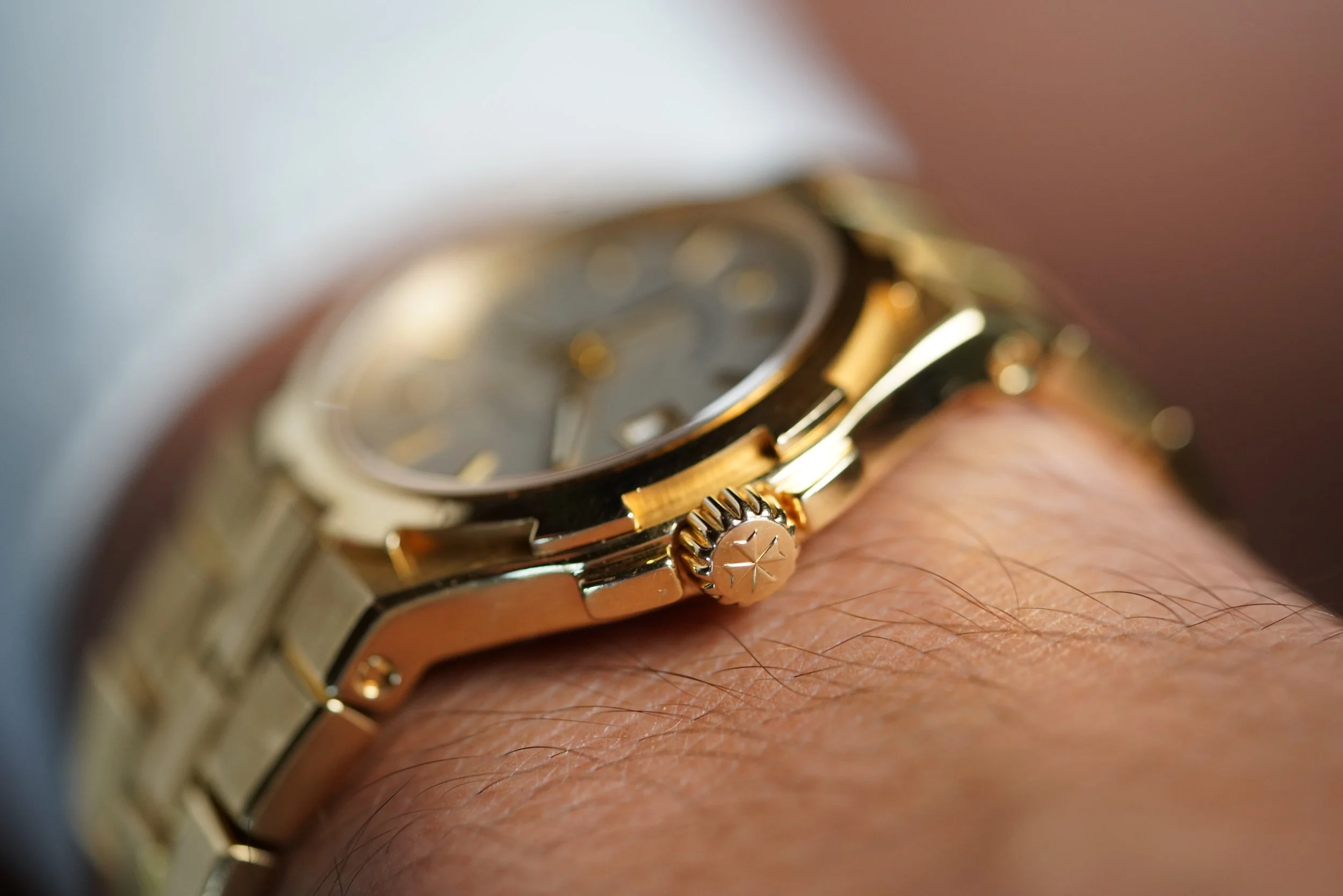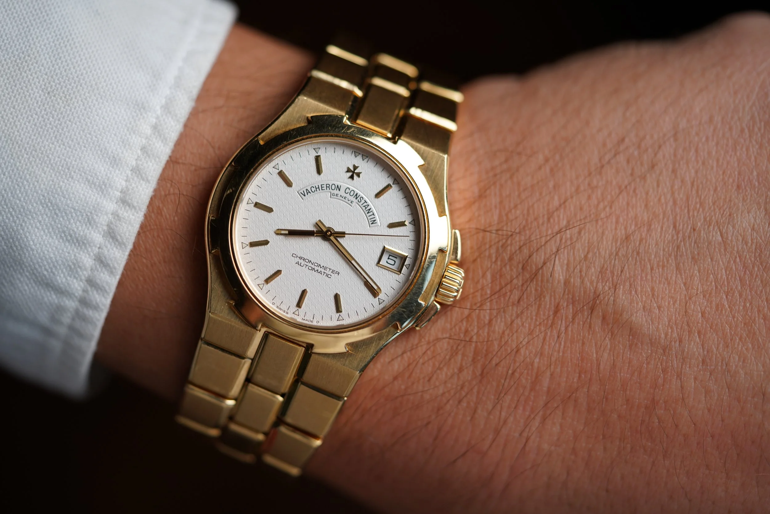 This Vacheron Constantin is the younger sibling of the integrated sports model, reference 222. The yellow gold case measures approximately 36.5mm in diameter. The watch was originally sold in 2002. The 18k yellow gold case appears to be unpolished.